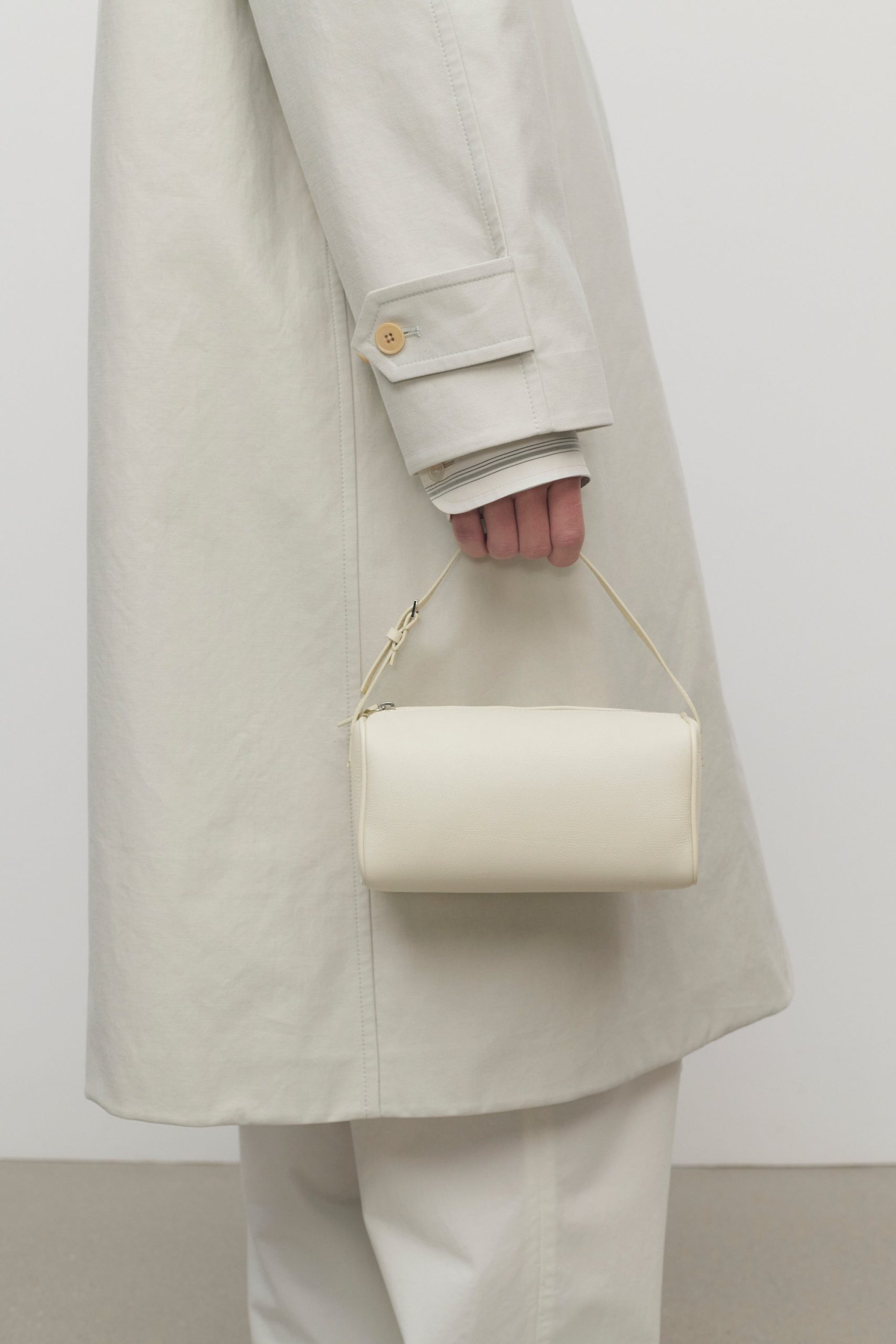 Top handle bag in finely grained calfskin leather with softly rounded edges. leather piping. and adjustable slim leather strap. The natural grain surface is soft to the touch with a velvety finish. giving the leather its refined. organic character.