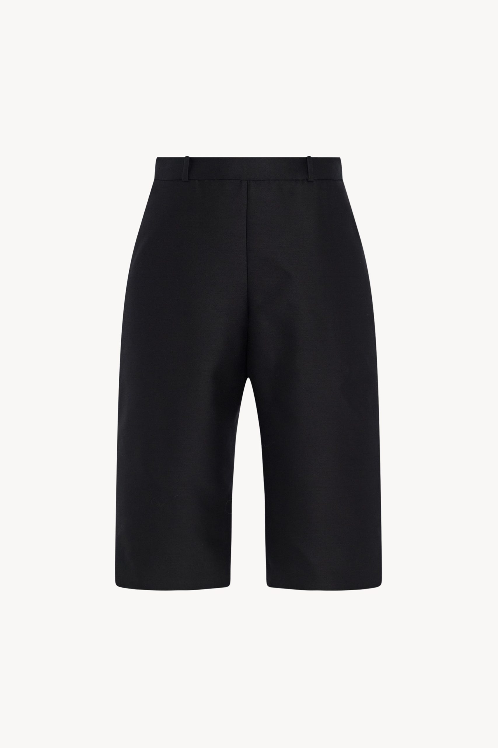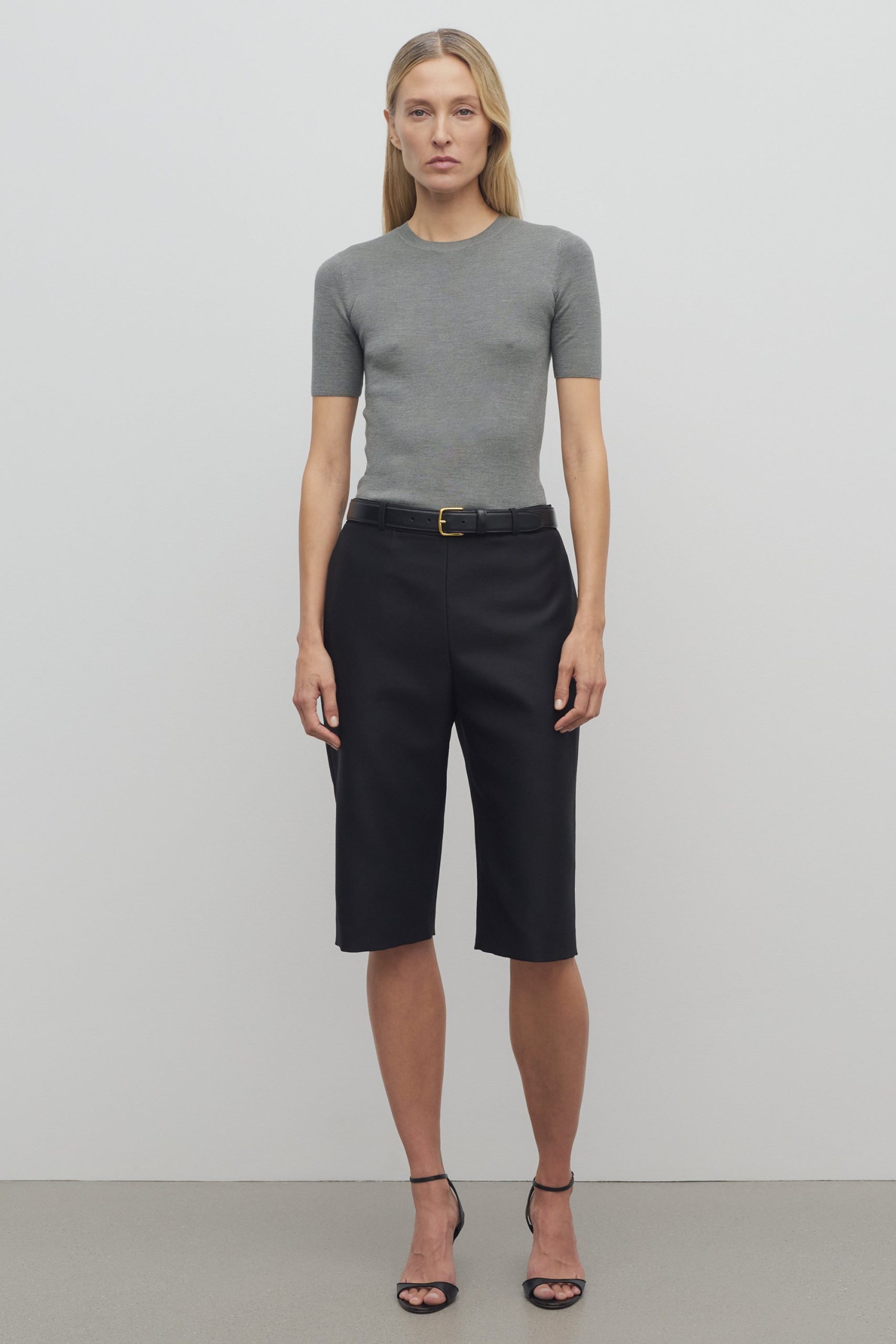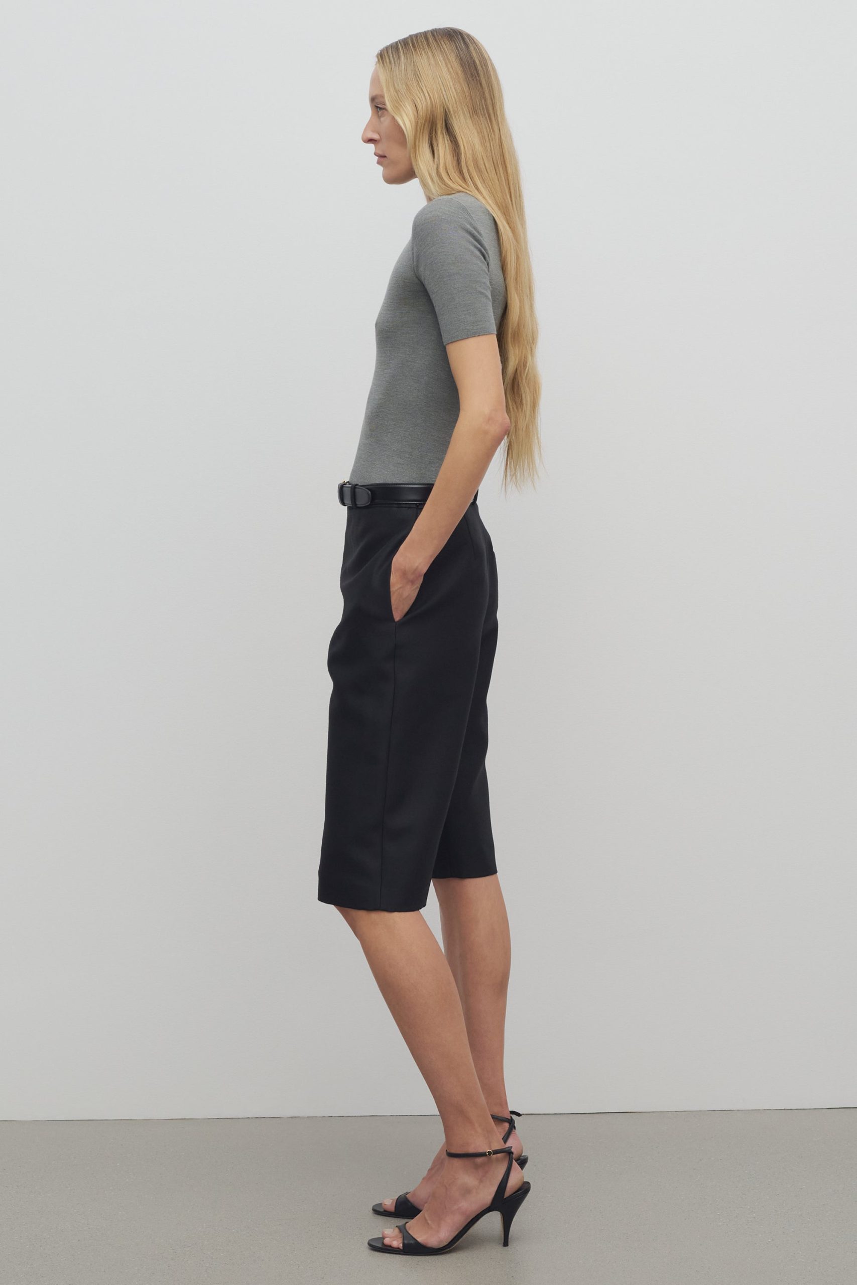 Tailored high-rise capri pant in lightweight wool and silk suiting with straight leg. side seam pockets. and side zip closure.