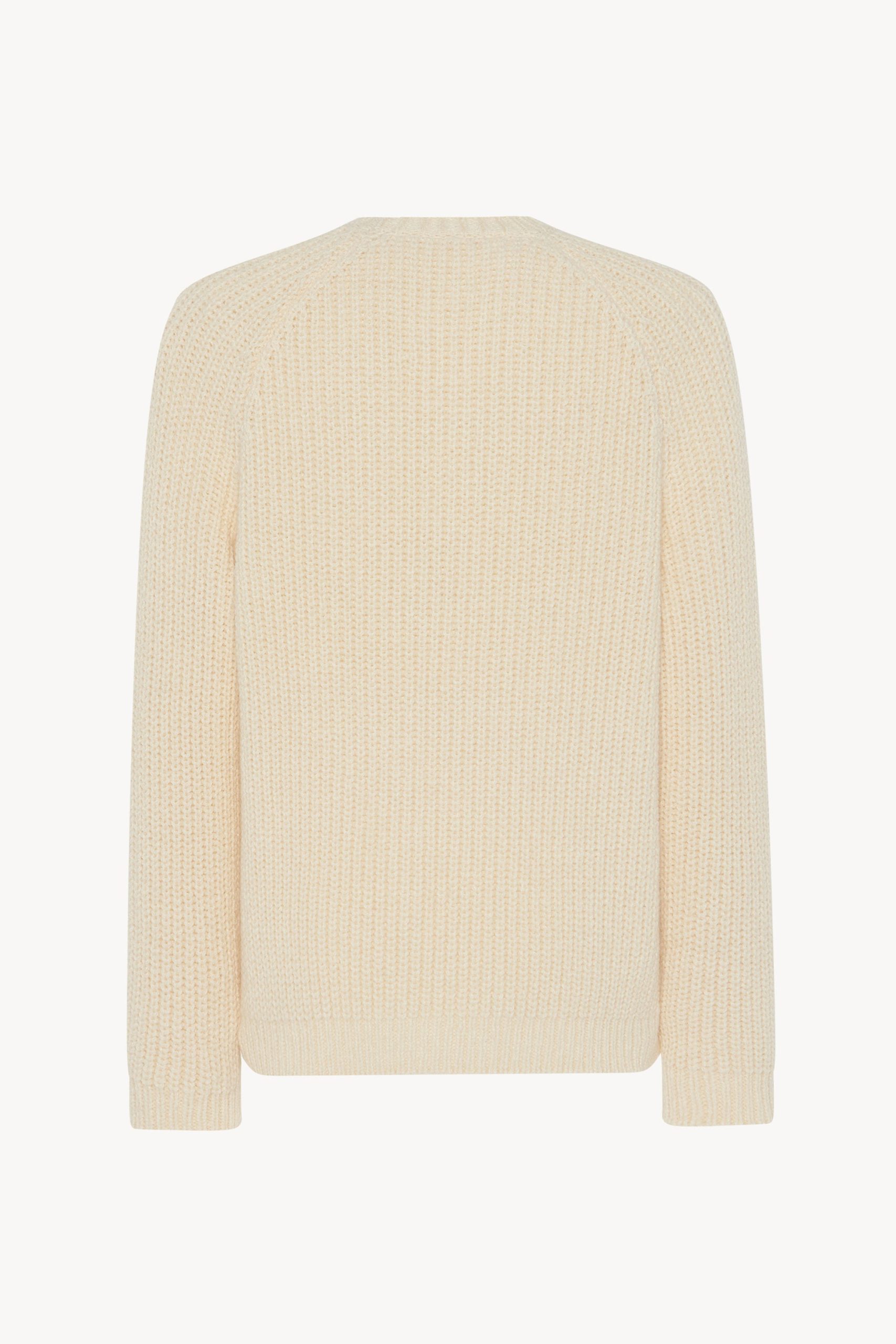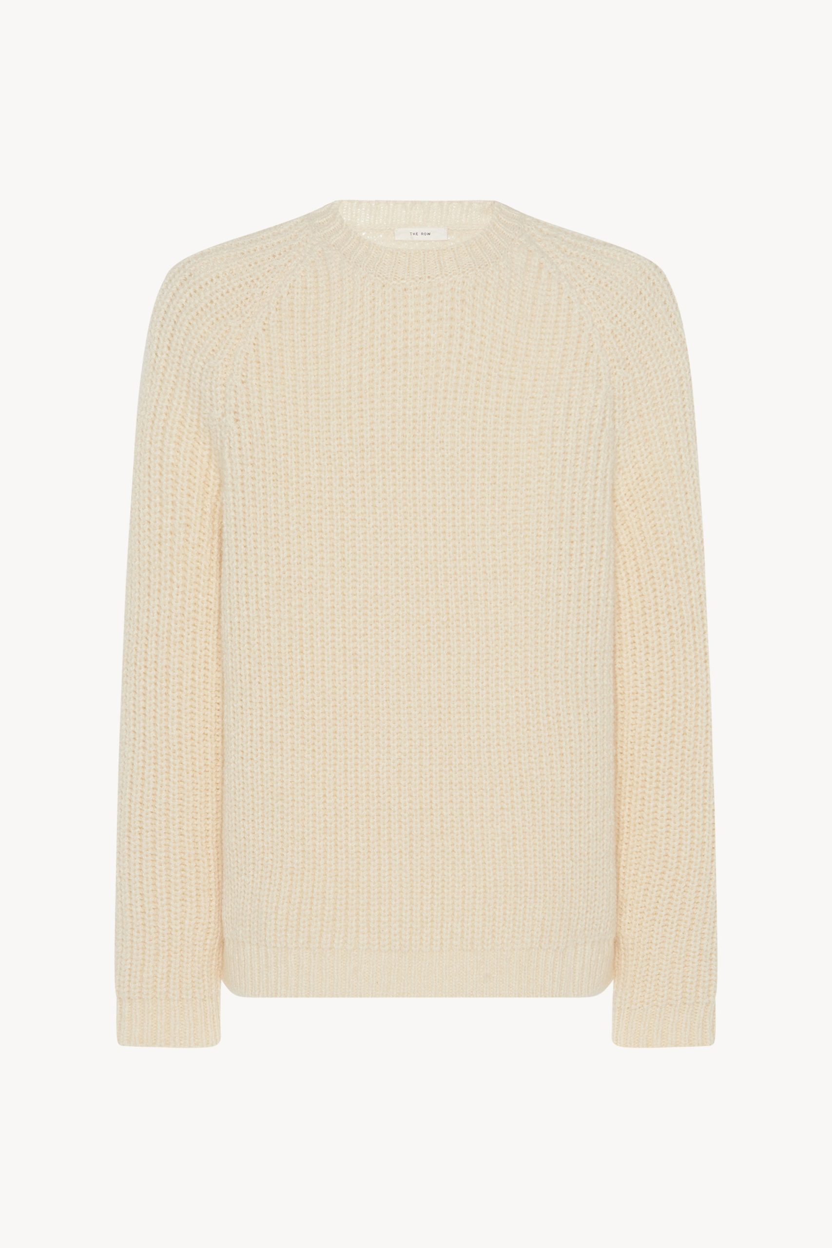 Long-sleeved crewneck sweater in textured mohair and silk knit with raglan sleeves. ribbed neckline. cuffs. and hem. and relaxed fit.