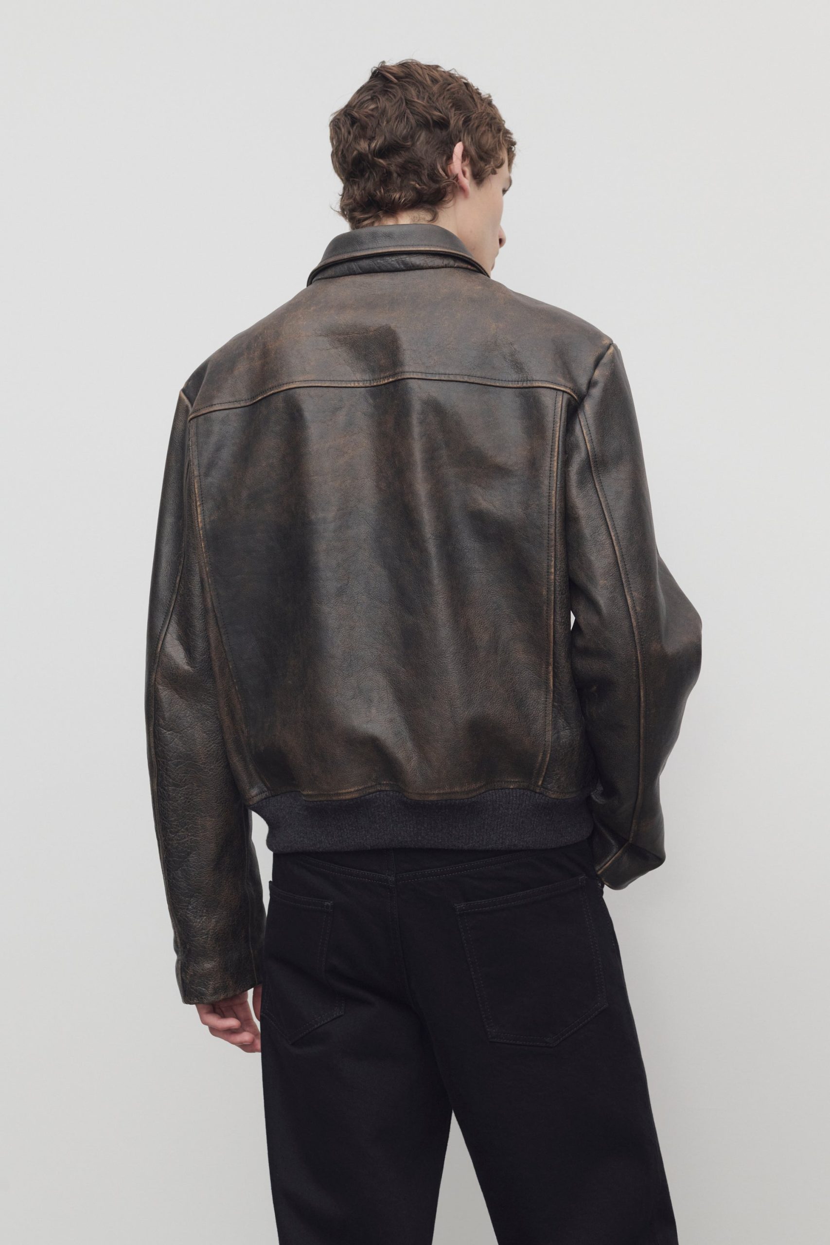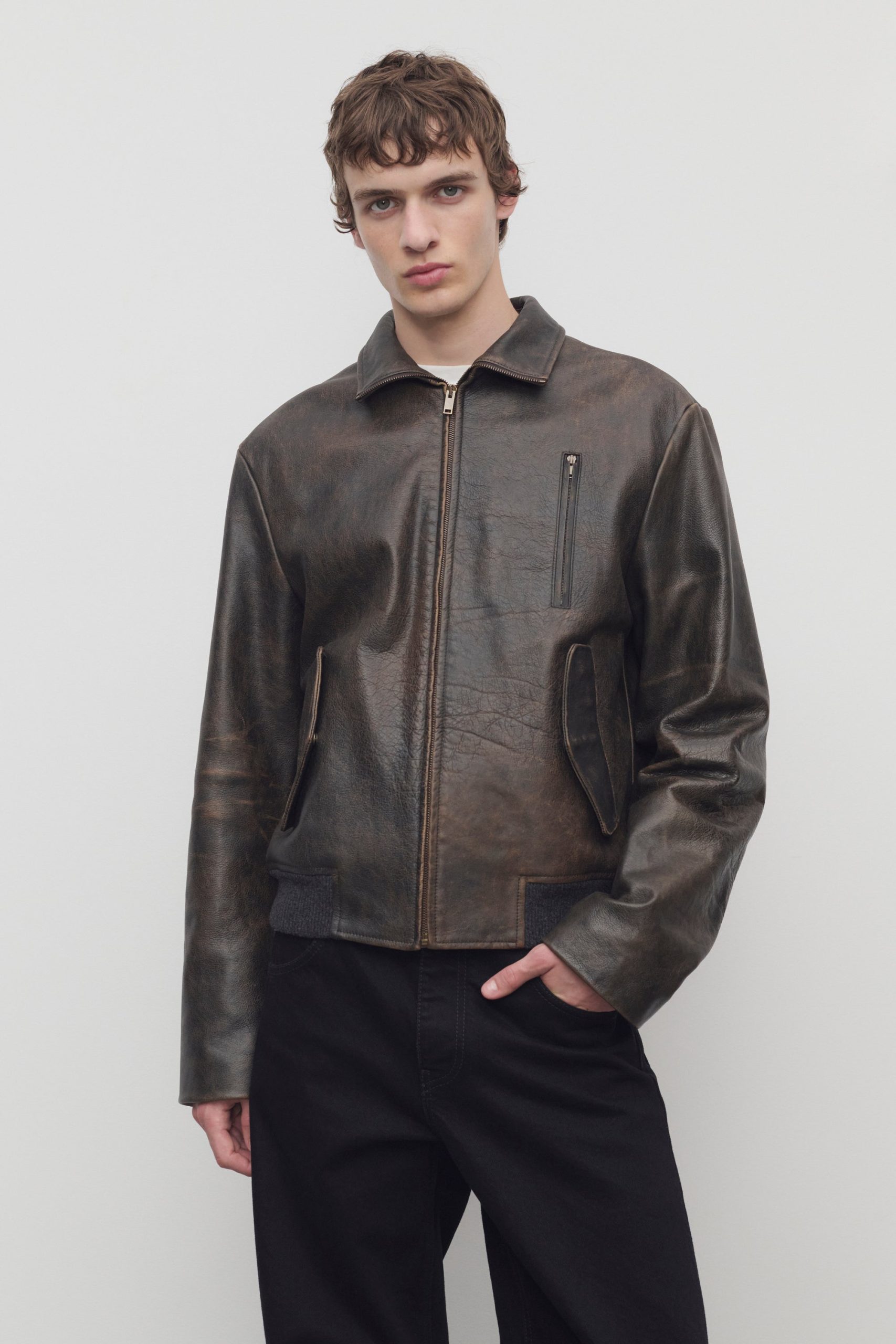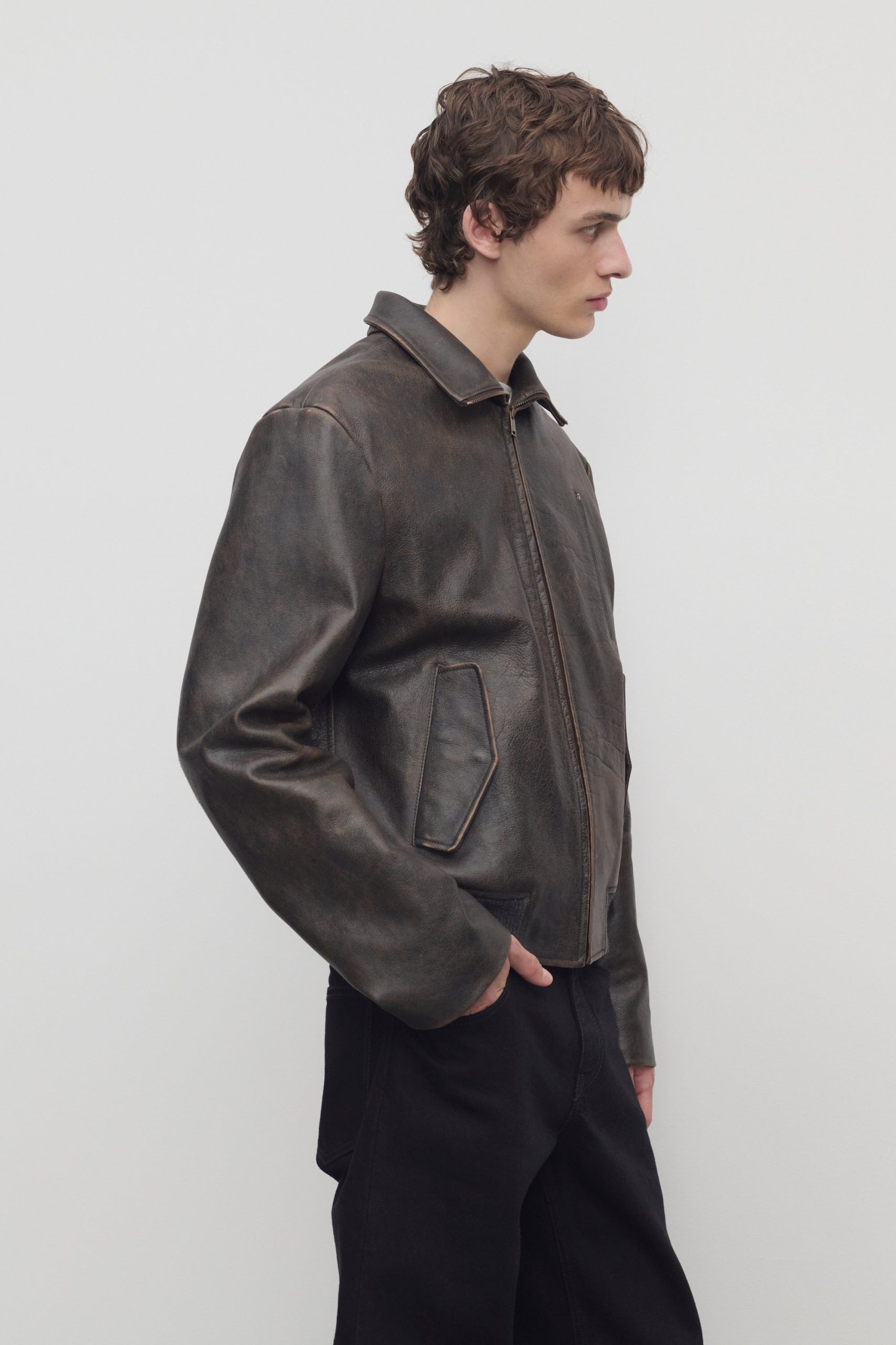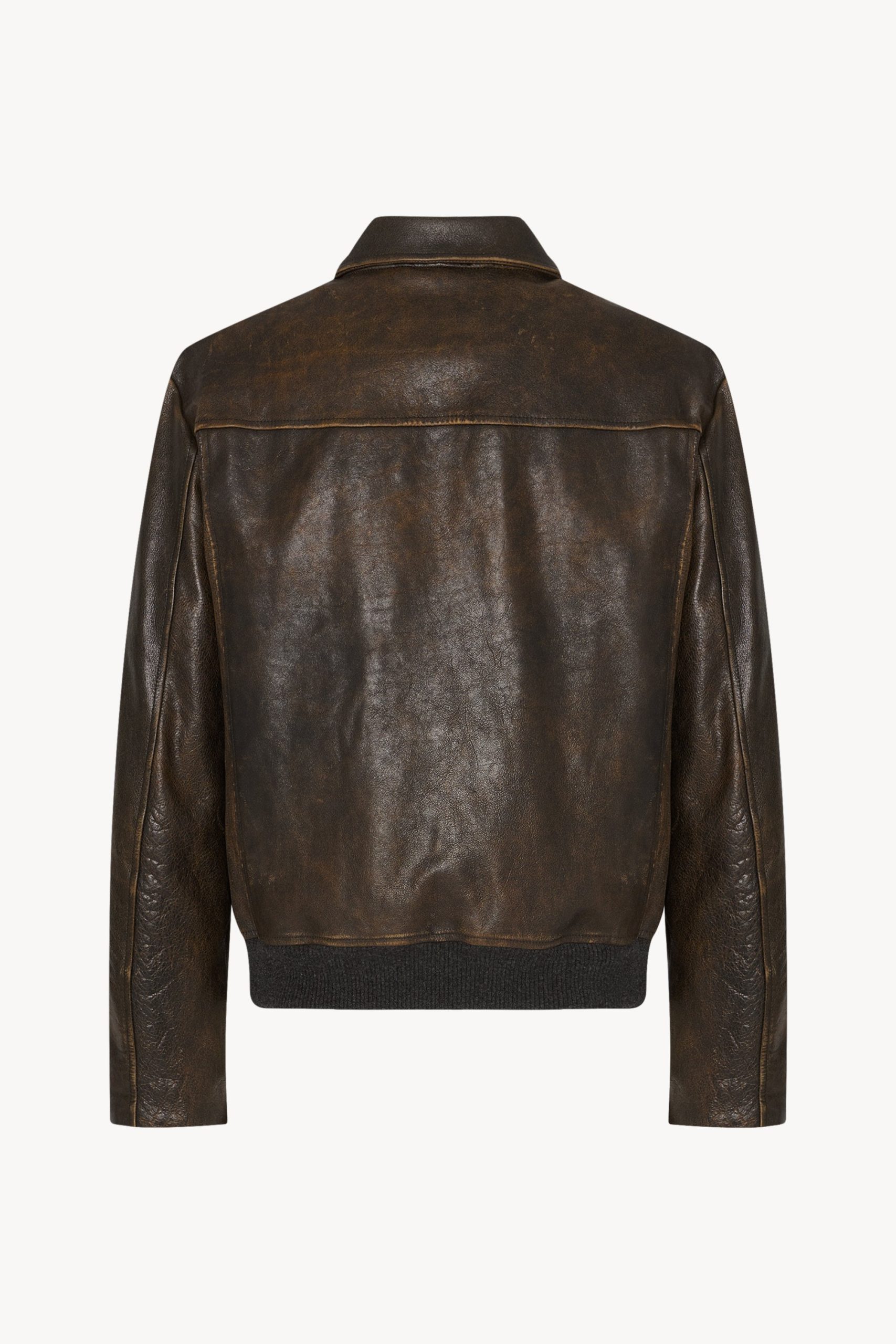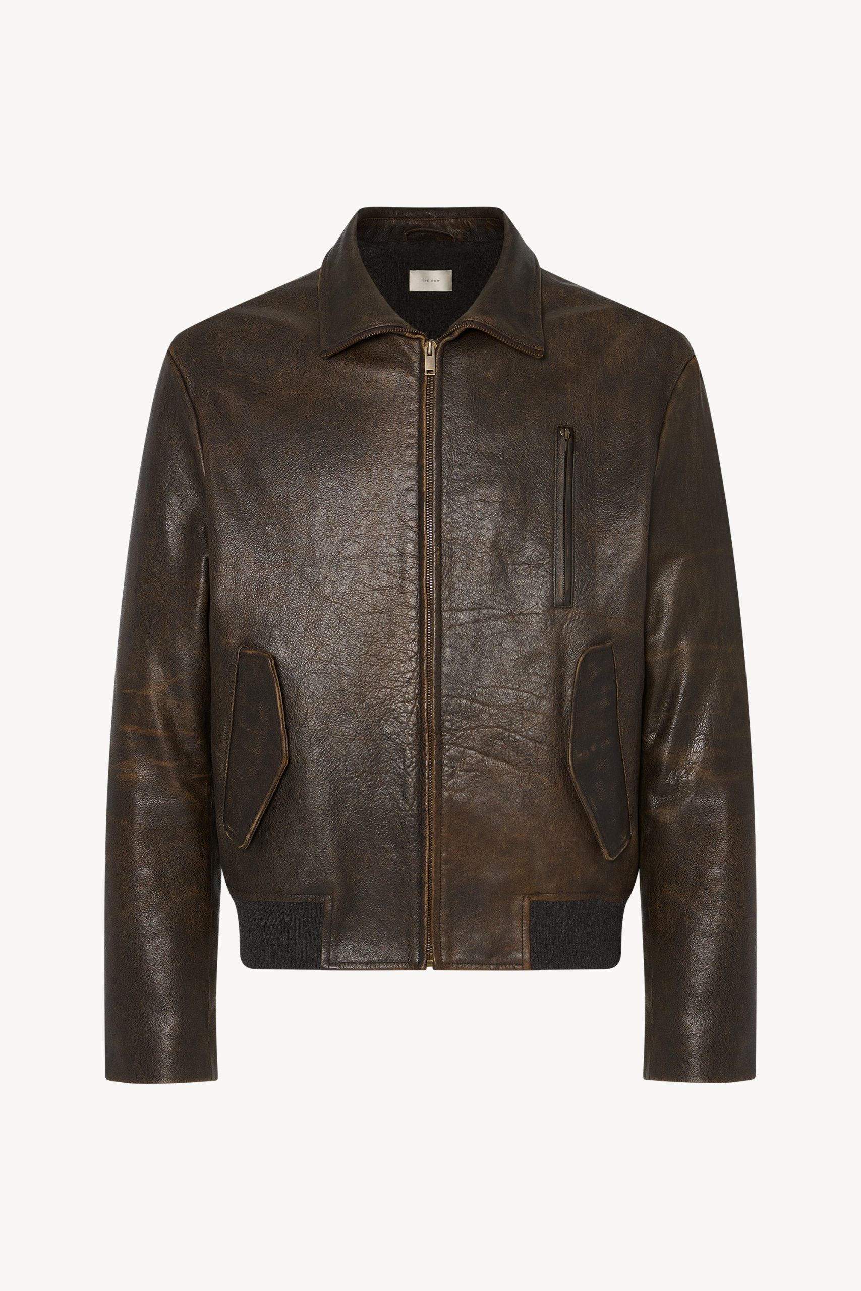 Collared motorcycle jacket in durable calfskin leather with ribbed hem. front flap pockets. and extended front zipper closure.