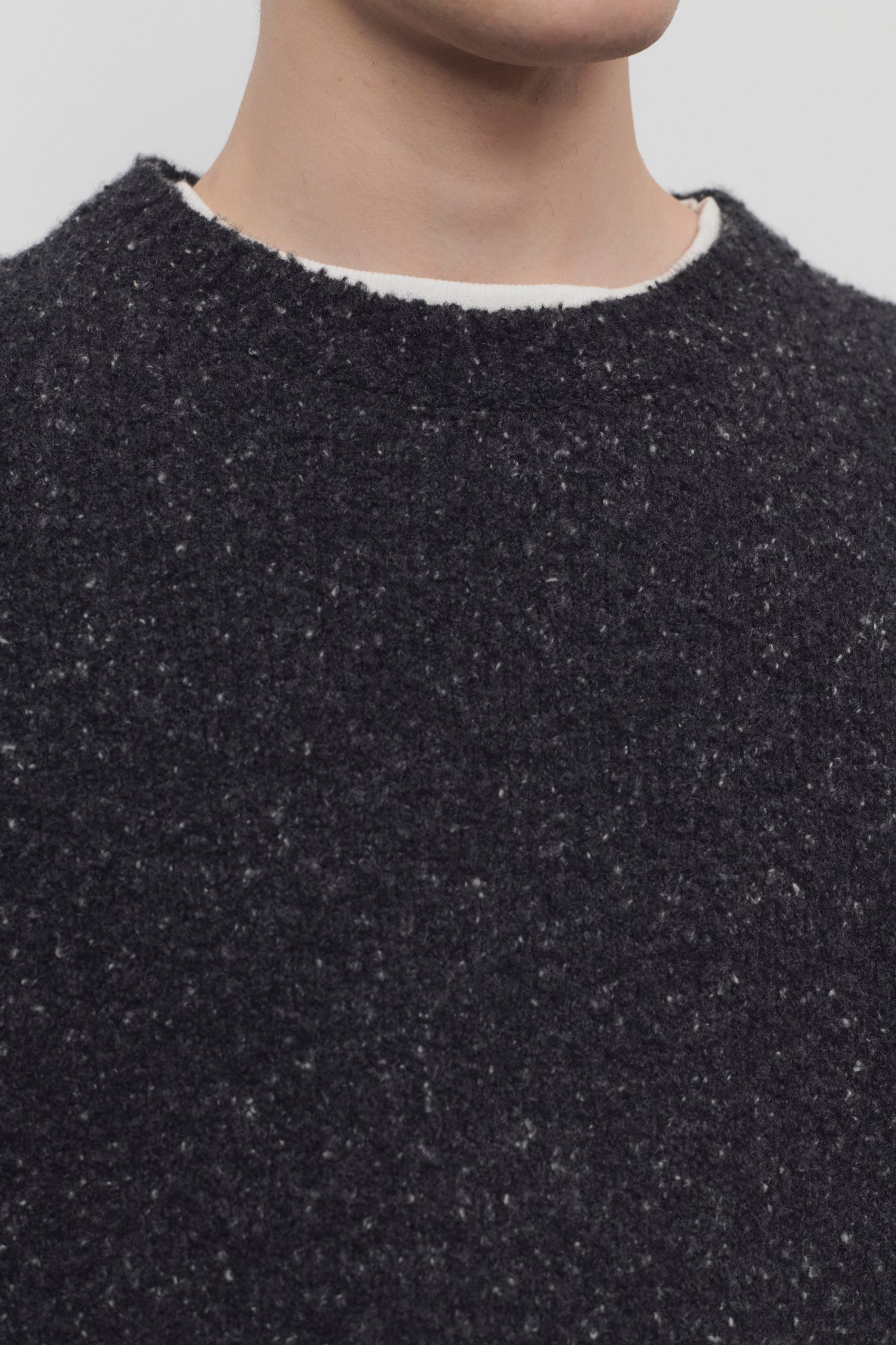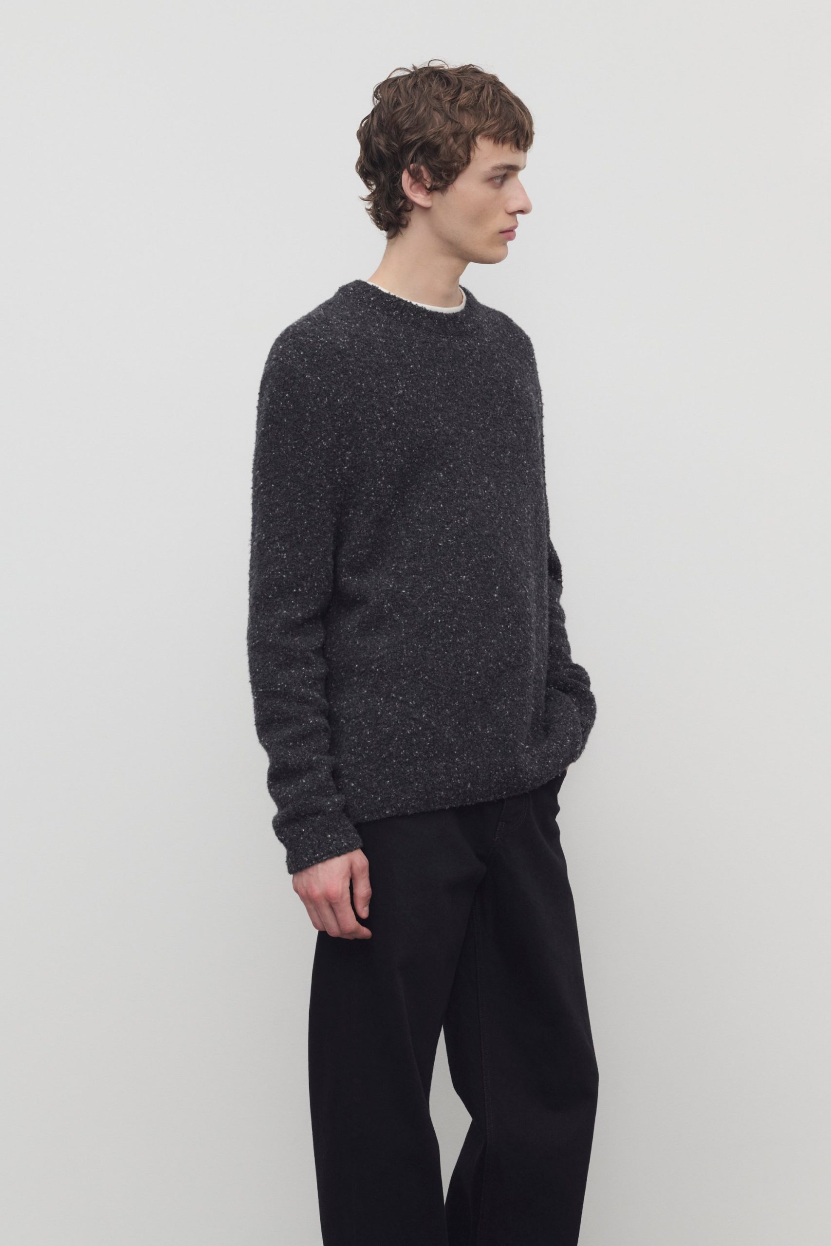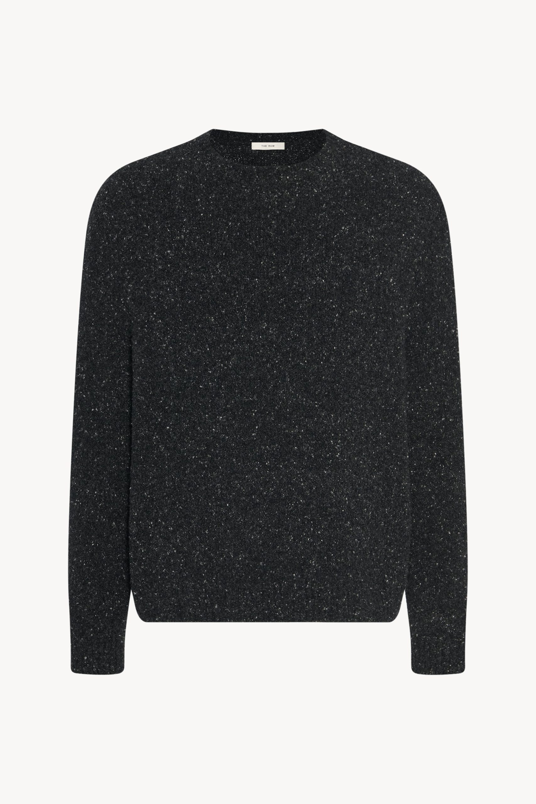 Classic crewneck sweater in flecked midweight cashmere with relaxed fit and ribbed neckline. cuffs. and hem.