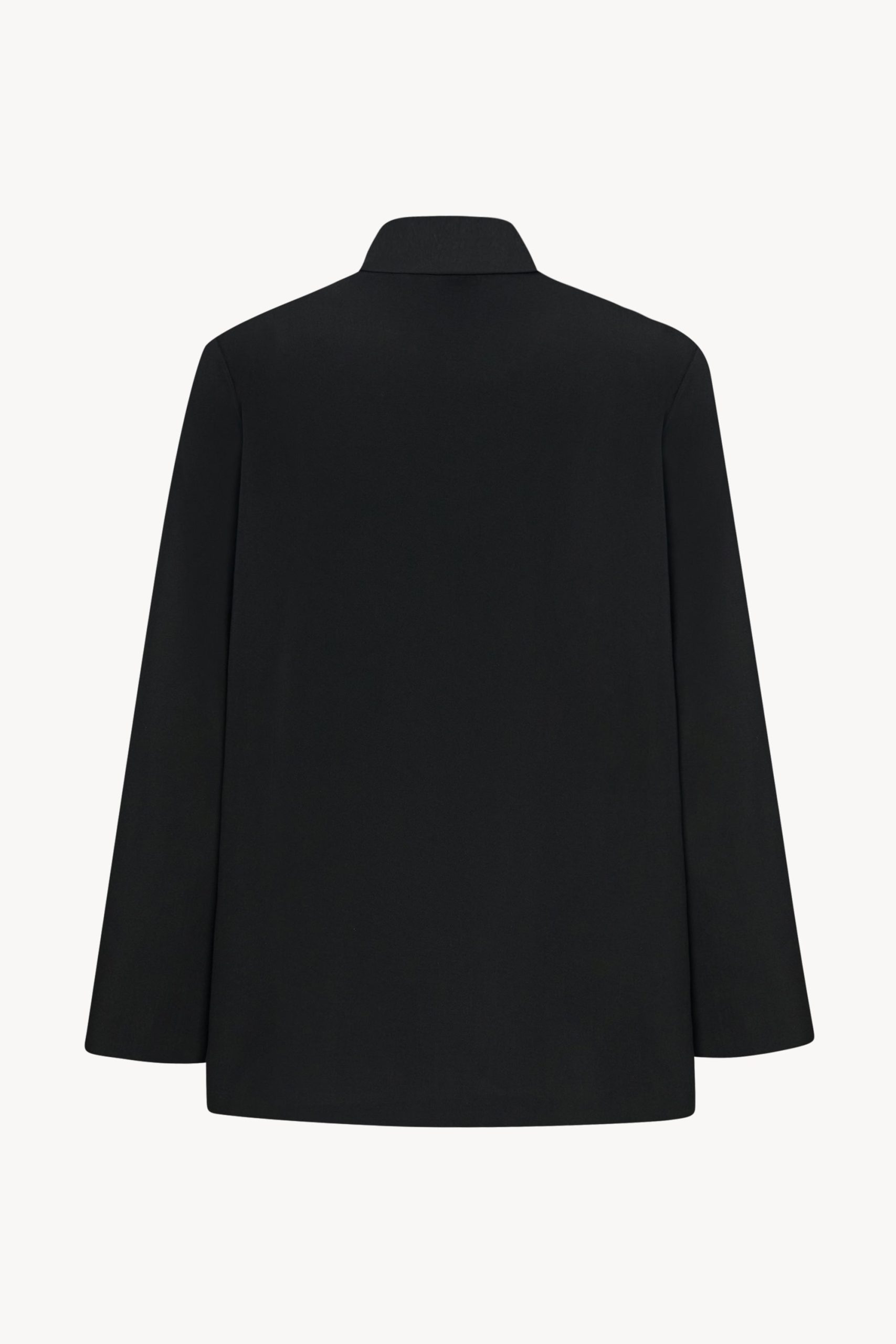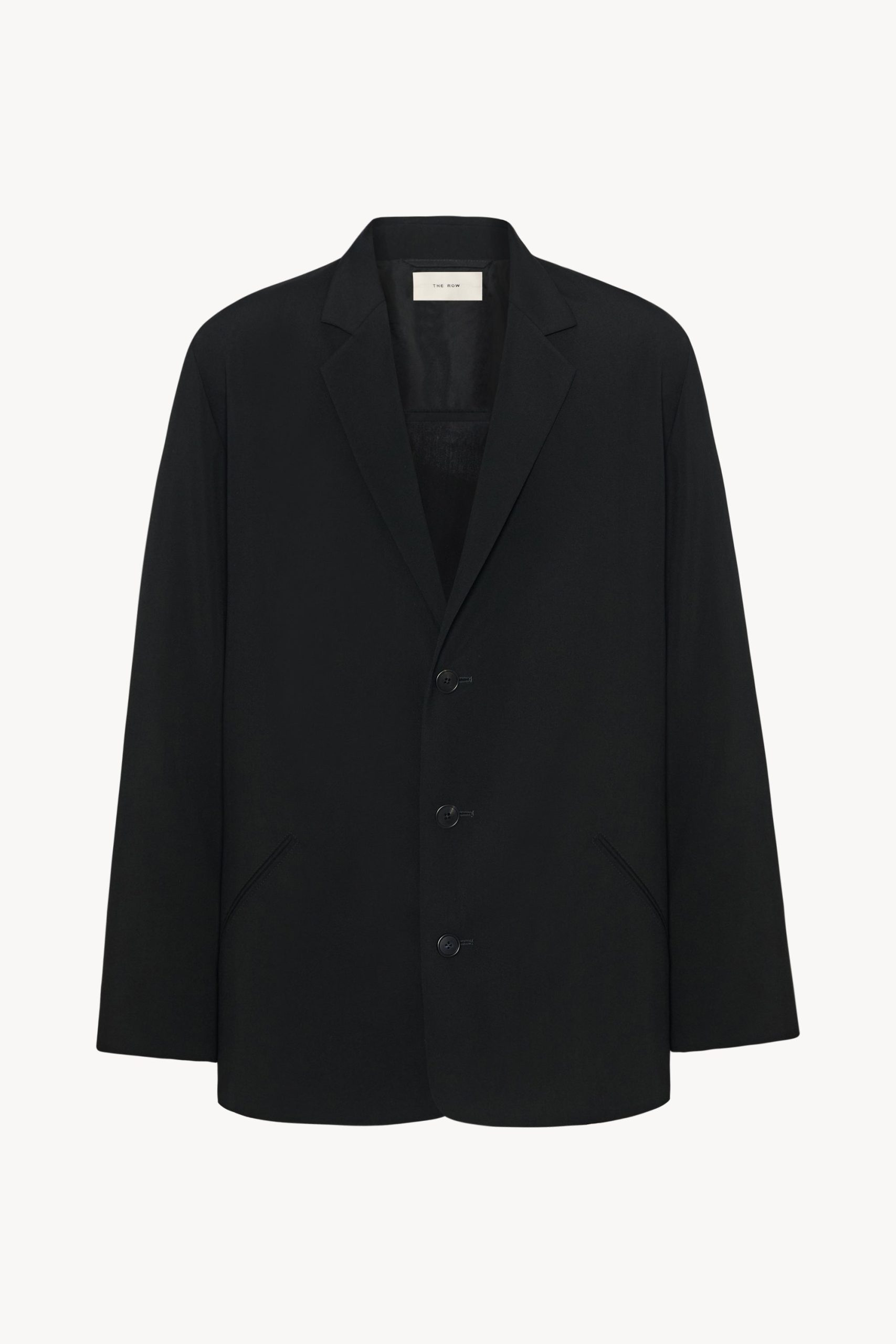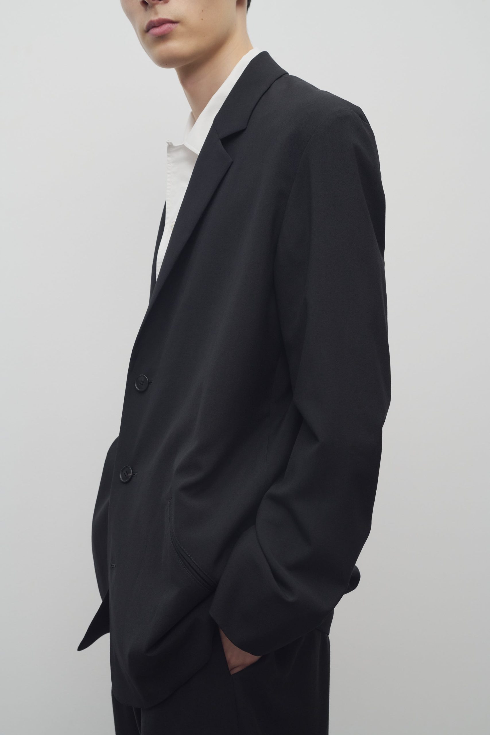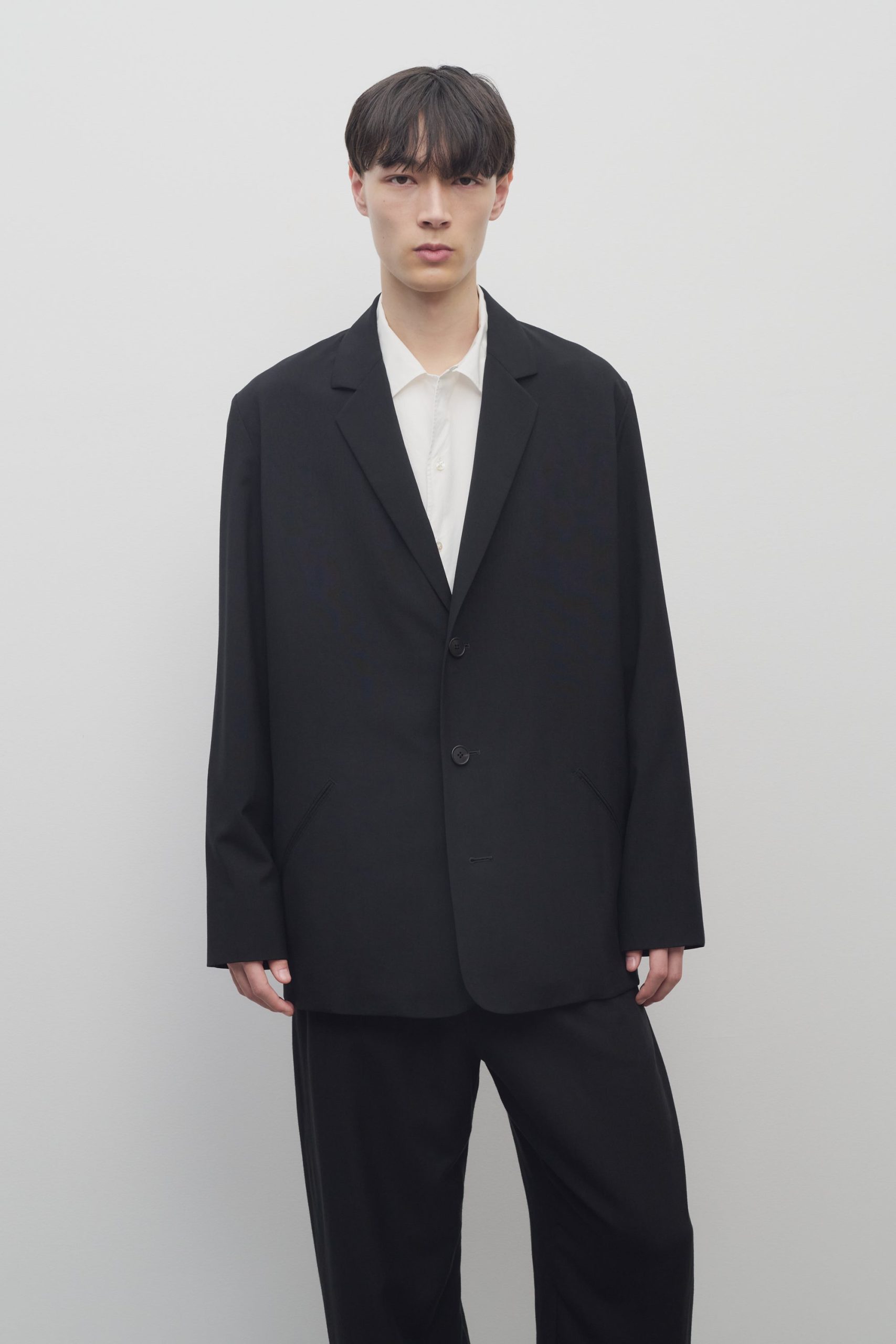 Single-breasted tailored jacket in crisp tropical wool with notch lapels. front besom pockets. and horn button closure.