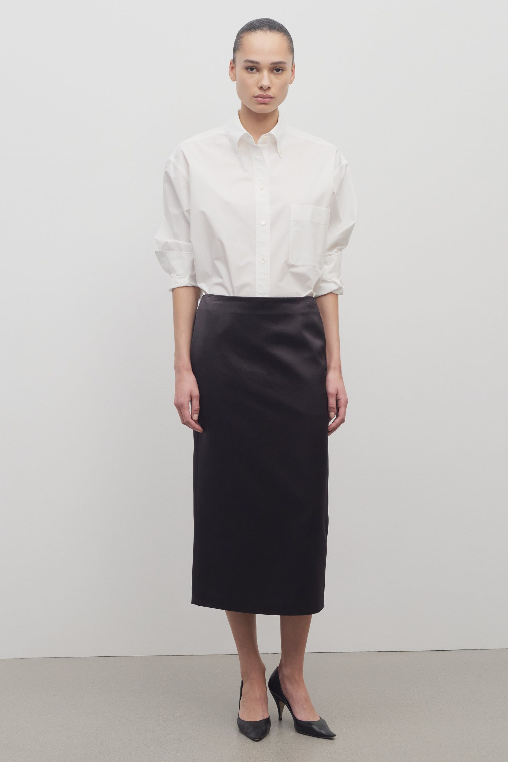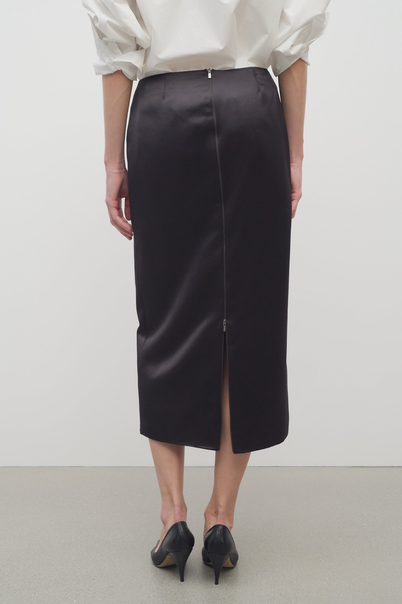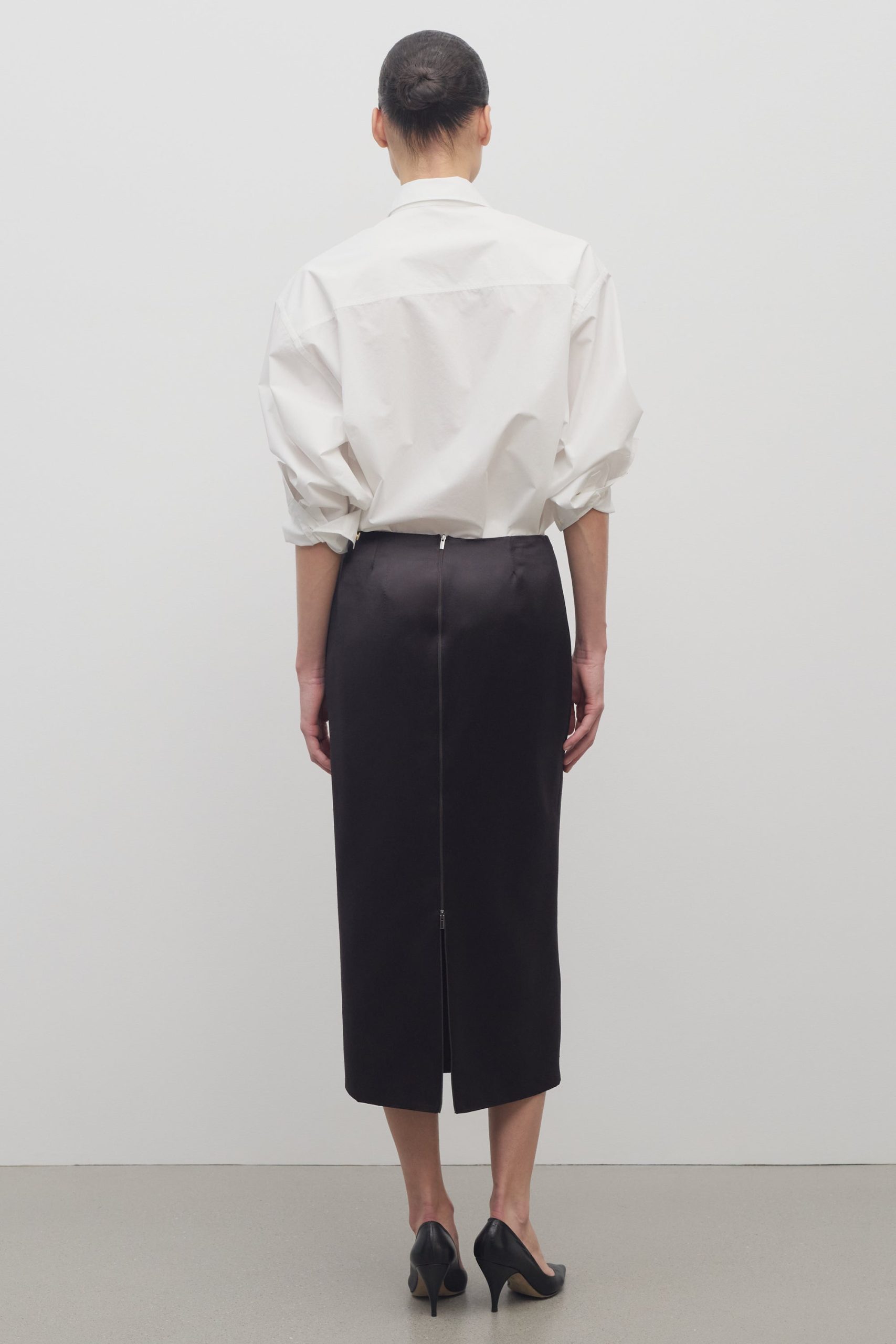 Calf-length pencil skirt in heavyweight silk satin with double-faced construction and zipped center back detail.