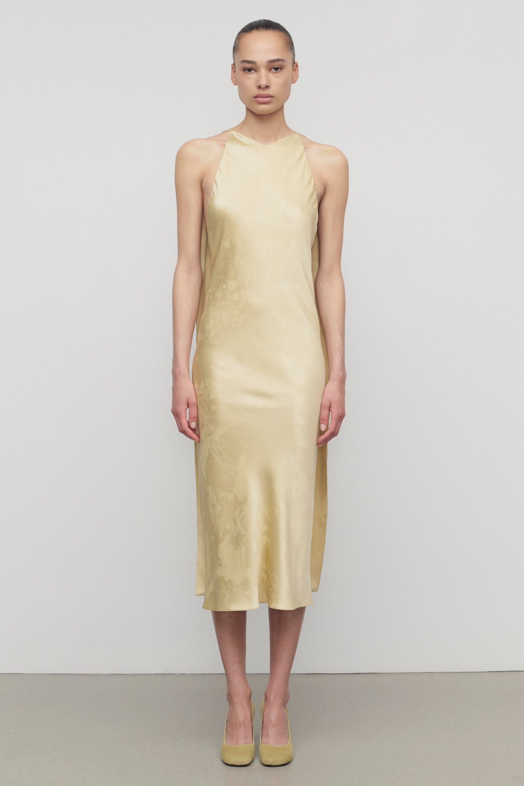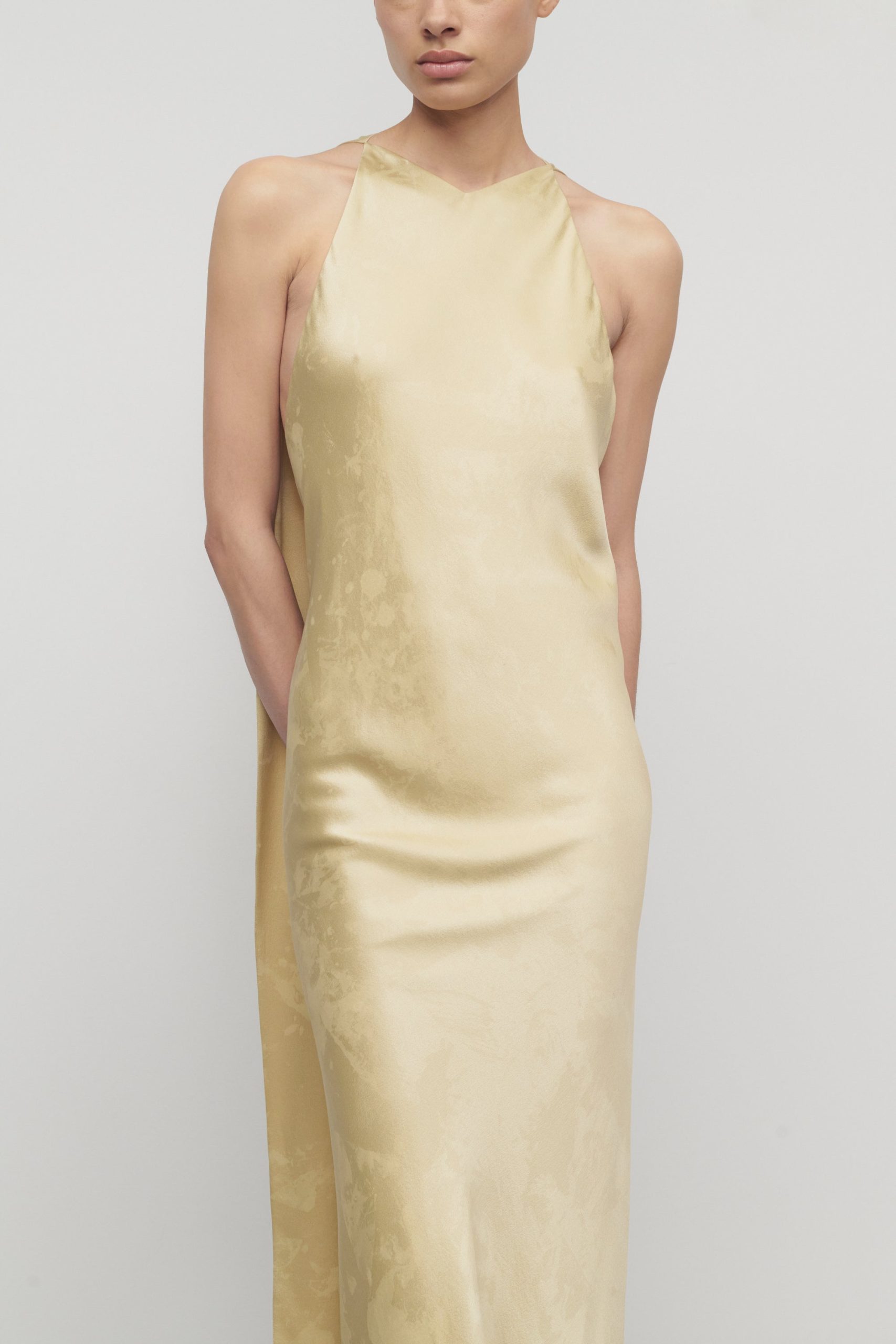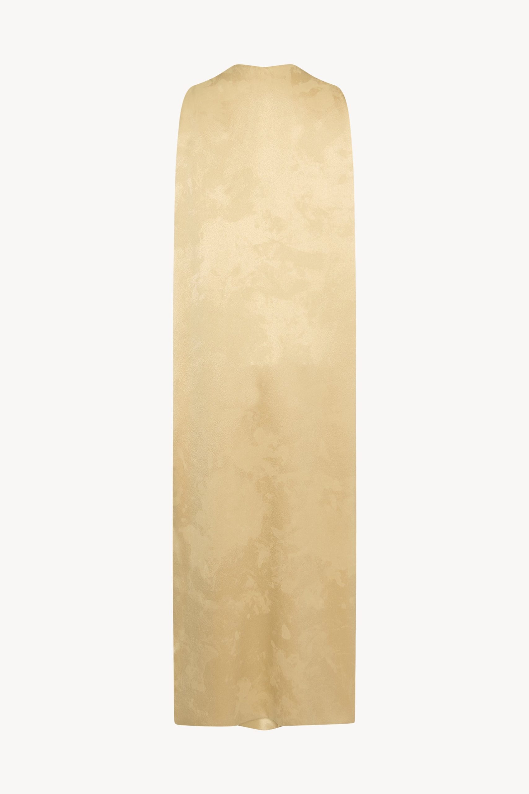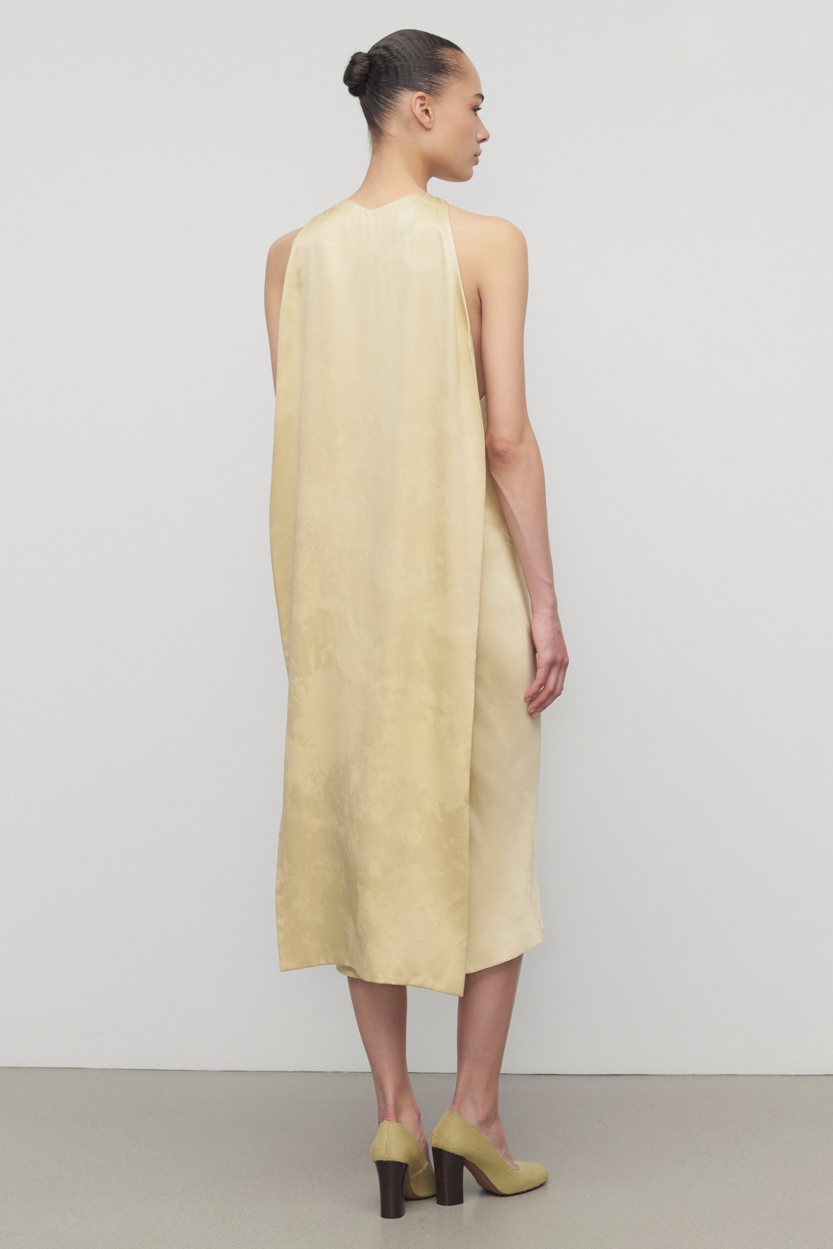 Calf-length bias-cut slip dress in textured silk crepe with slightly fitted silhouette. shallow v-neckline. and attached cape.