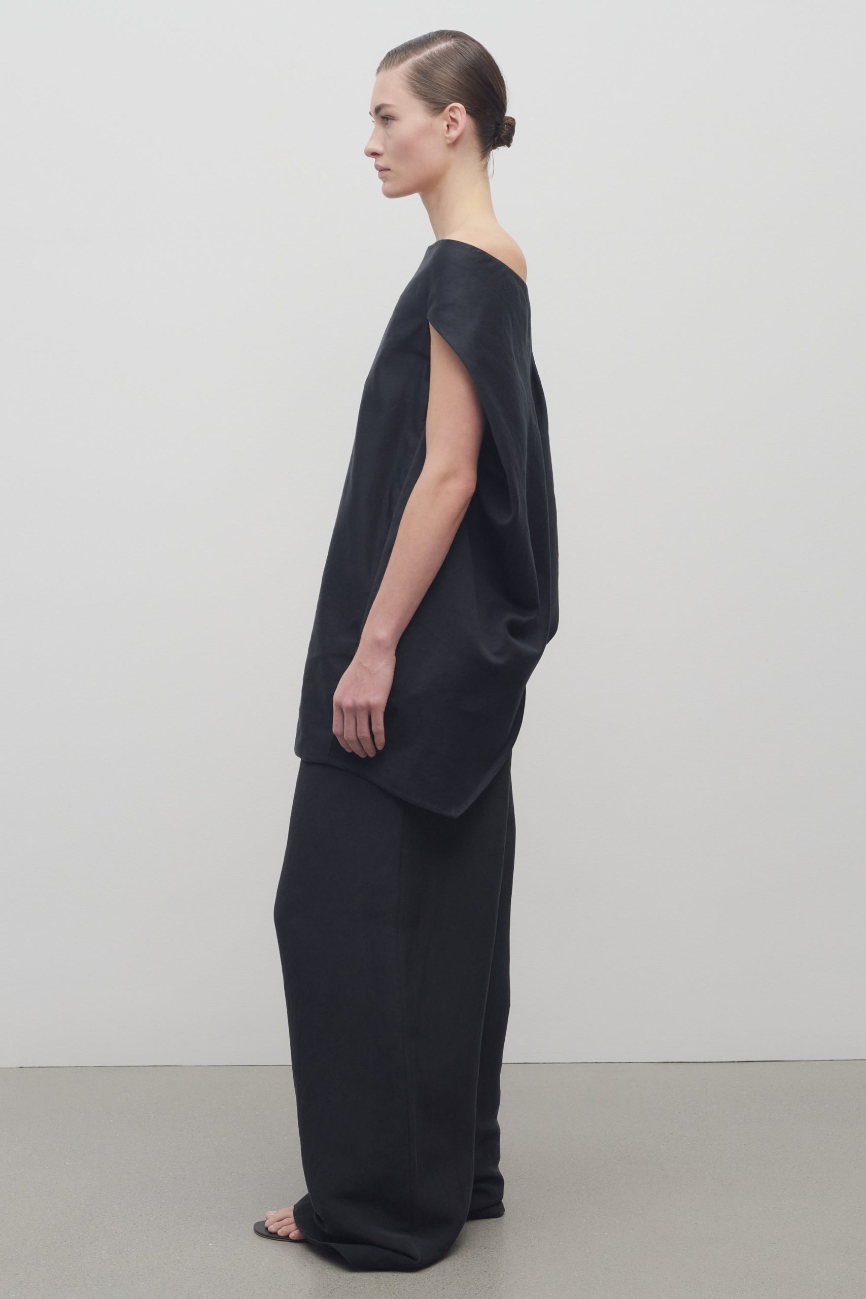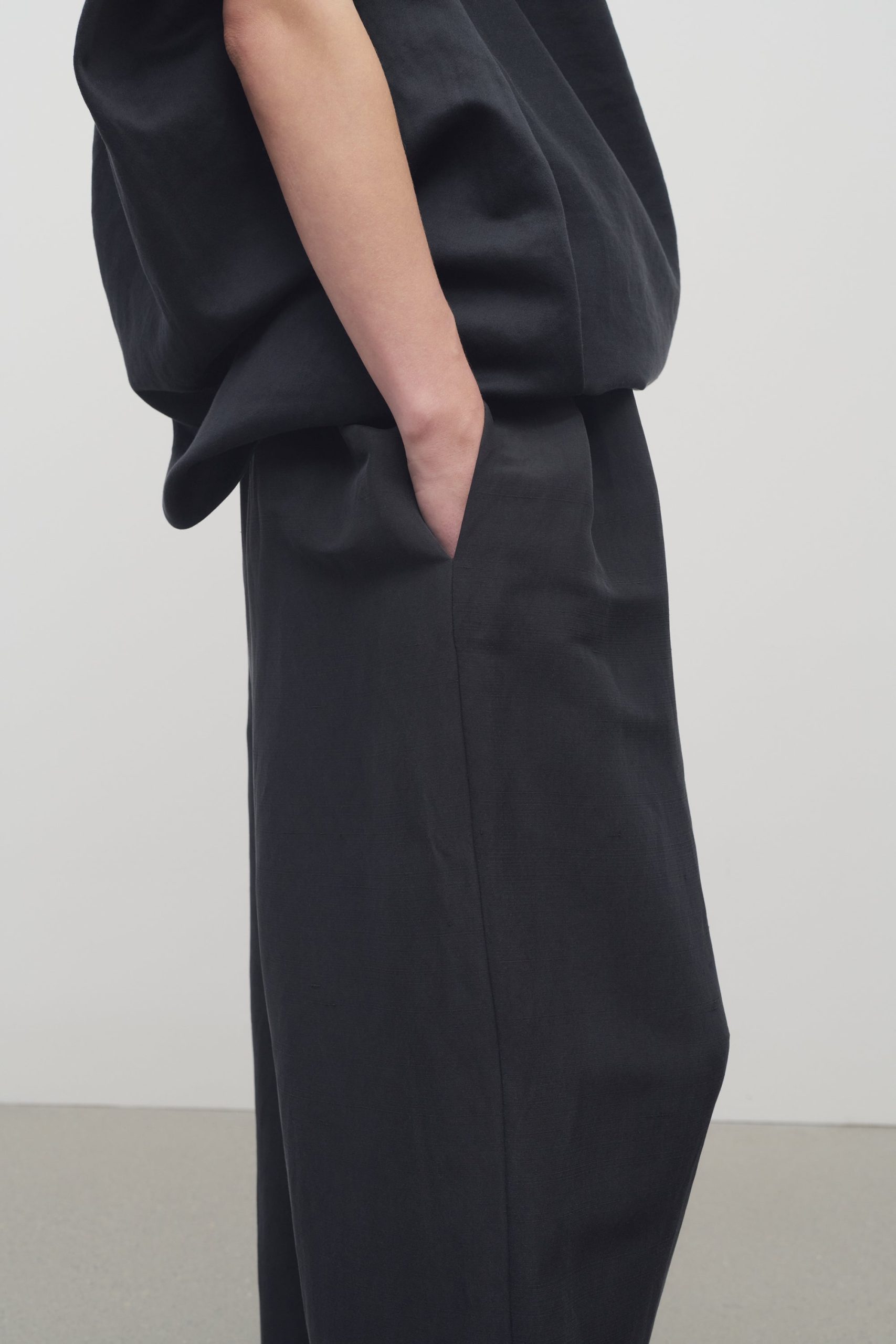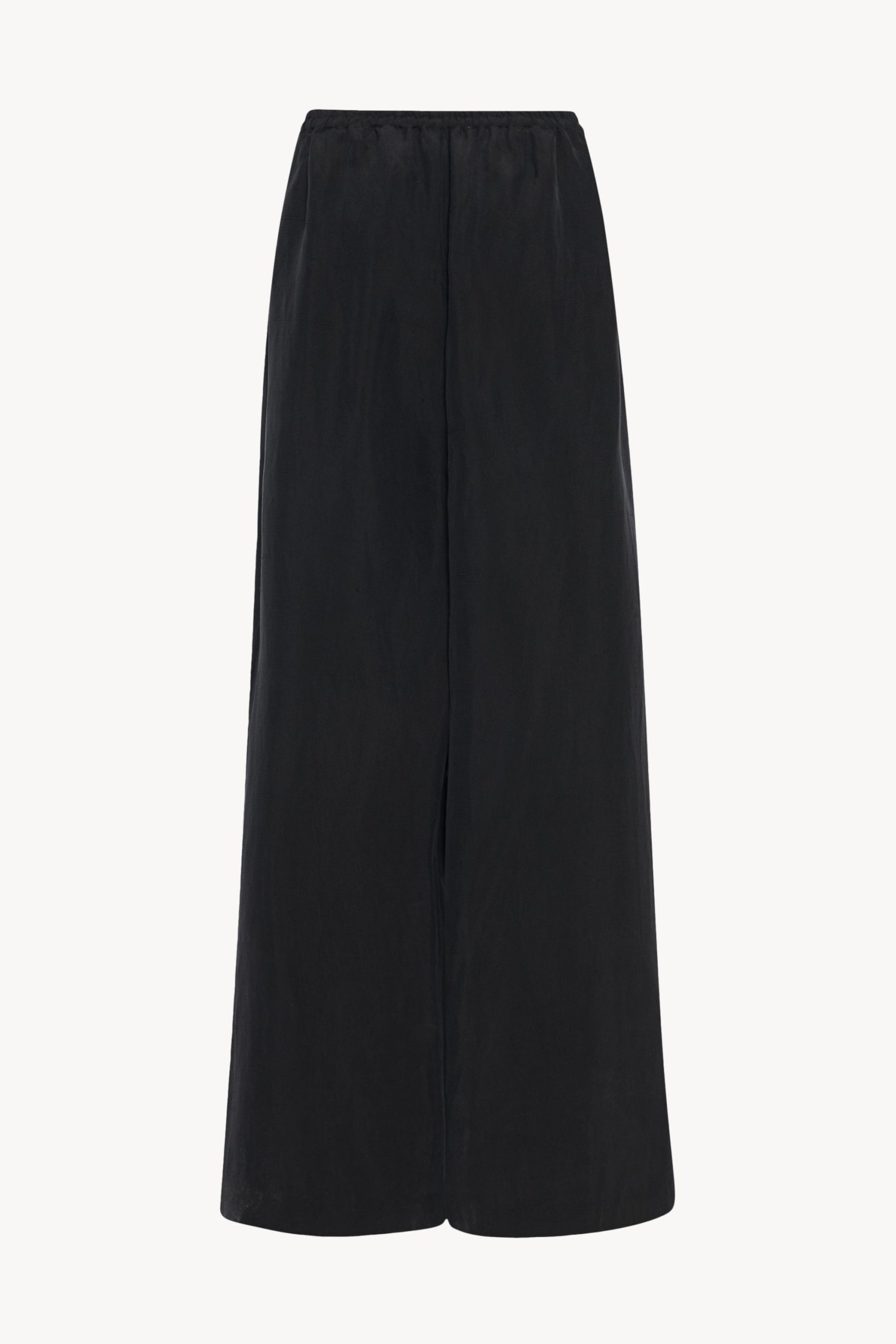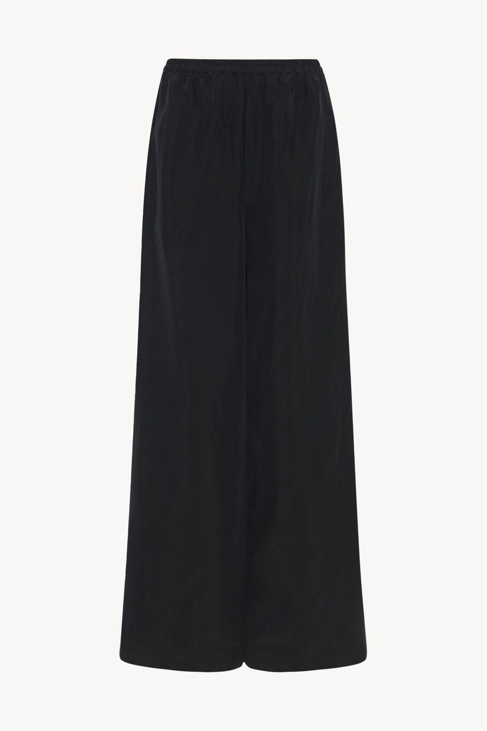 Mid-rise pull-on pant in natural silk shantung with wide leg. gathered elastic waistband. and side seam pockets.