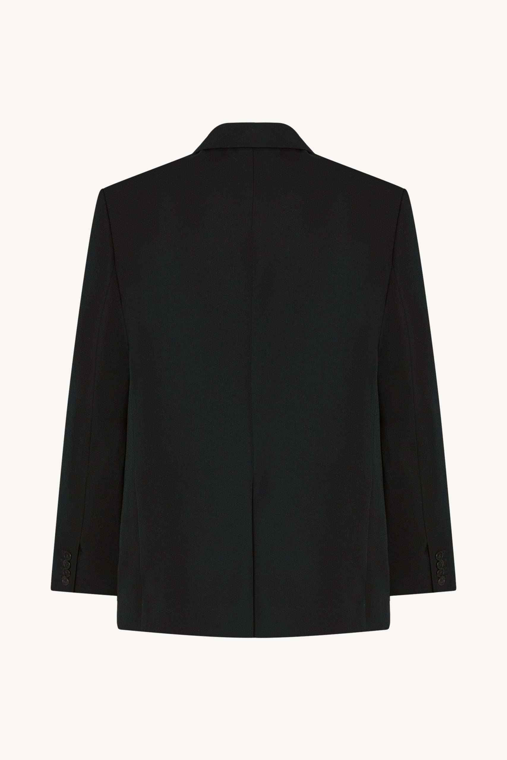 Single-breasted tailored jacket in Japanese wool gabardine with notch lapel. front patch pockets. and front button closure.