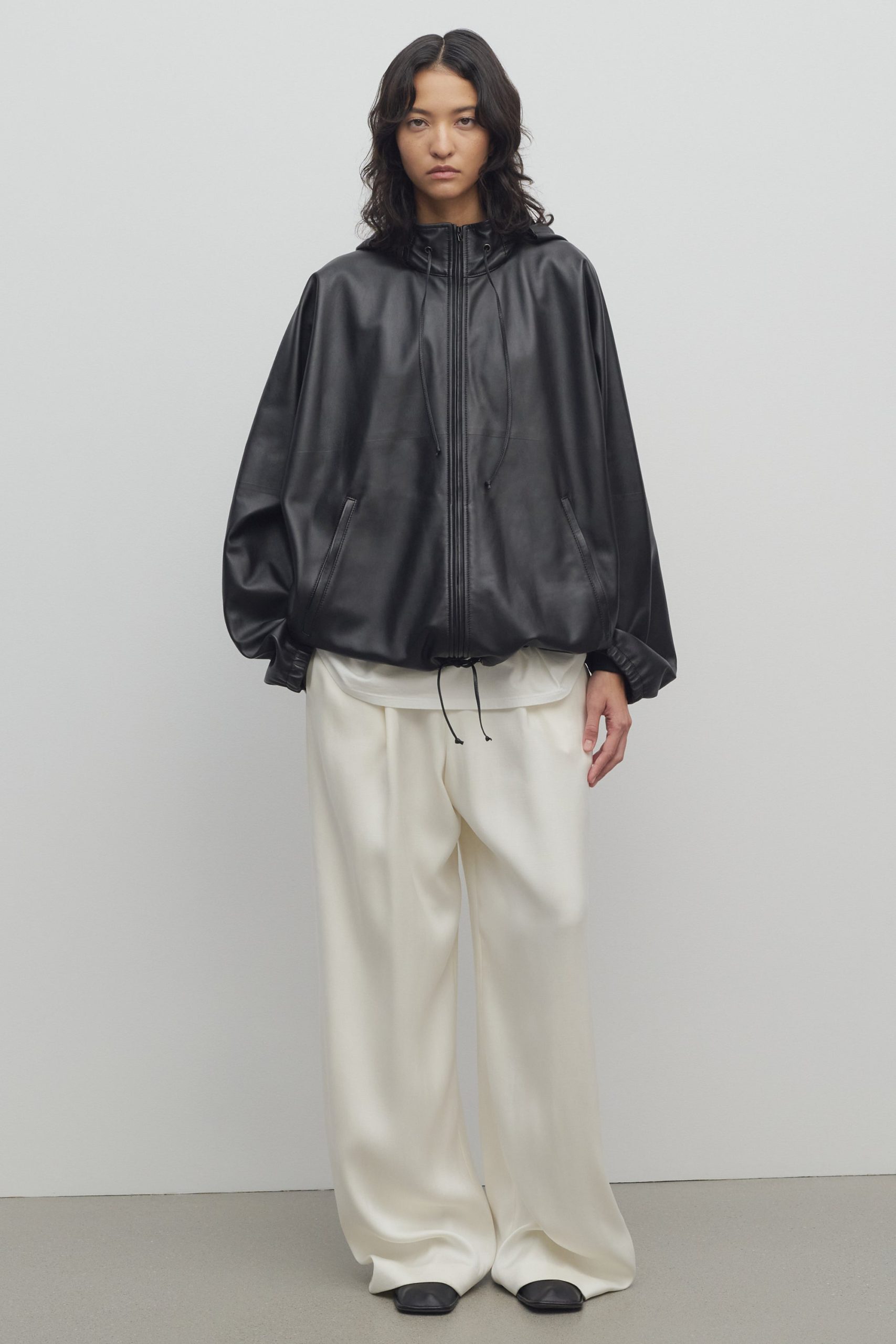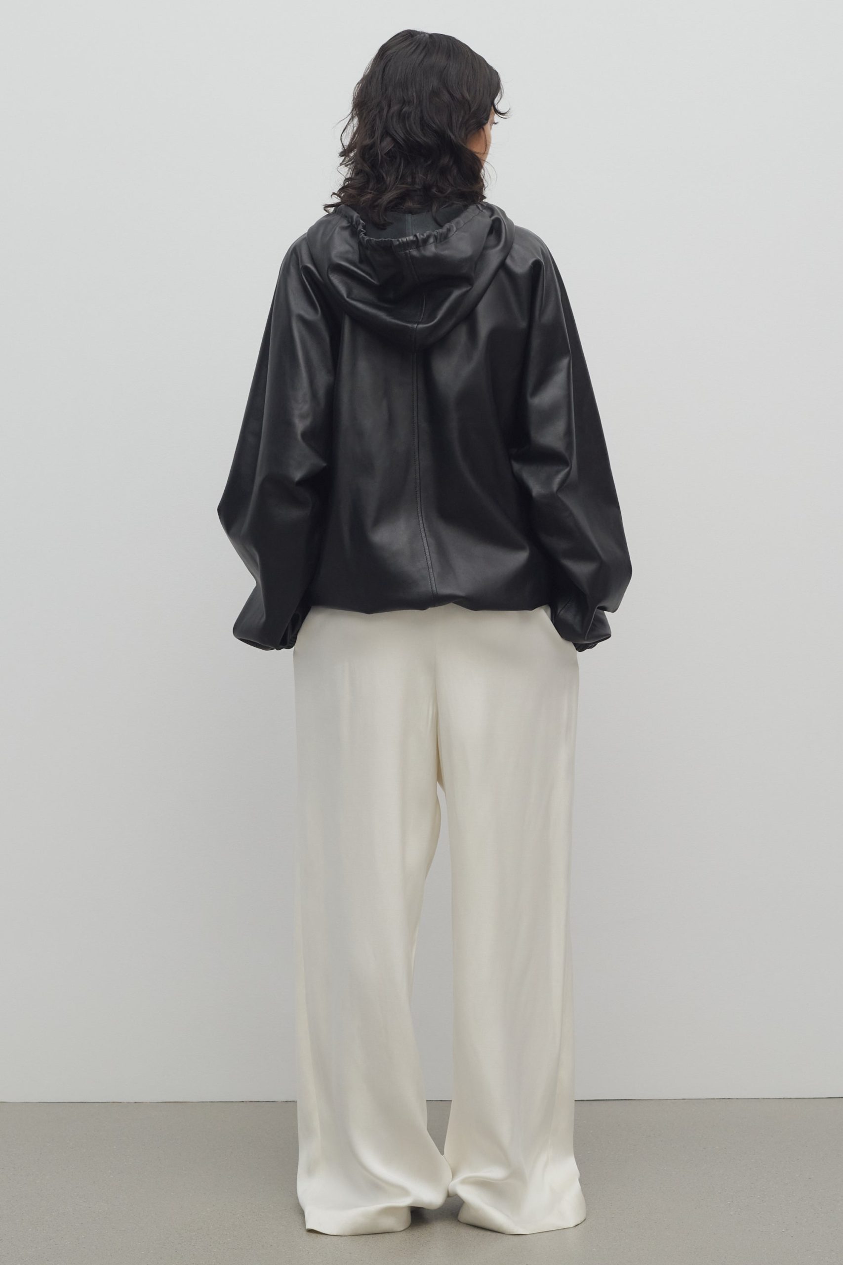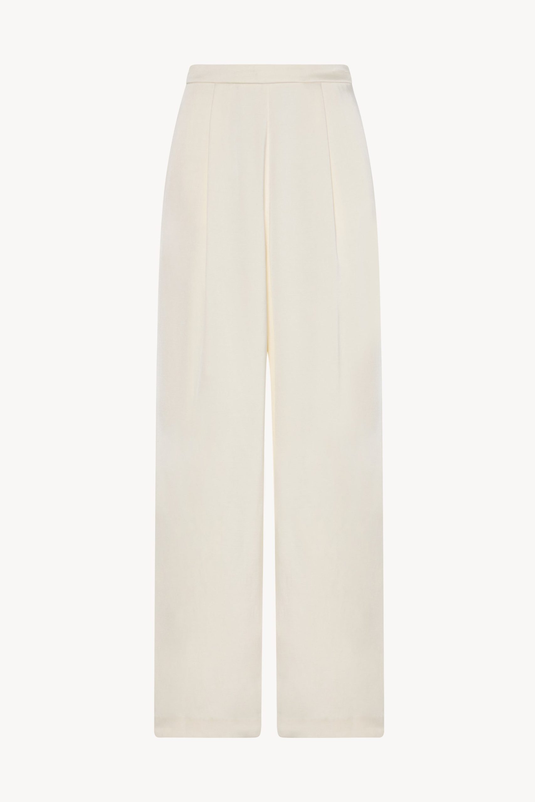 Tailored wide-leg pant in washed silk and wool satin with front and back pleats. side seam pockets. and single horn button closure.