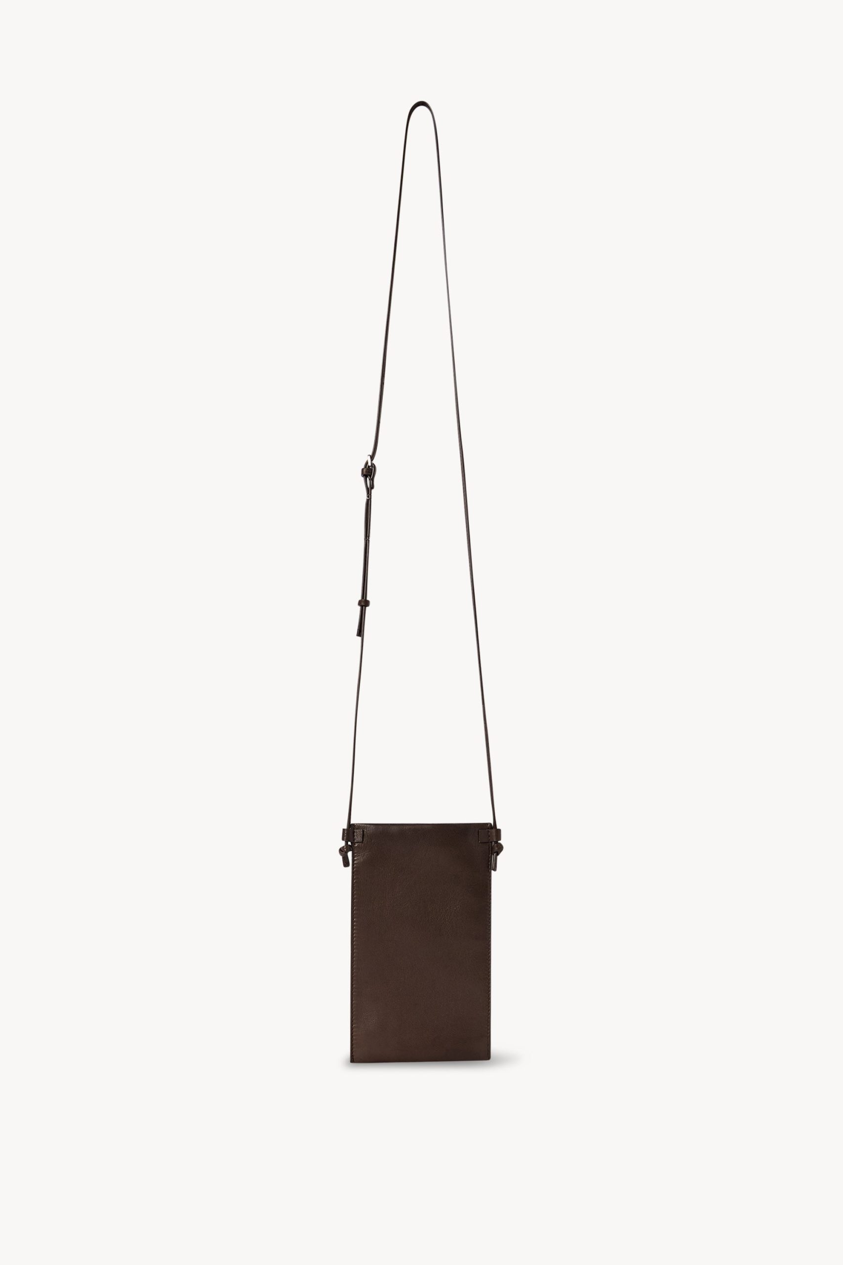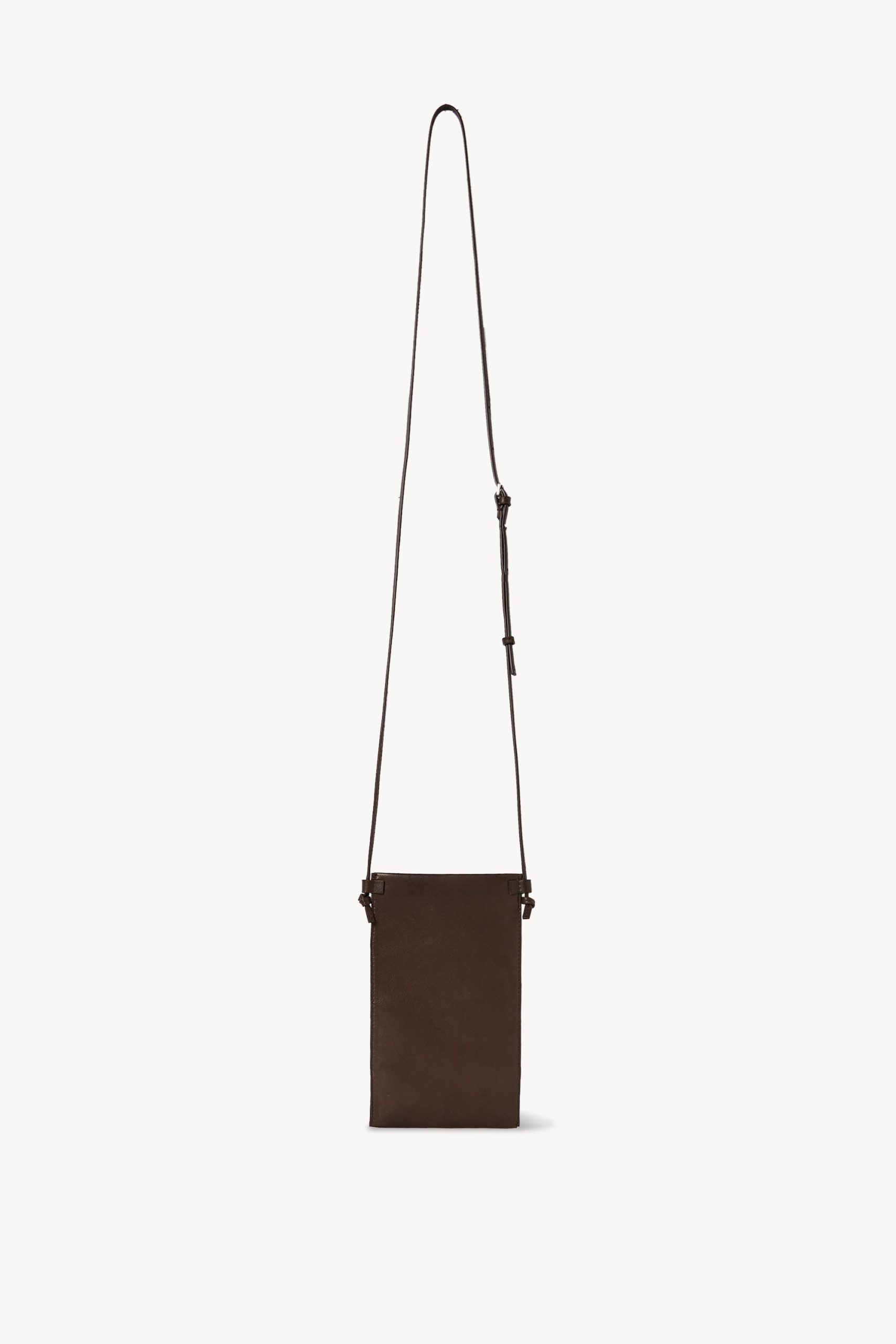 Minimal pocket pouch in buttery lambskin leather with open top and slim. adjustable strap.