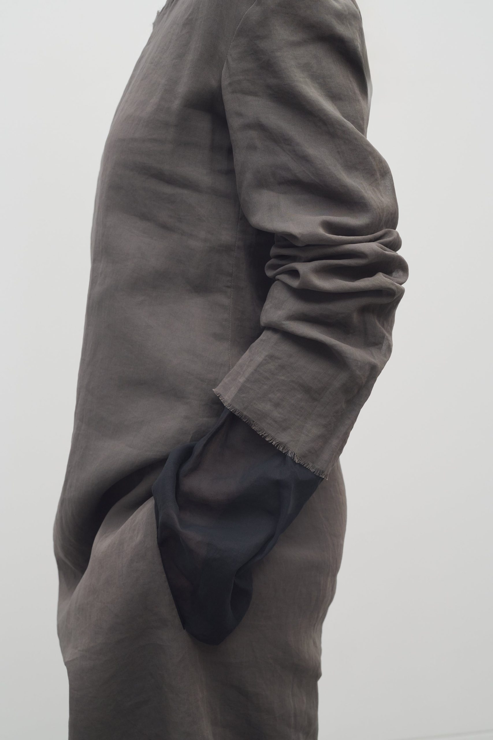 The pockets of this garment are sewn at mid-thigh level. naturally creating a draped effect when pockets are in use. Model is wearing the outer sleeve layer of this dress ruched. creating additional volume while exposing the contrast underlayer of the sleeve.