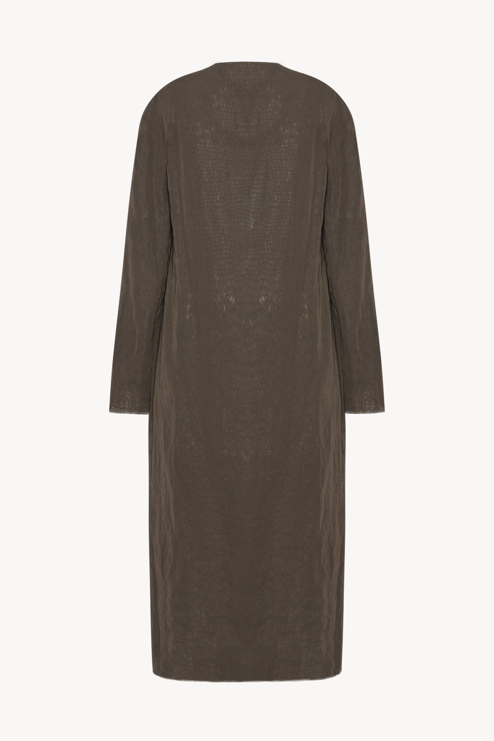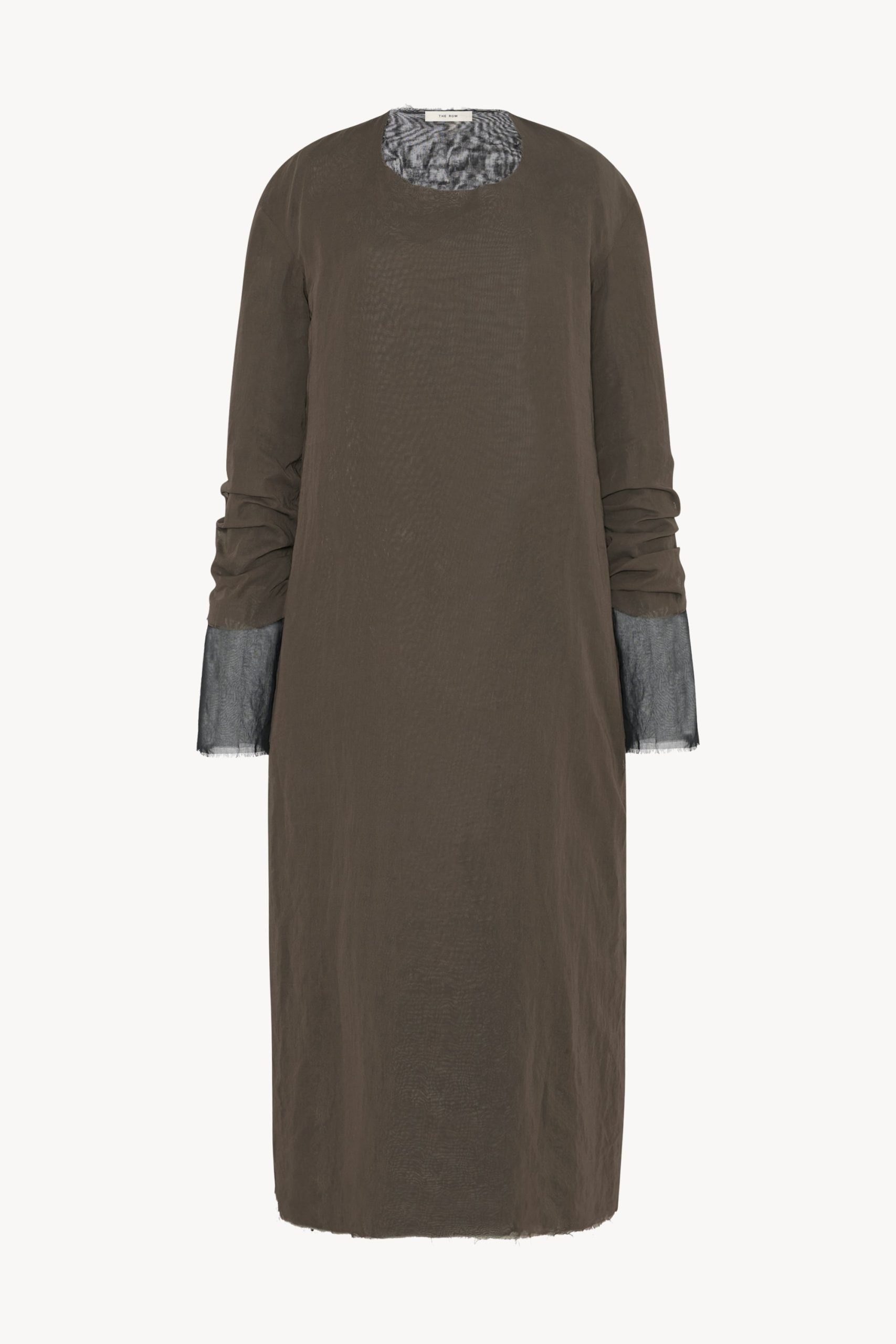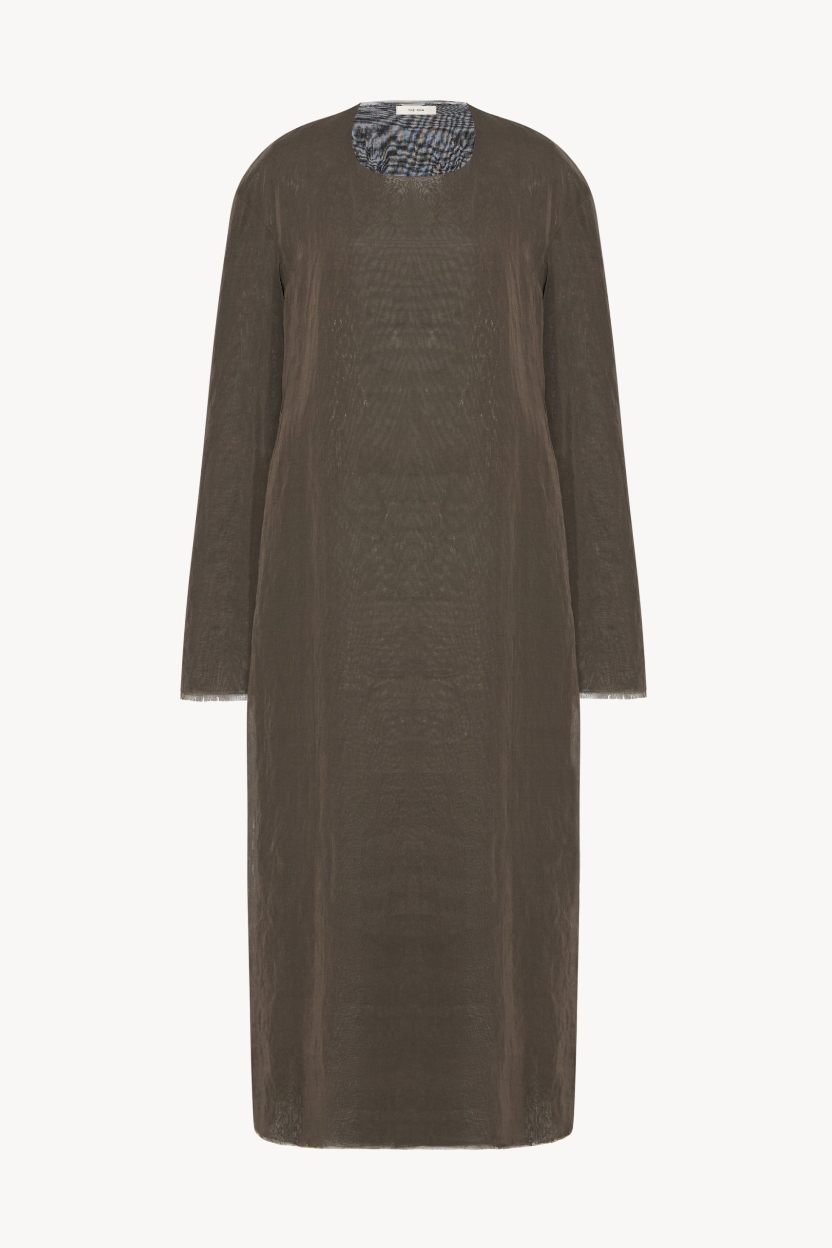 Ankle-length shift dress in gauzy cotton organza with layered construction. raw finish. and straight fit.