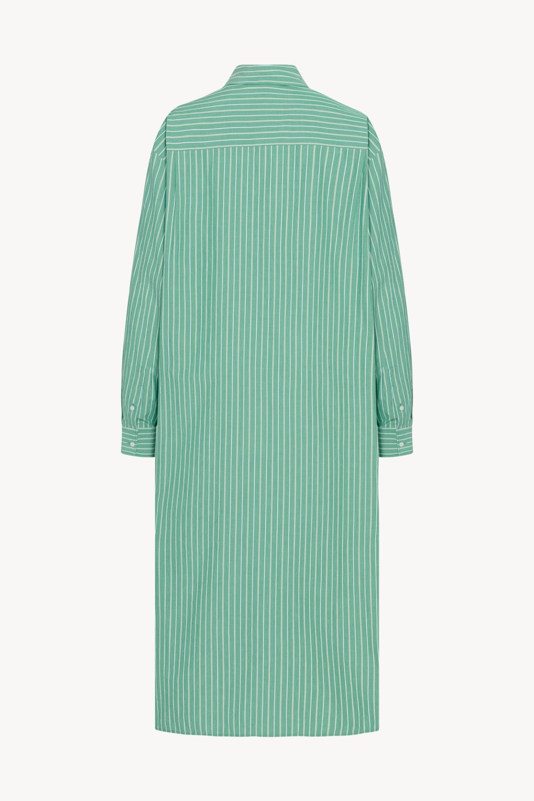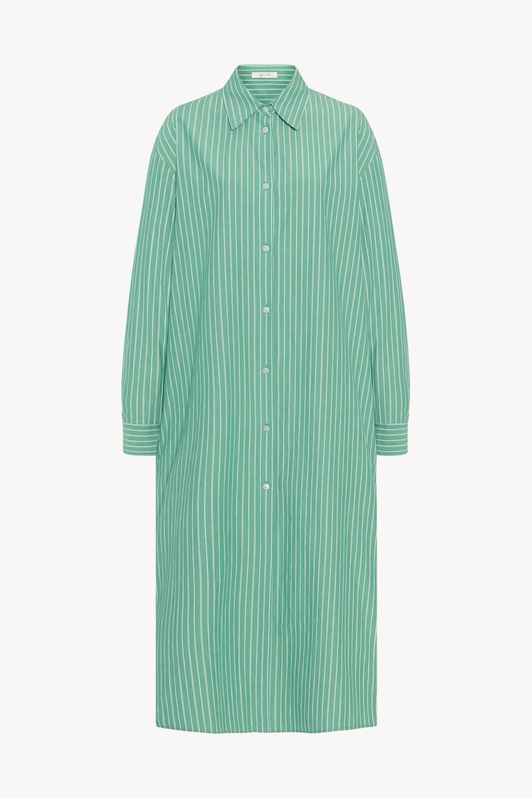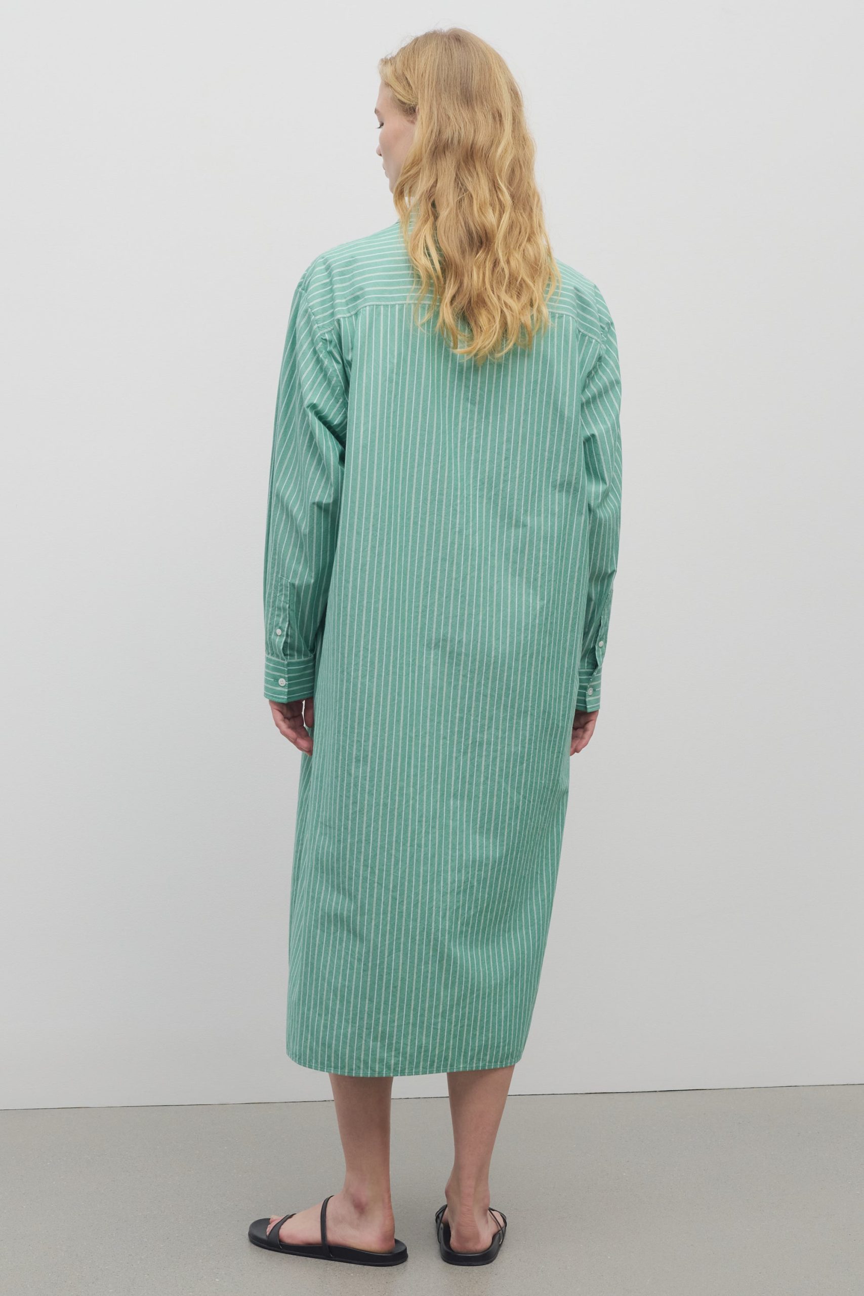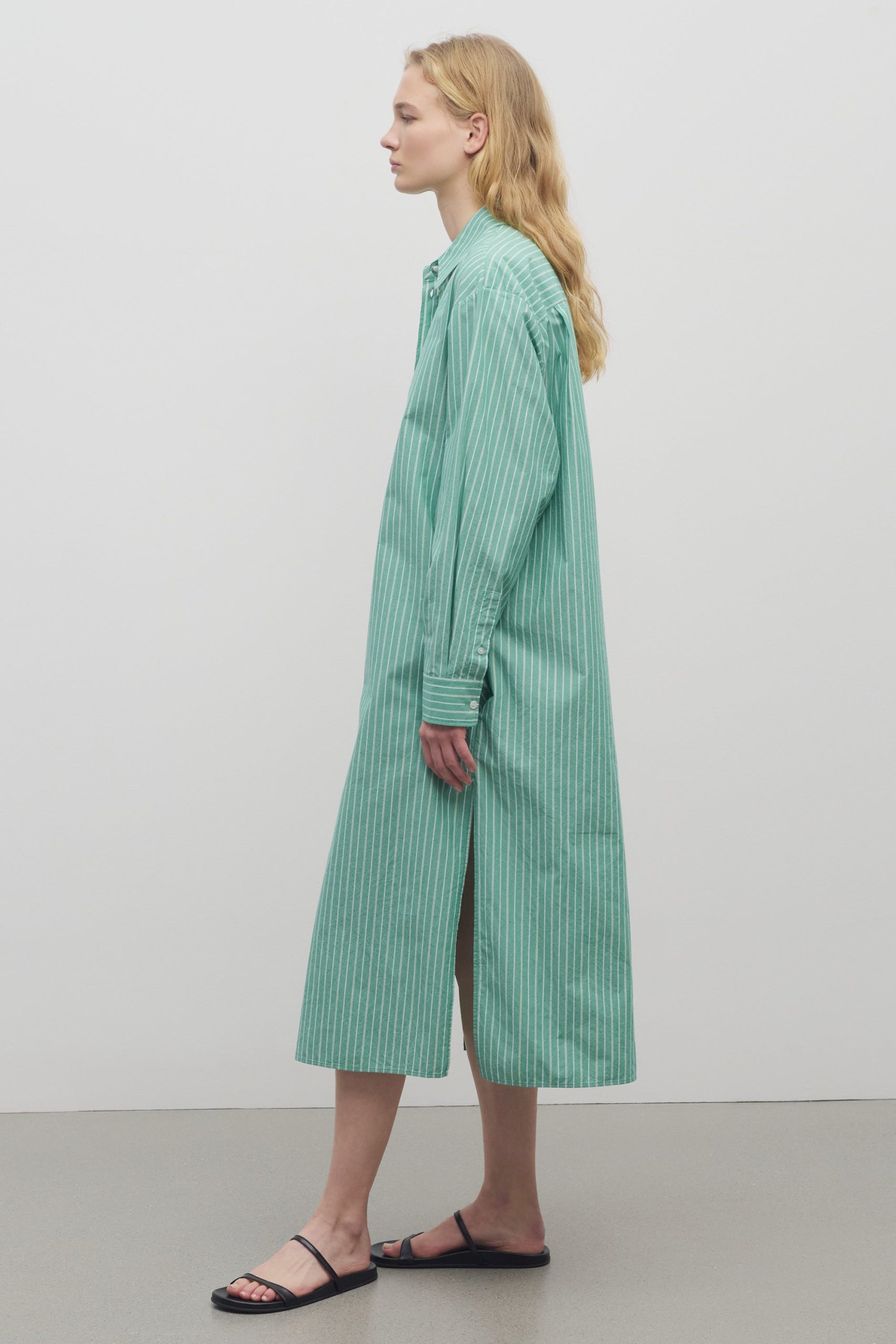 Calf-length shirtdress in washed Japanese cotton with side hem slits. exposed button placket. and straight fit.