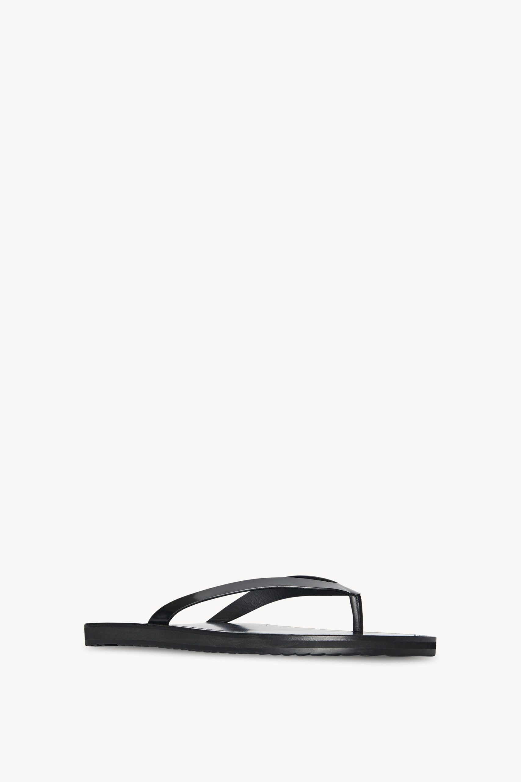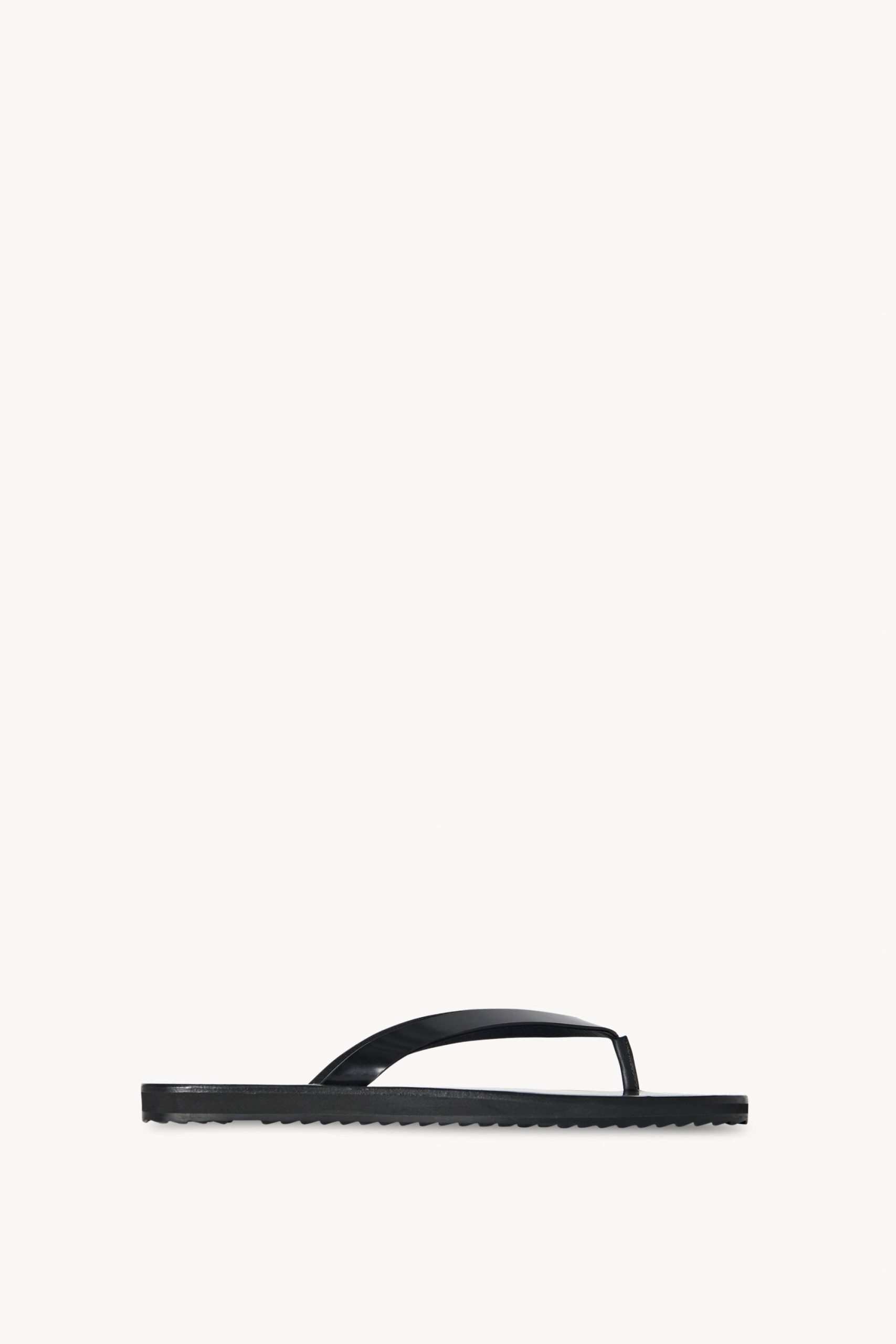 Refined flip flop sandal in shiny calfskin leather with stitched leather detailing and lightly treaded sole.
