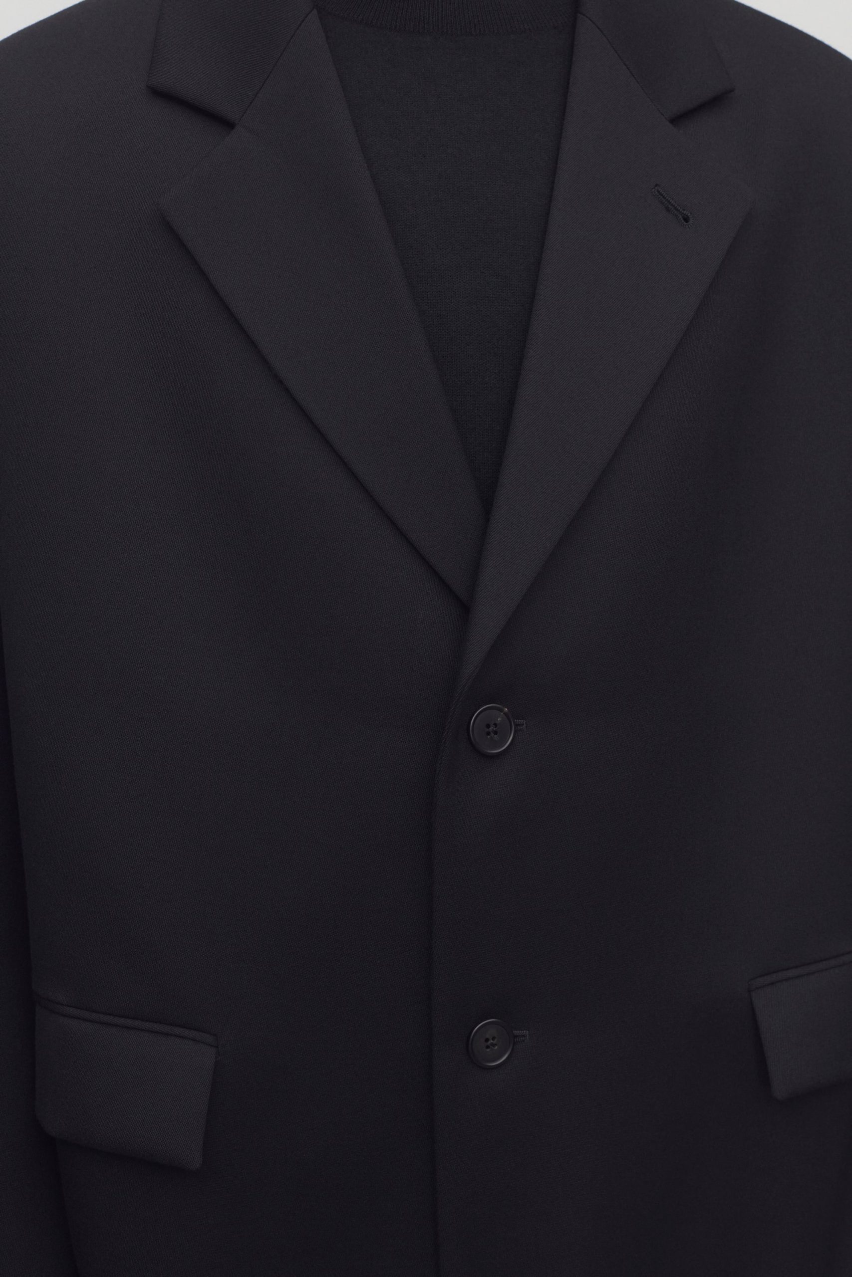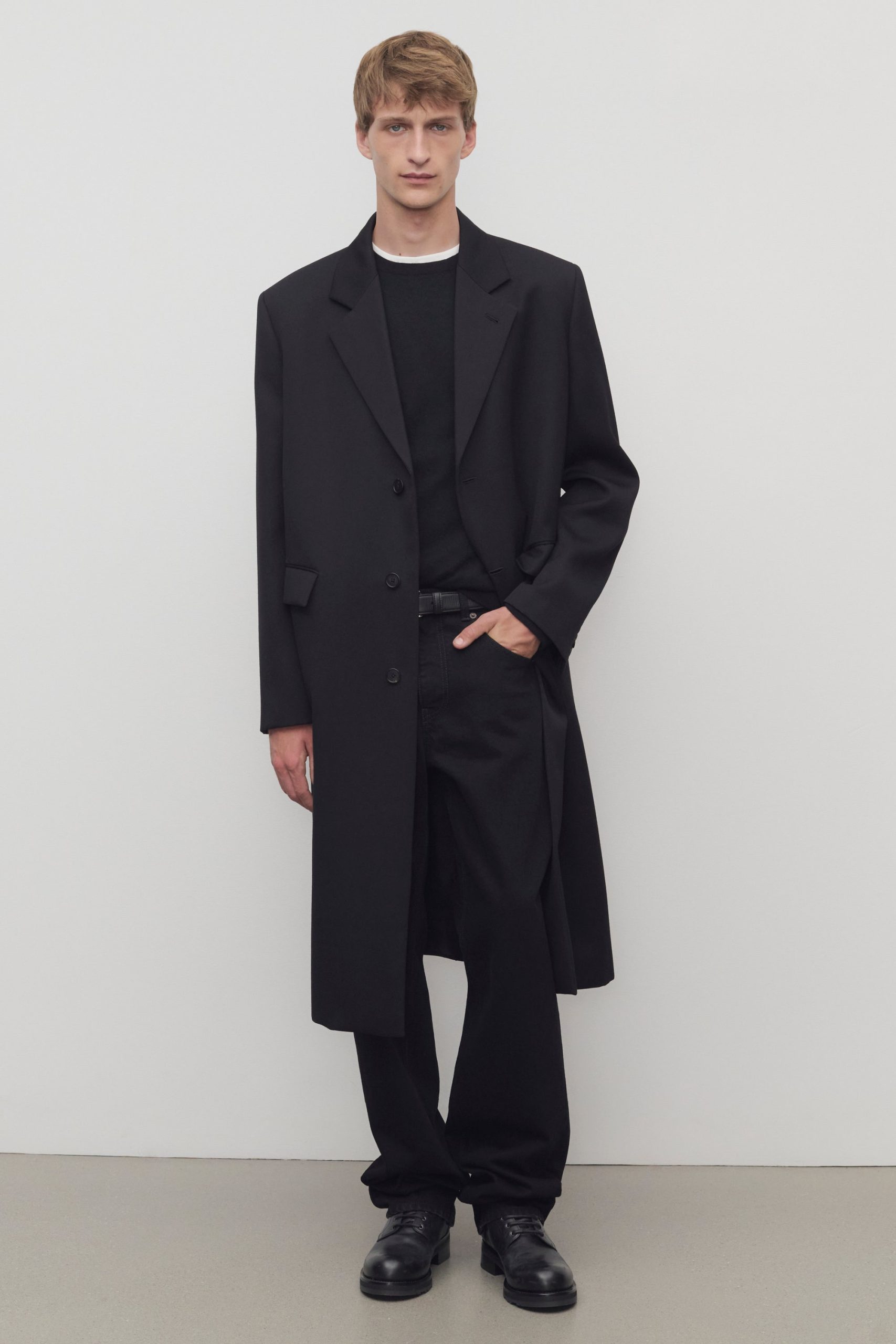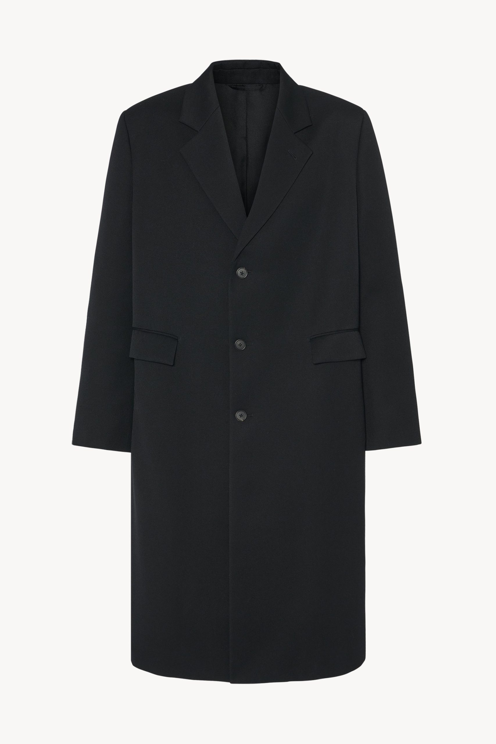 Single-breasted tailored coat in Japanese wool gabardine with notch lapel. front flap pockets. and front button closure.