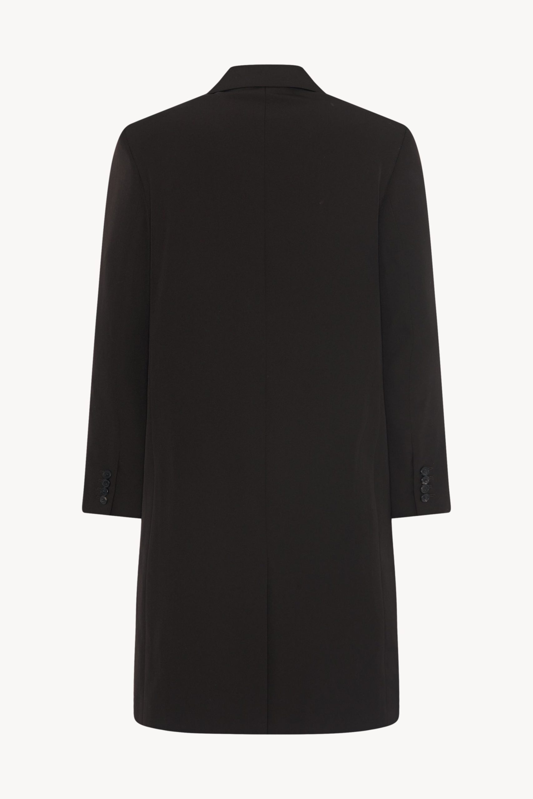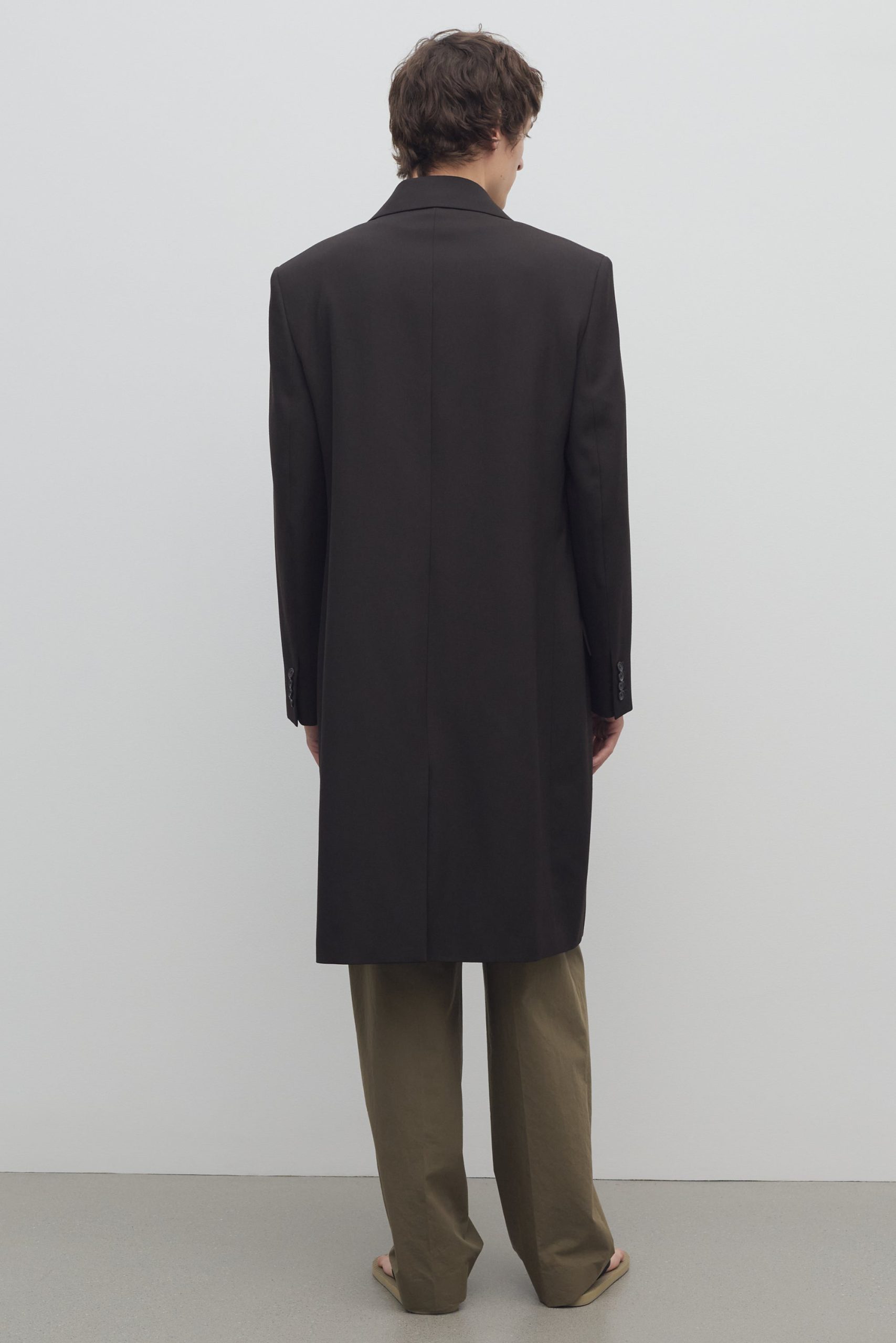 Single-breasted tailored coat in structured virgin wool with wide notched lapels. front flap pockets. and horn button closure.