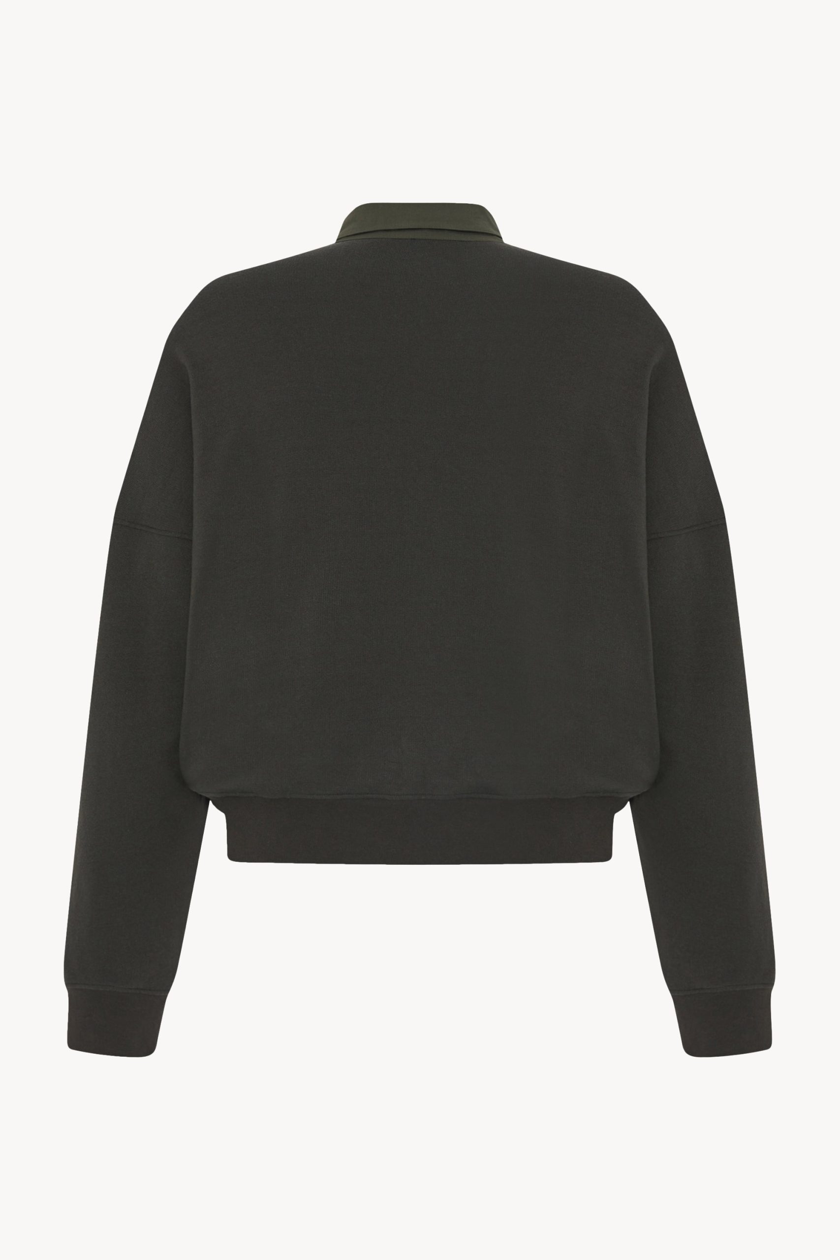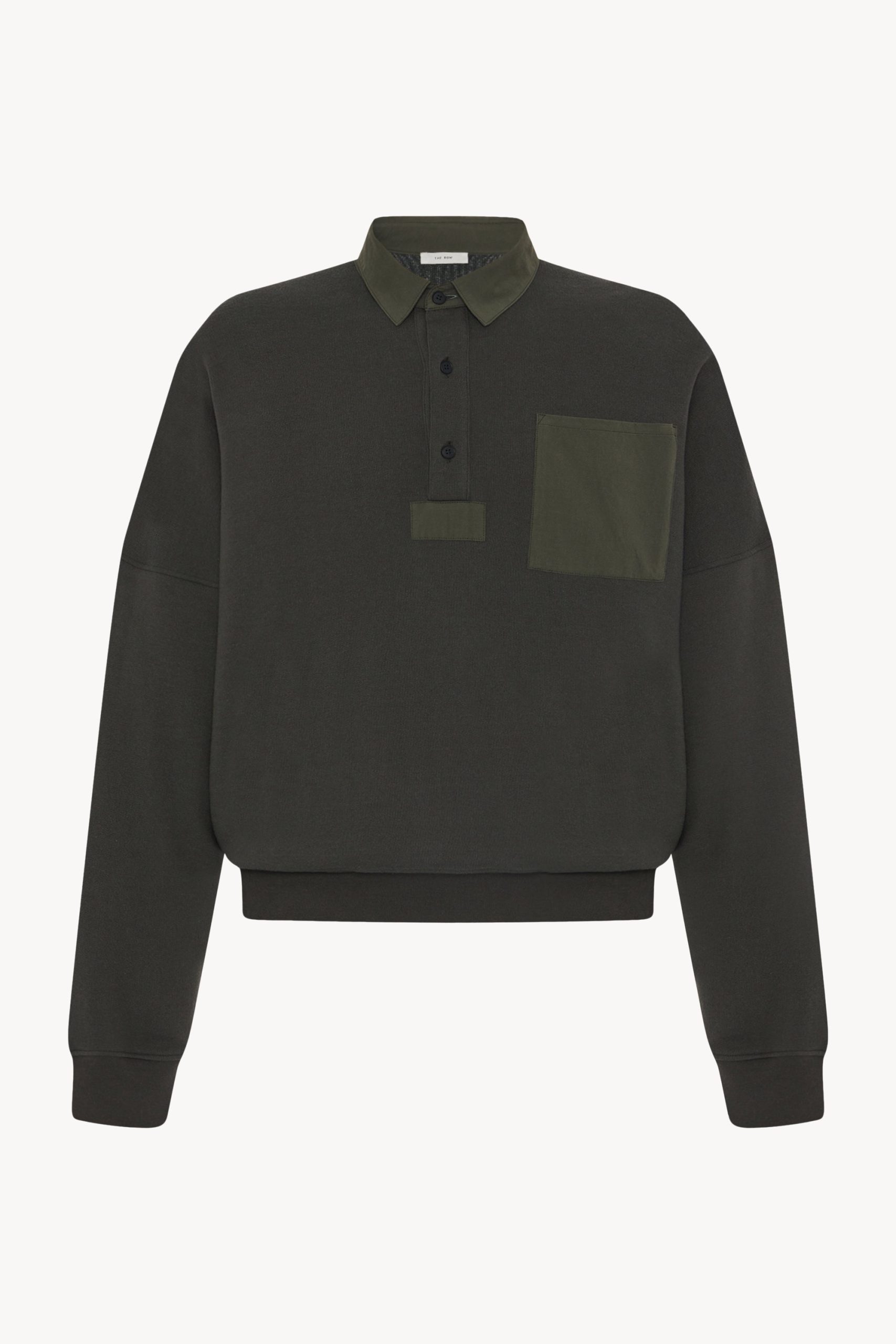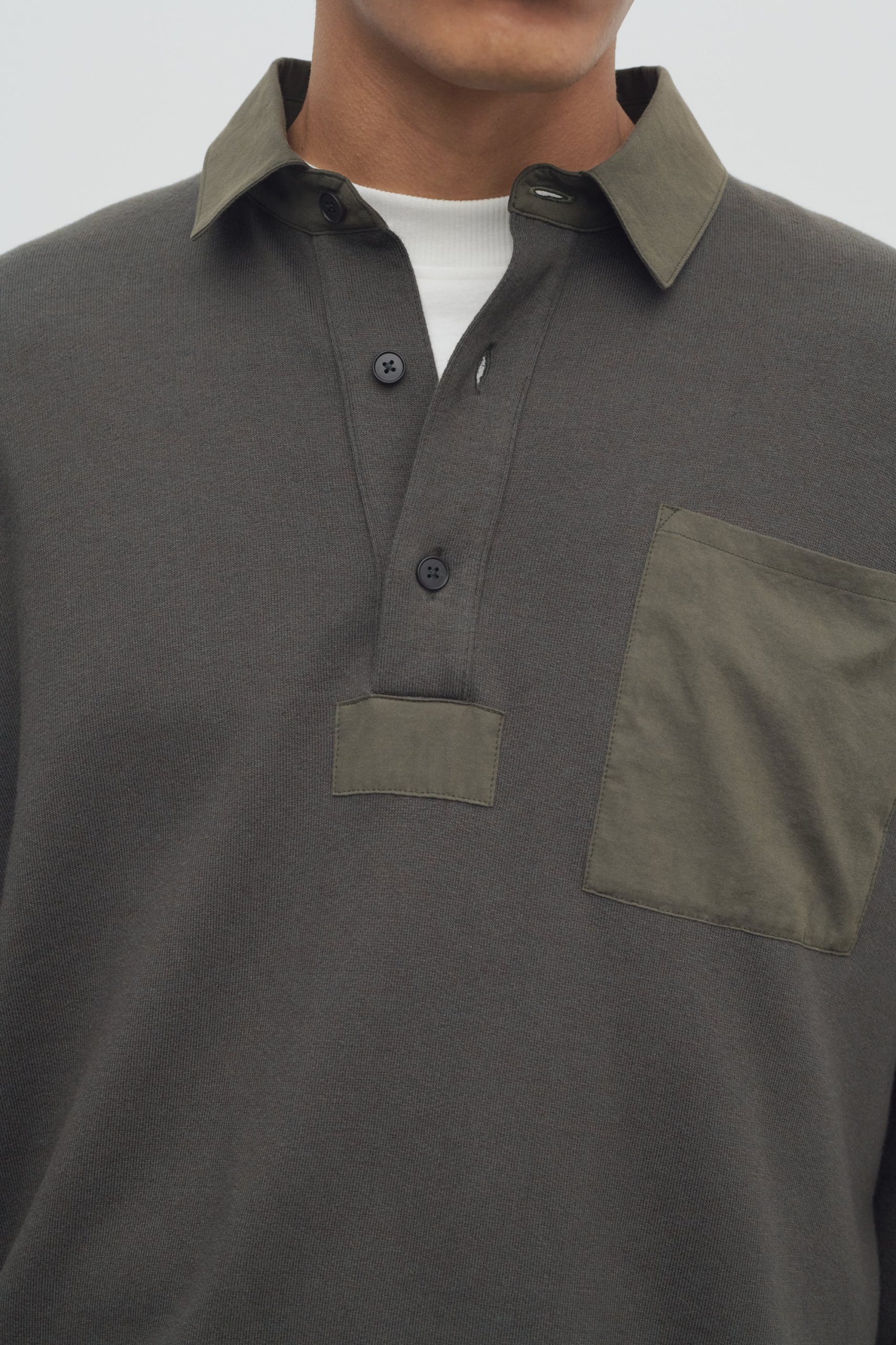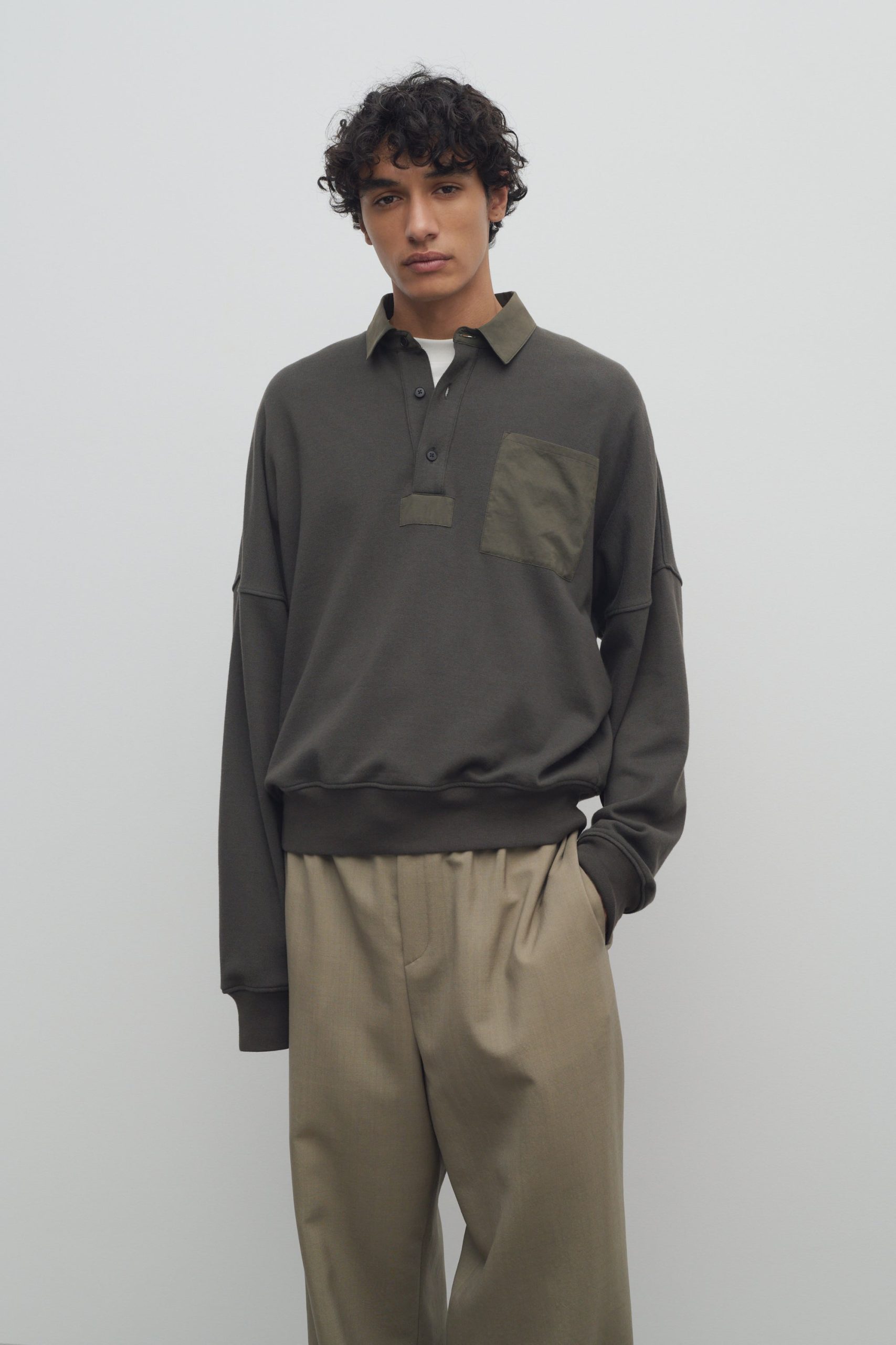 Oversized polo top in cashmere and cotton French terry with dropped shoulders. tonal cotton patch pocket. collar. and placket square. and ribbed cuffs and hem.