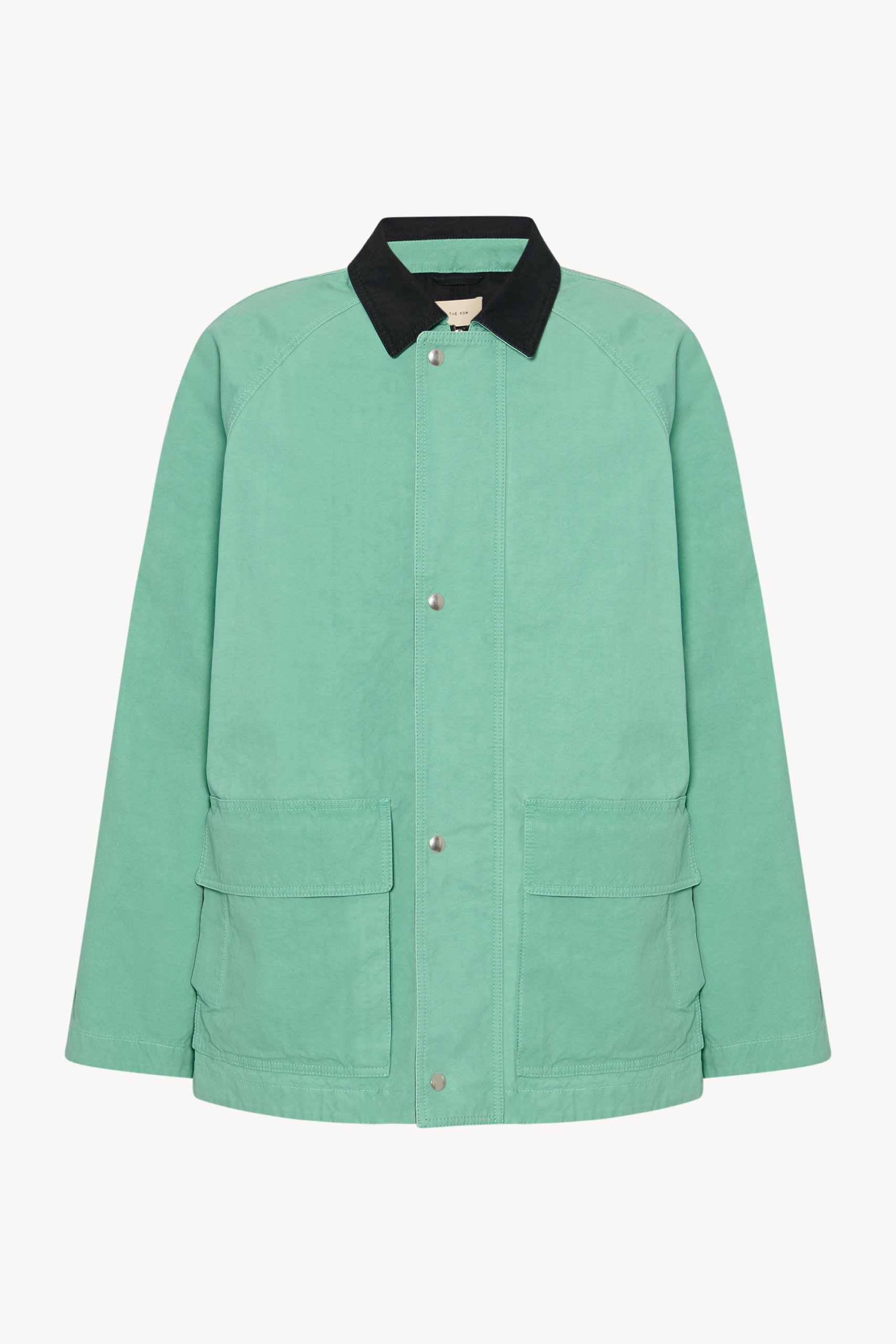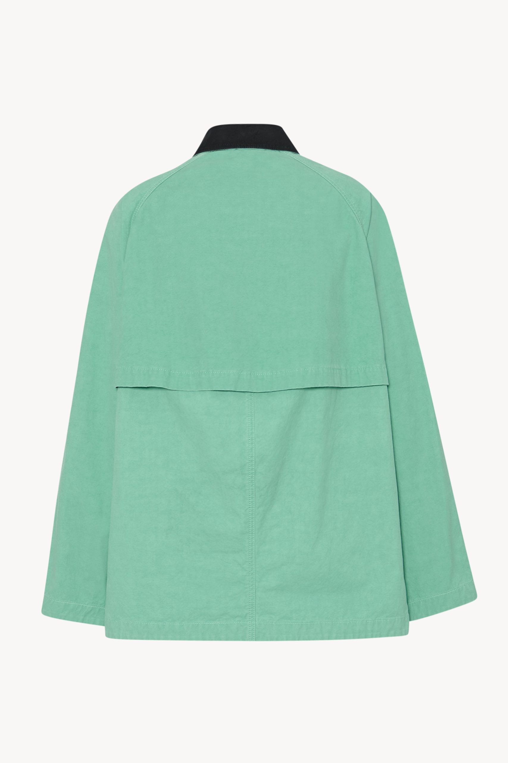Outdoor jacket in washed Japanese cotton canvas with back storm flap. front patch pockets. and concealed front placket with snap and zipper closure.
