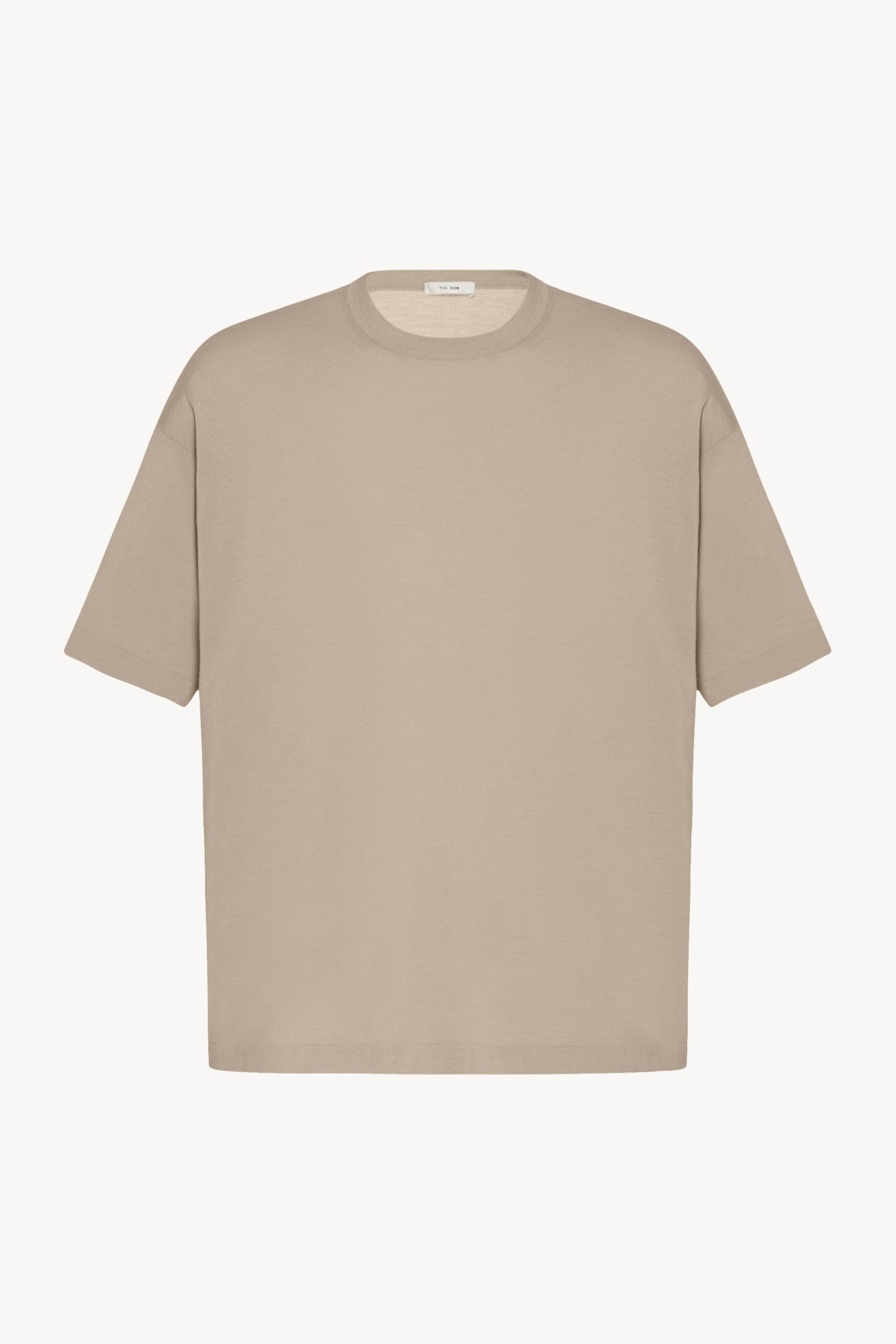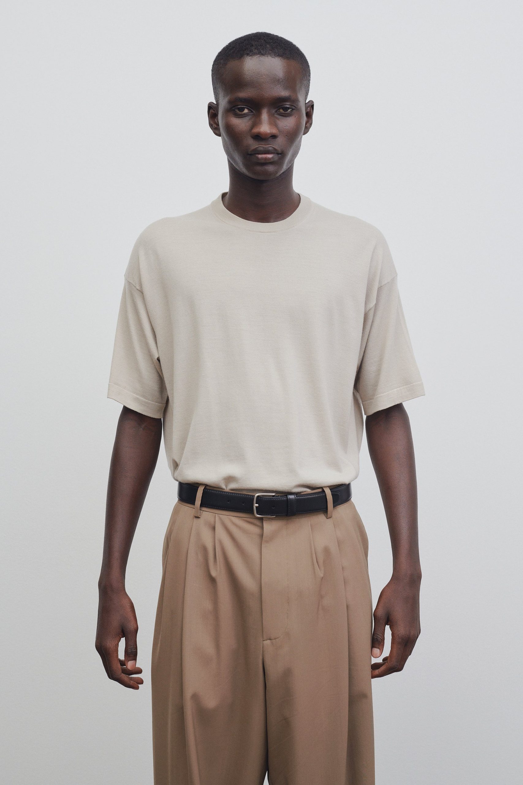 Crewneck t-shirt in extra fine wool with boxy fit. ribbed collar. and signature center back detail.