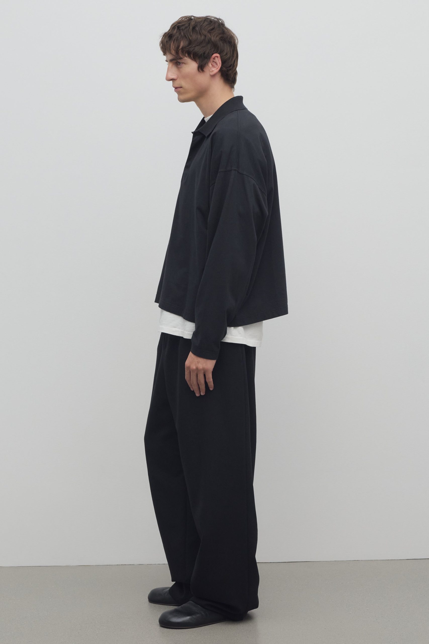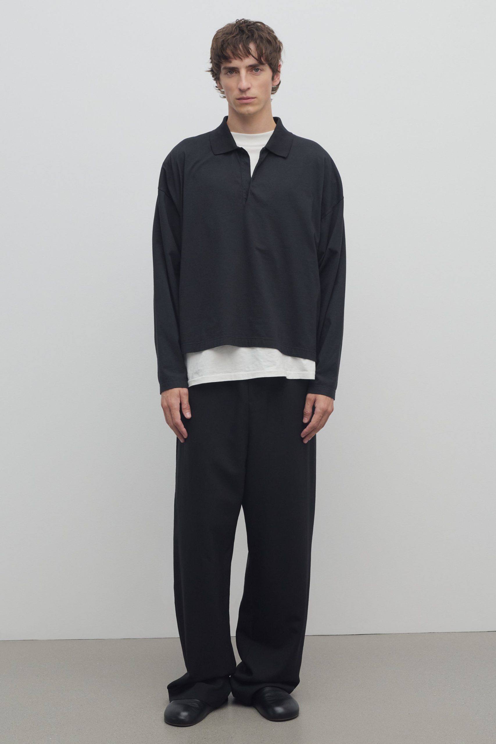 Relaxed wide leg pant in mohair and wool with side seam pockets. zipper fly. and elasticated waistband with drawstring closure.