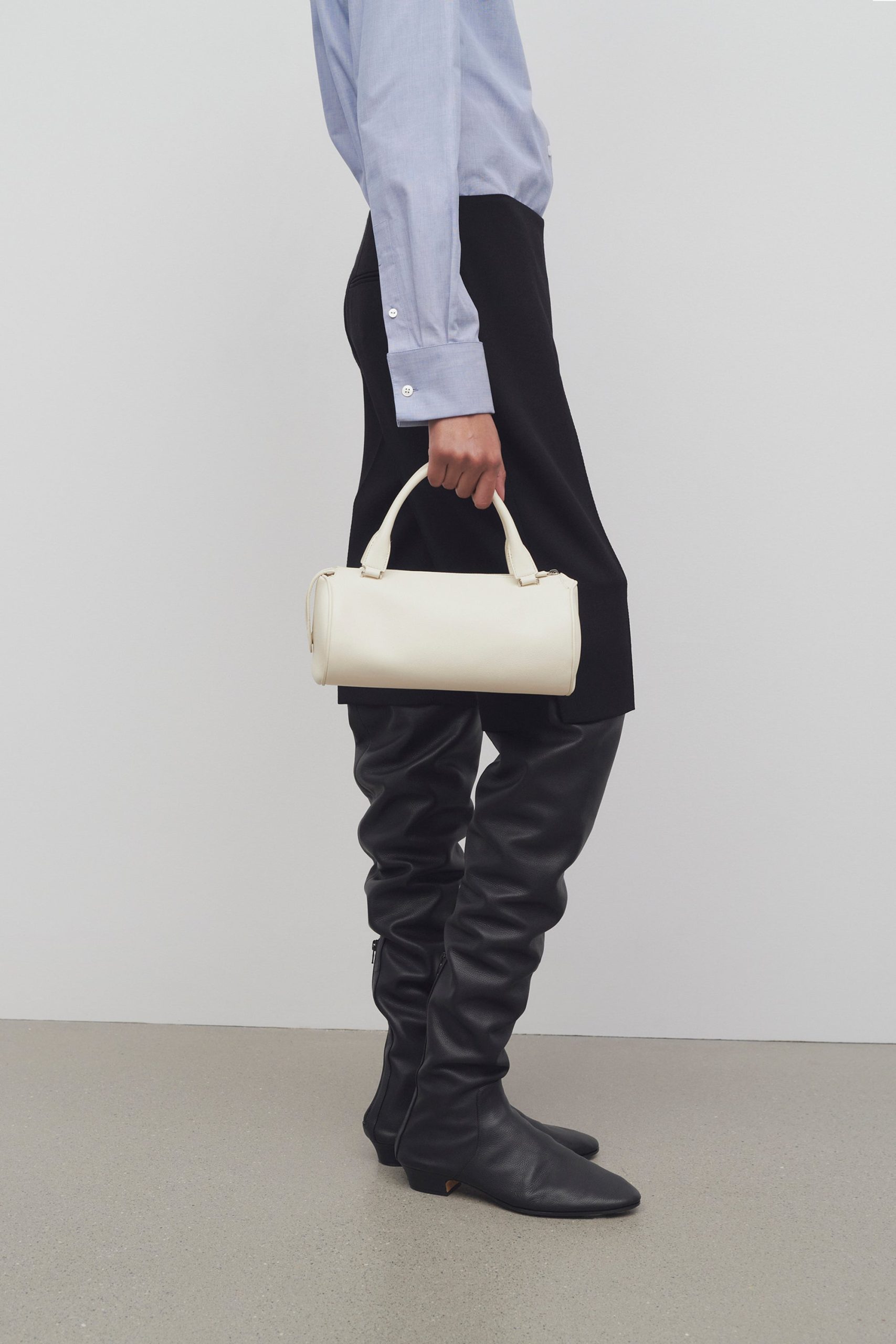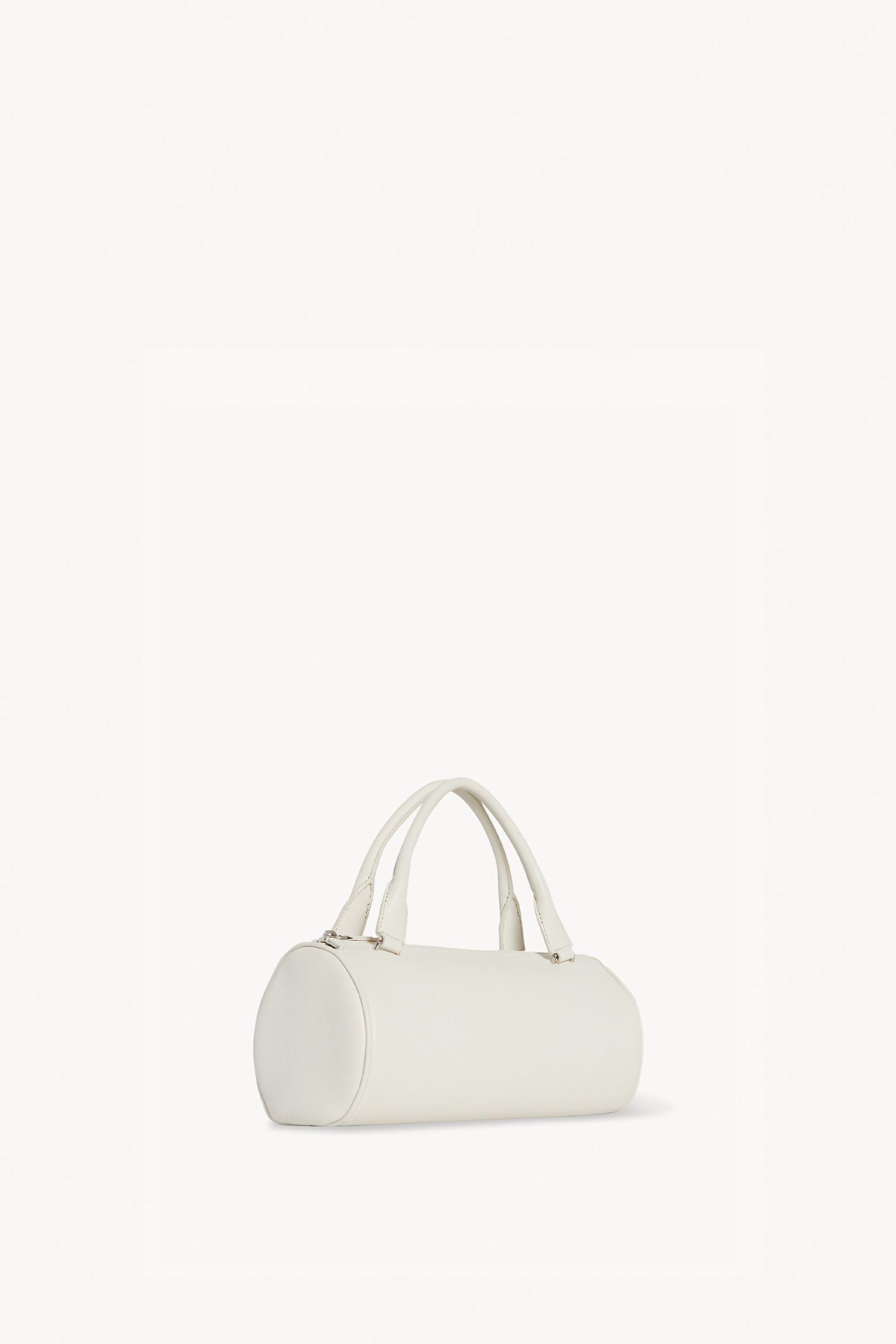Round top handle bag in finely grained calfskin leather with exposed zipper and magnetic closure.