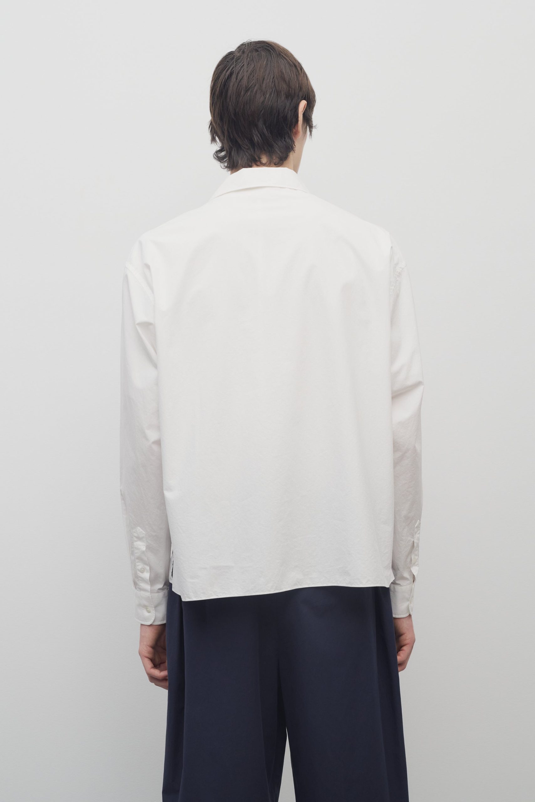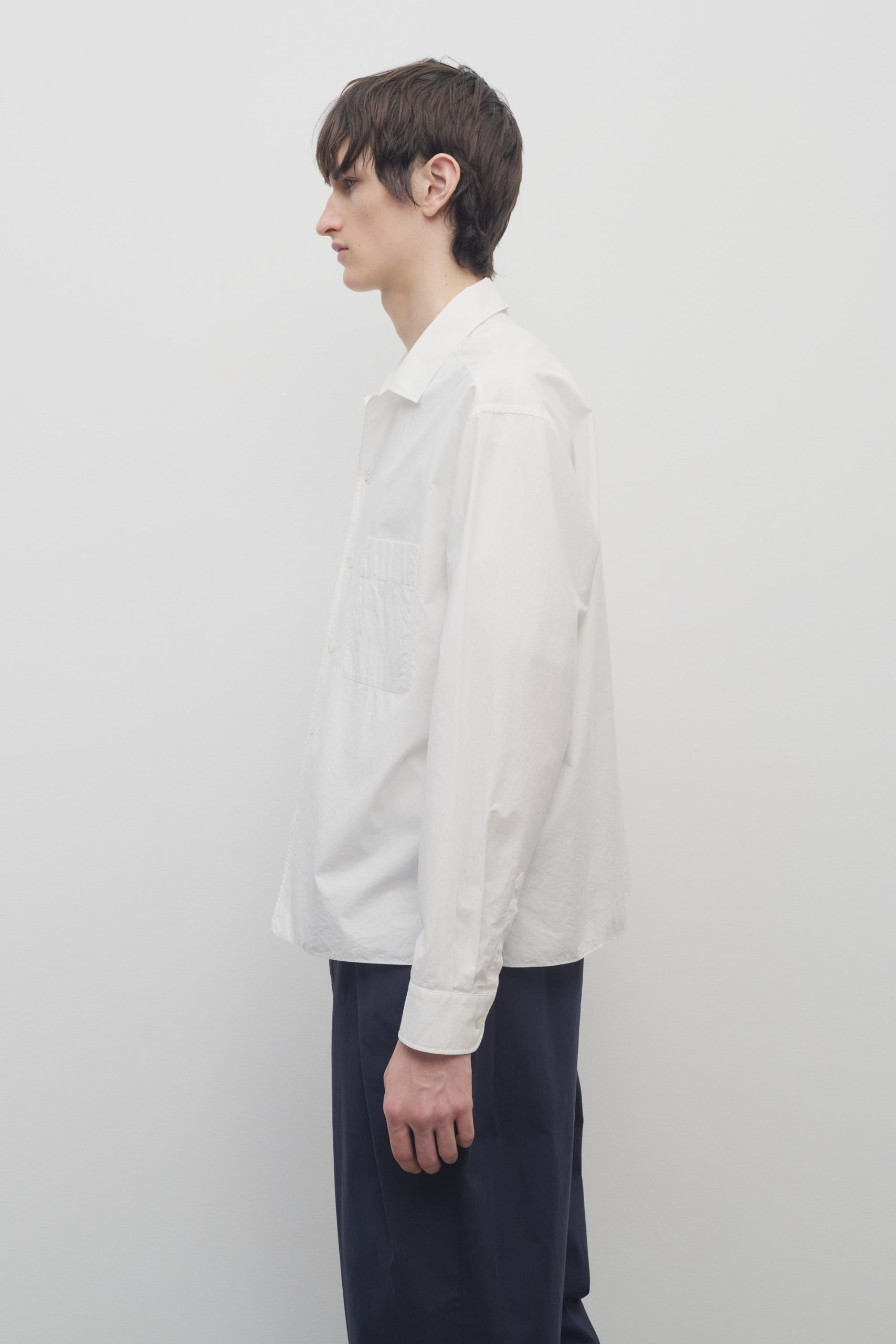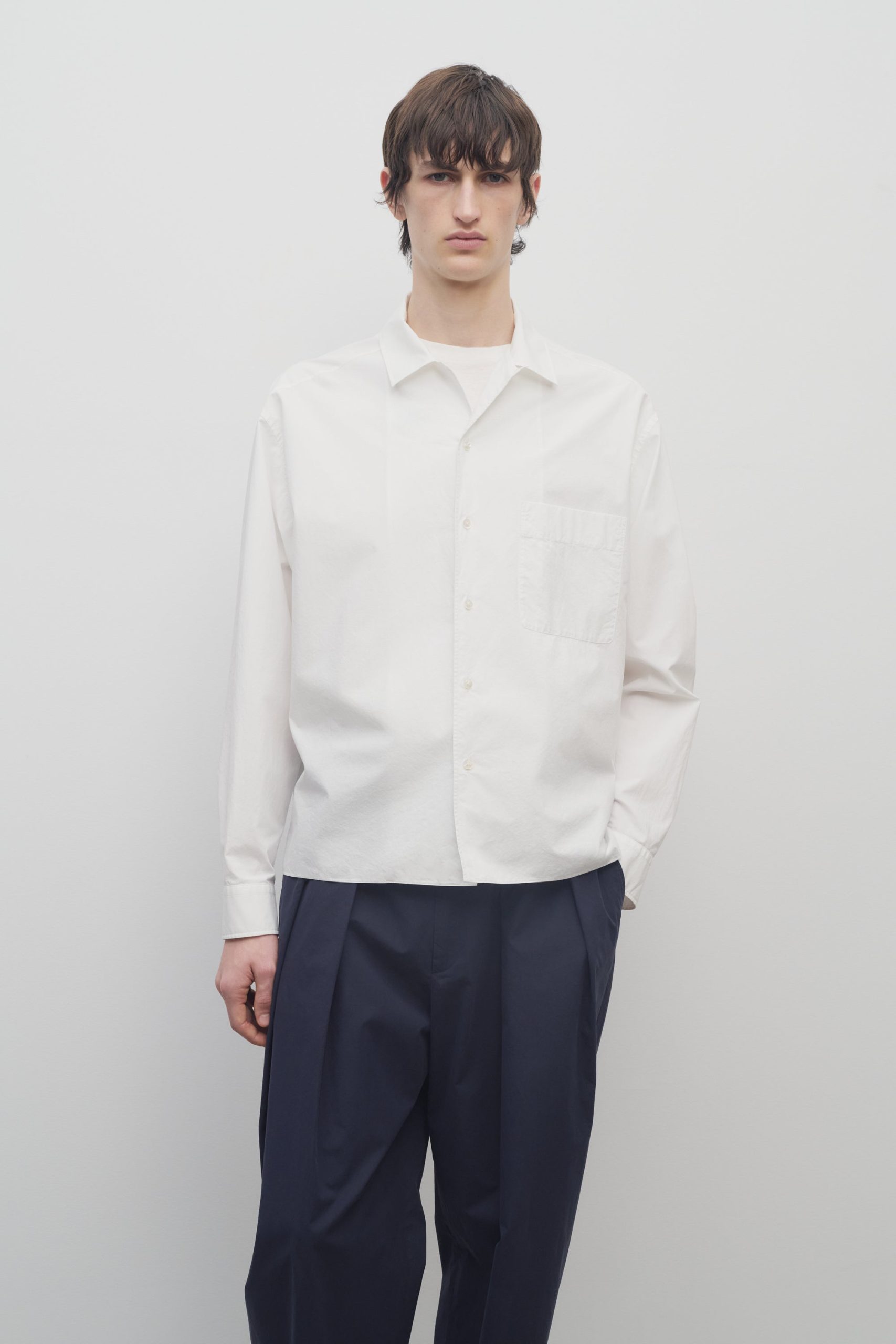 Boxy button-up shirt in washed cotton poplin with front patch pocket and exposed front placket with horn button closure.