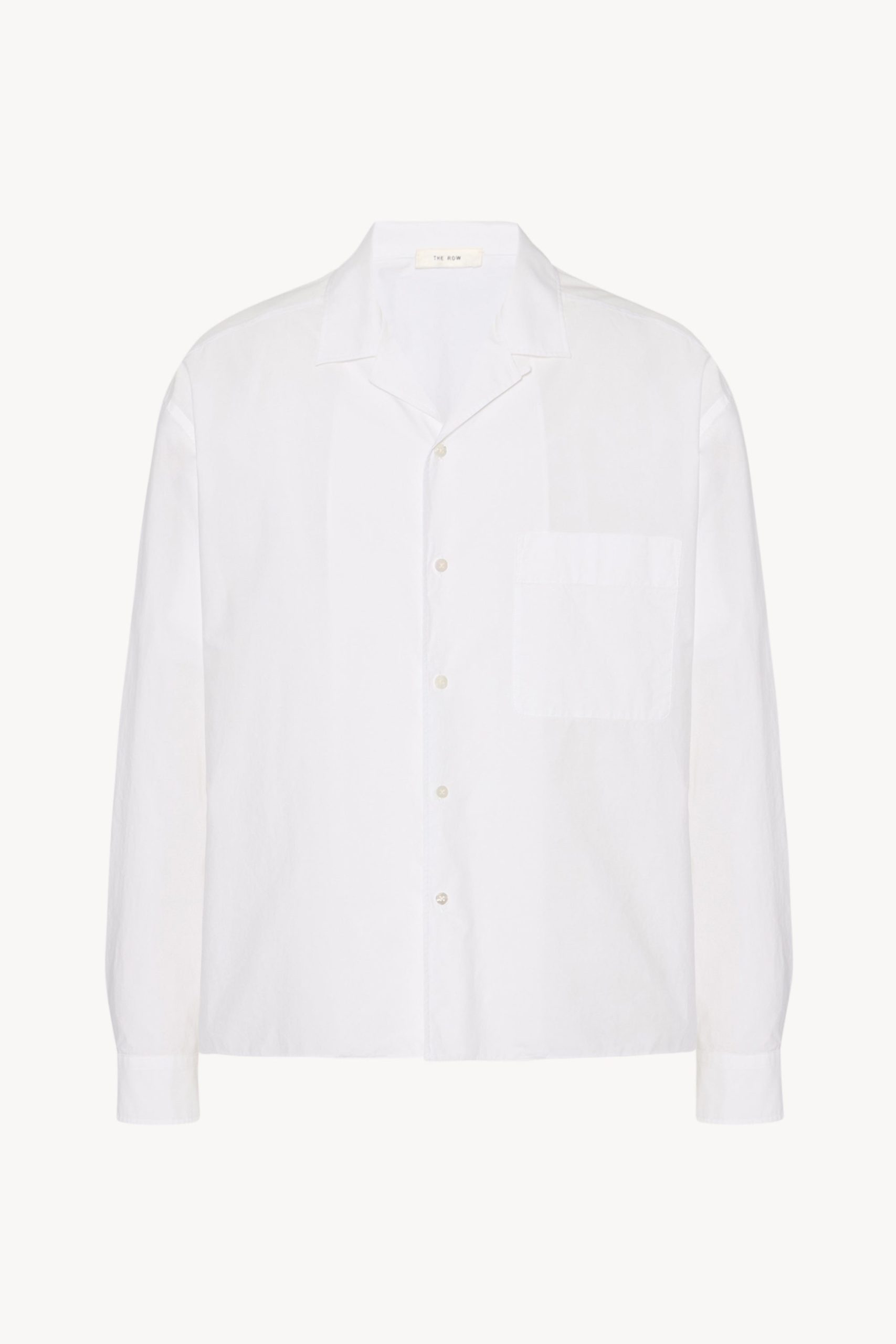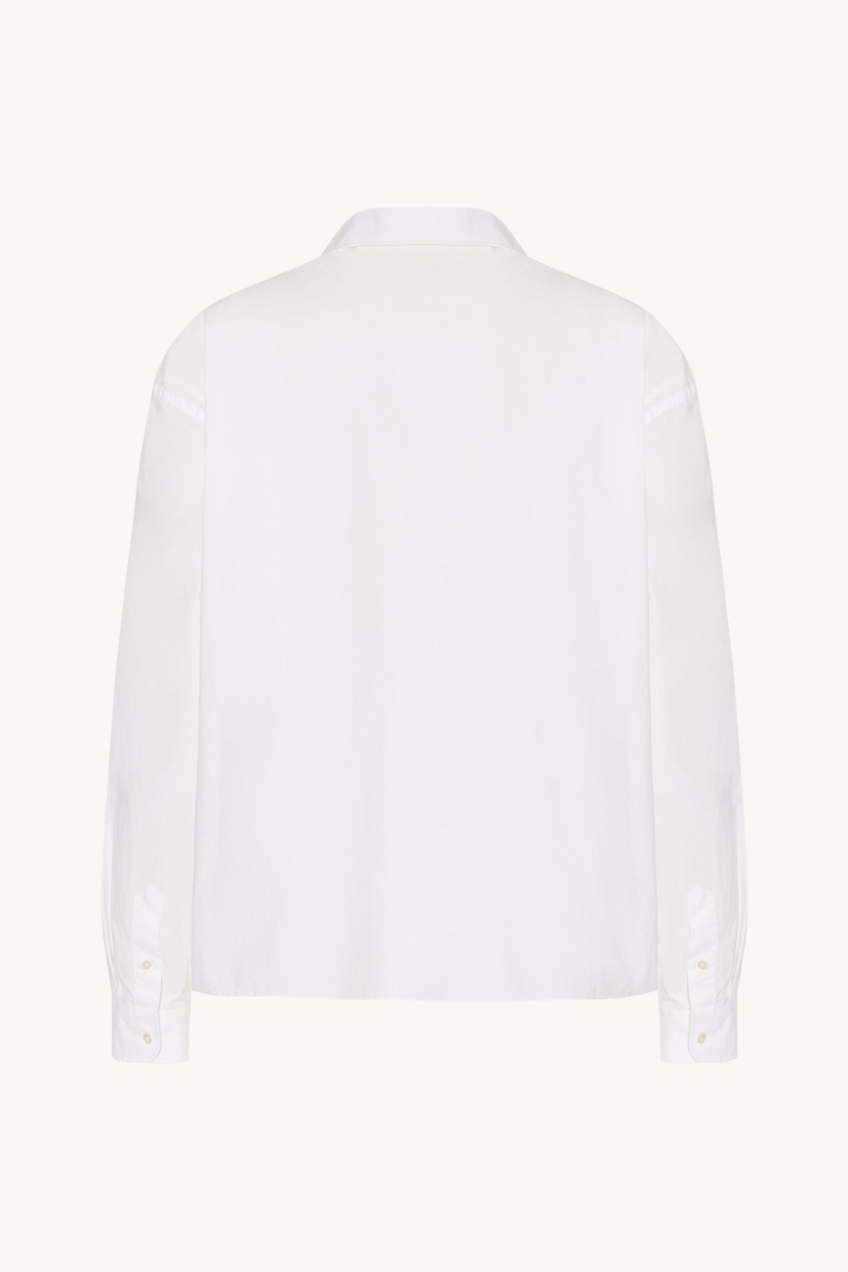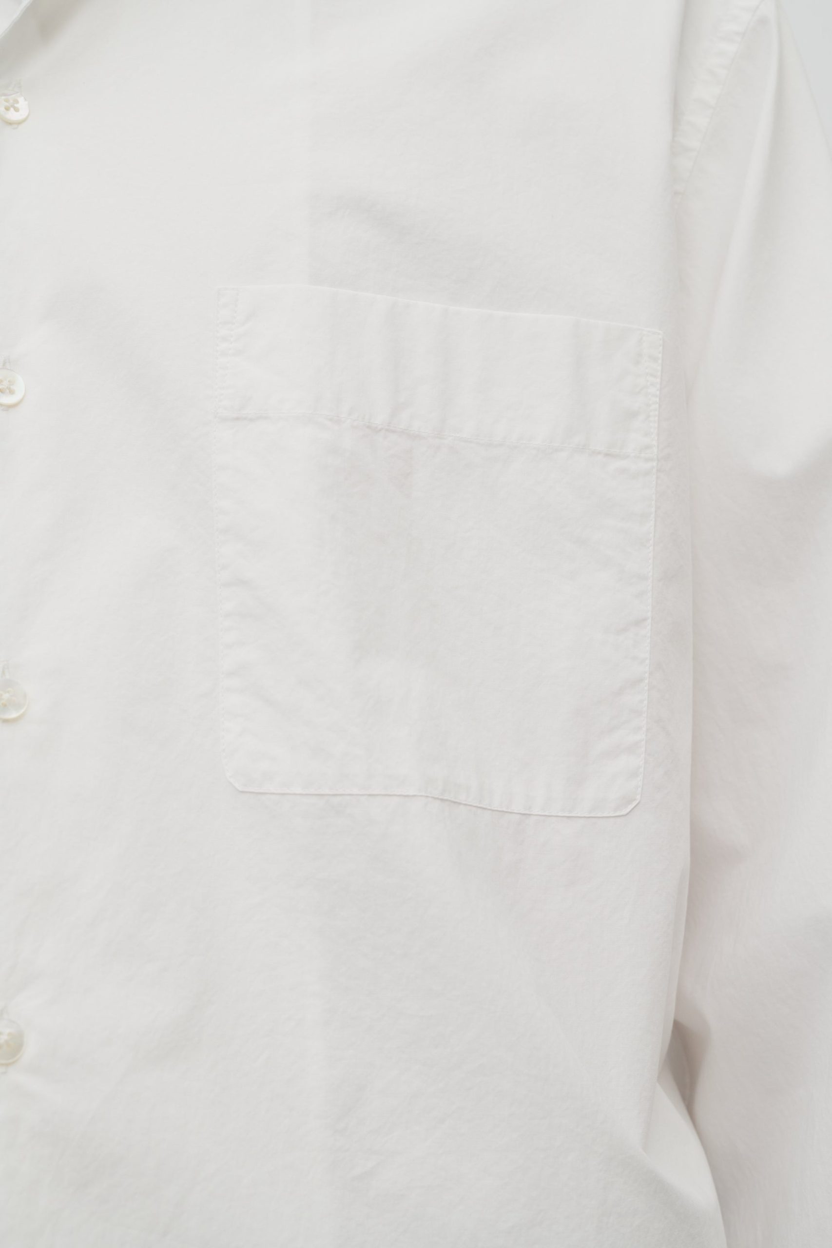 Boxy button-up shirt in washed cotton poplin with front patch pocket and exposed front placket with horn button closure.