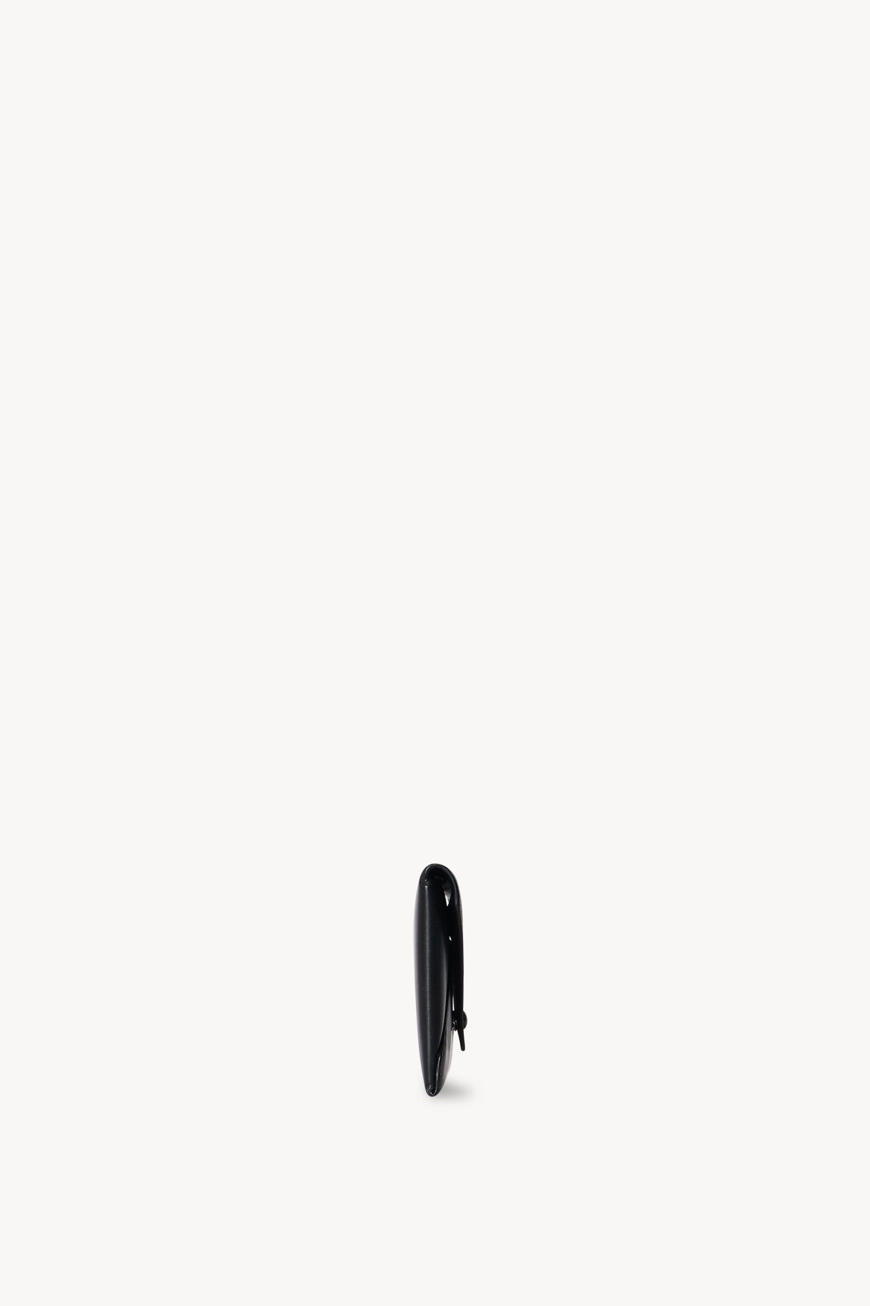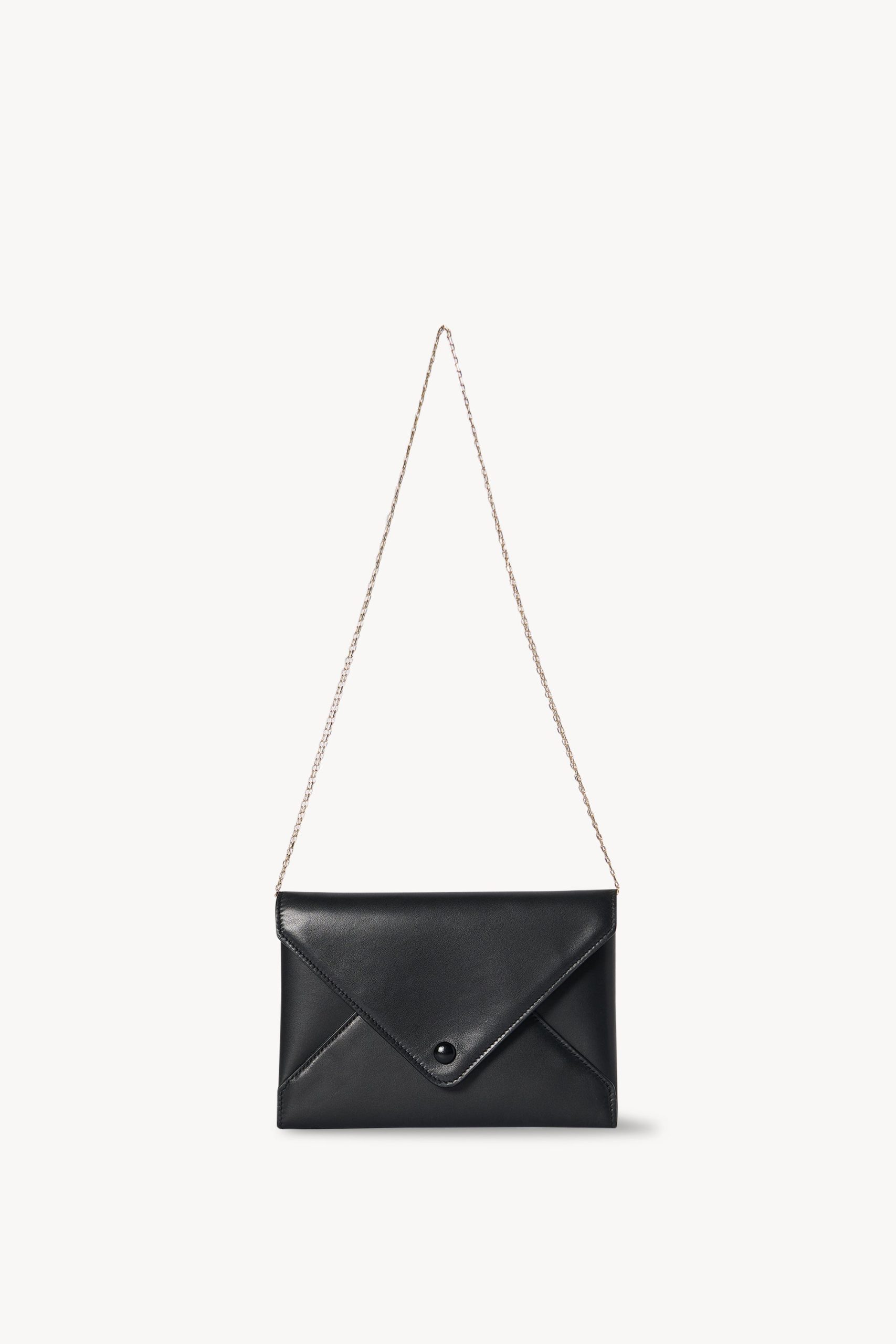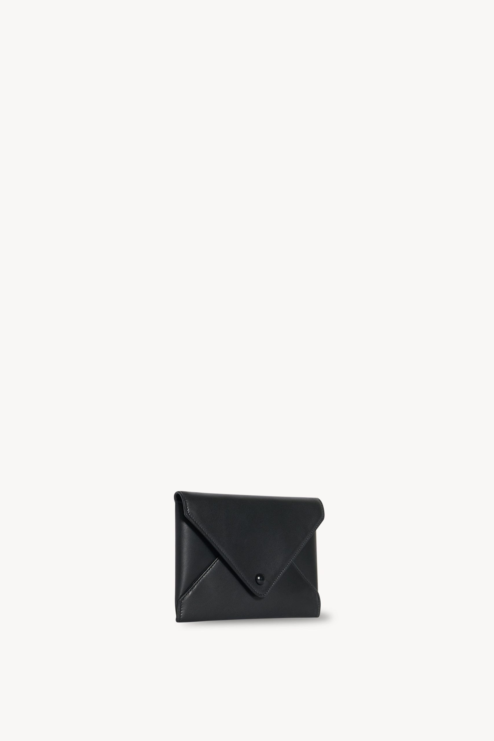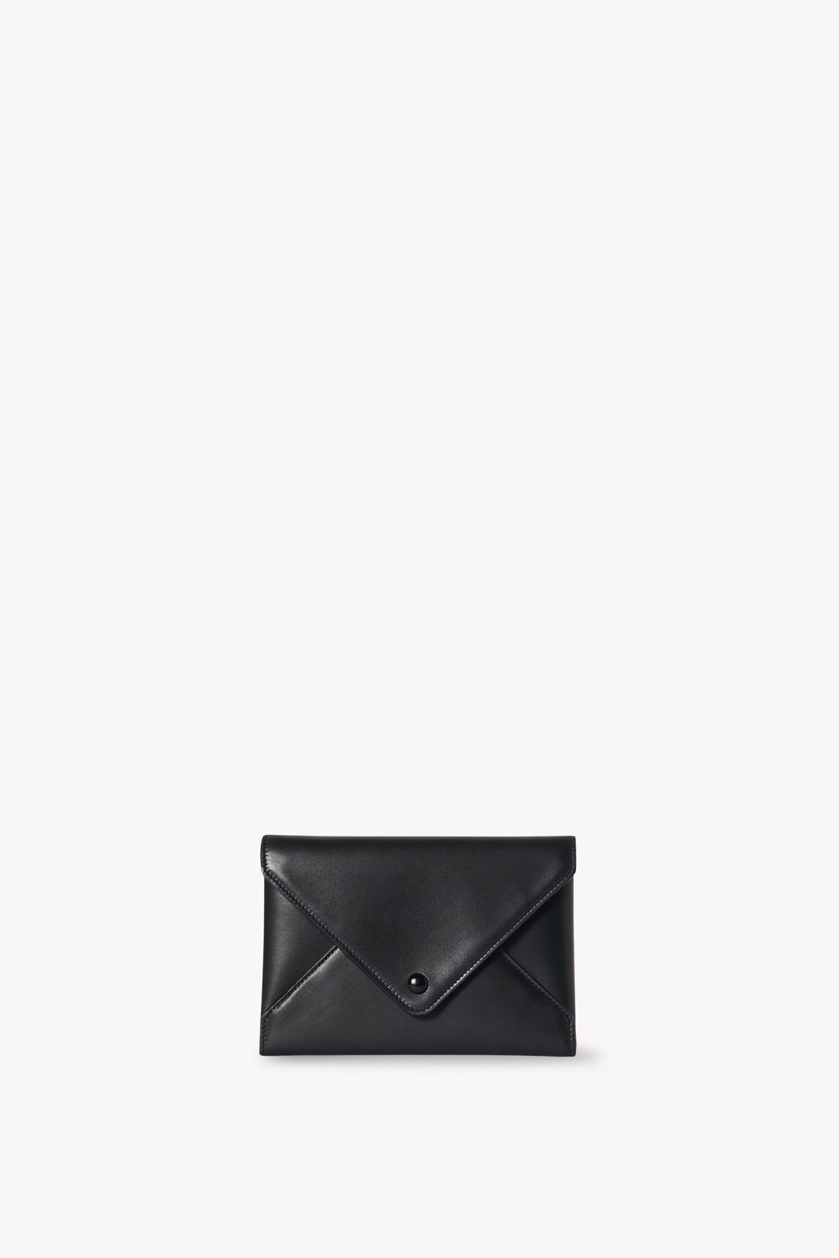 Rectangular clutch in smooth leather with folded construction and snap closure.
