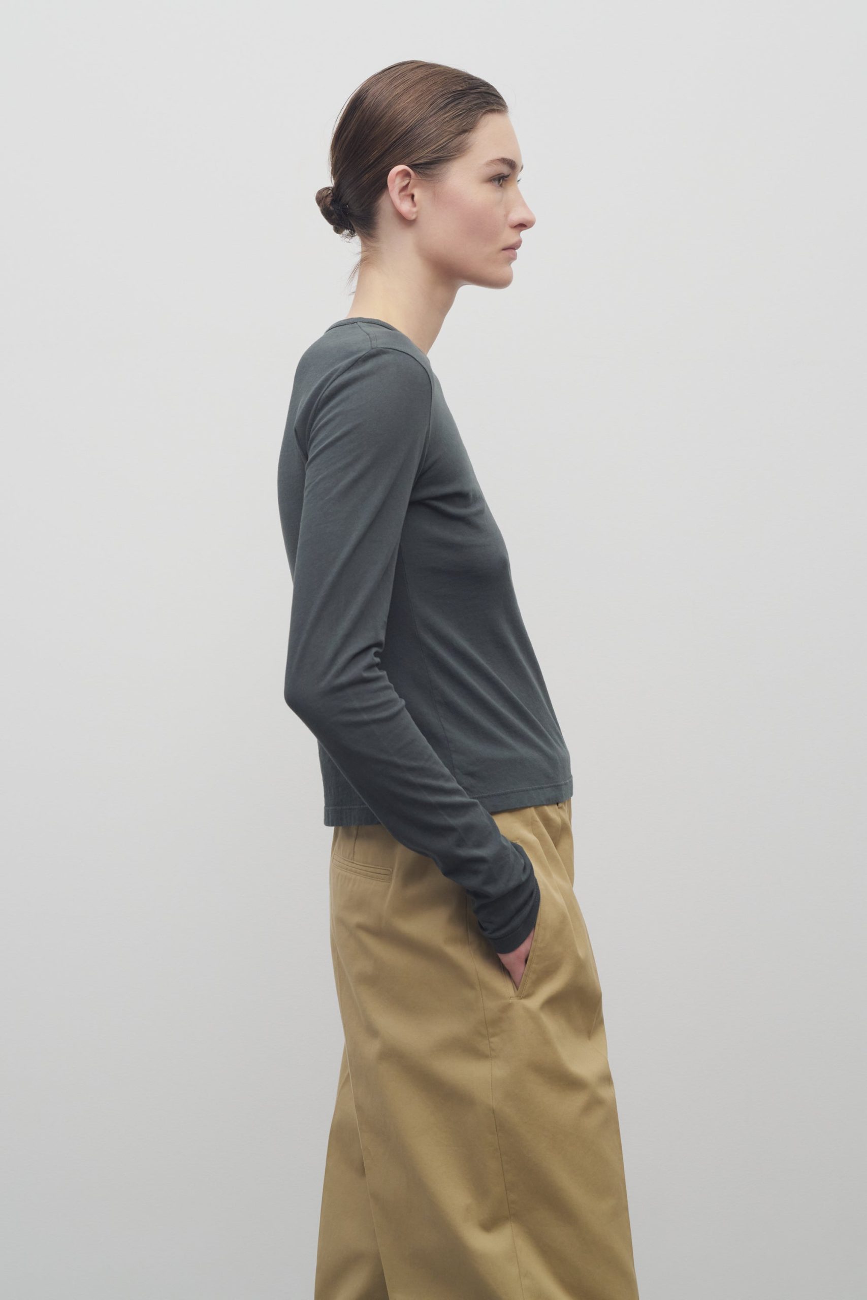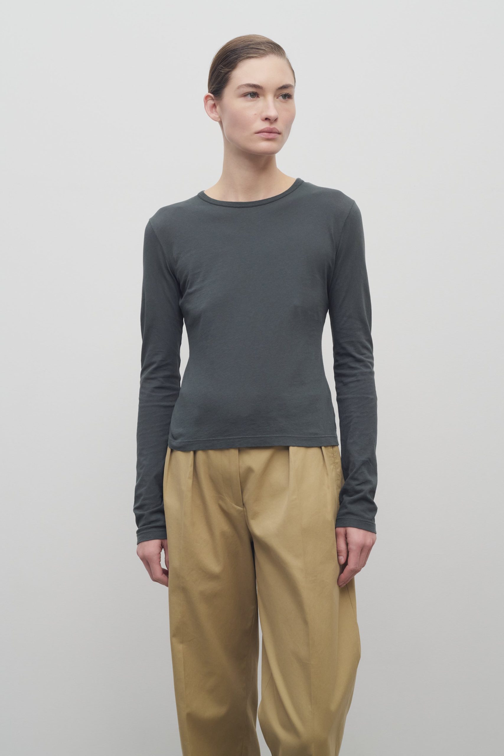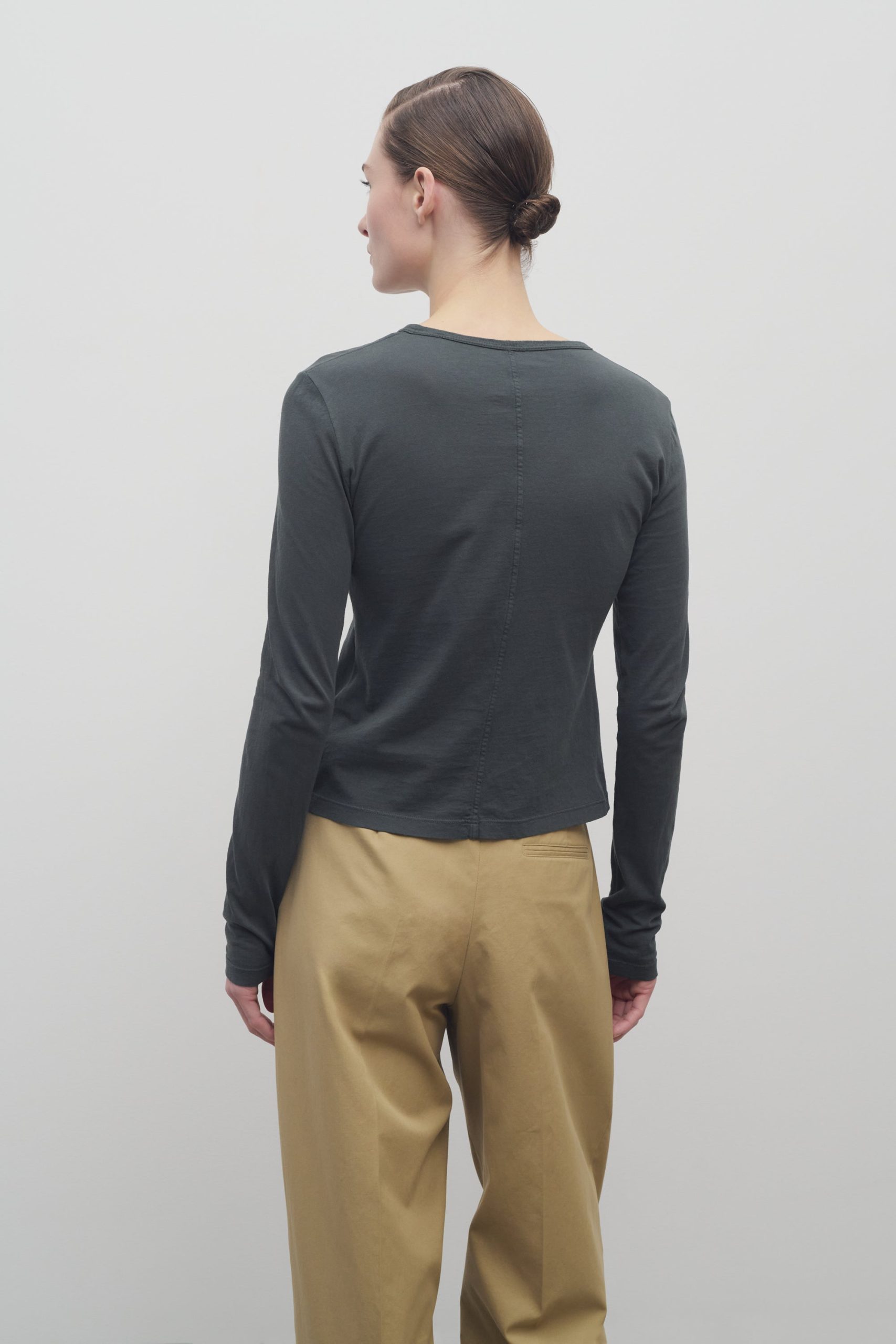 Light long-sleeved top in organic cotton jersey with slim fit. ribbed neckline. and signature center back detail.