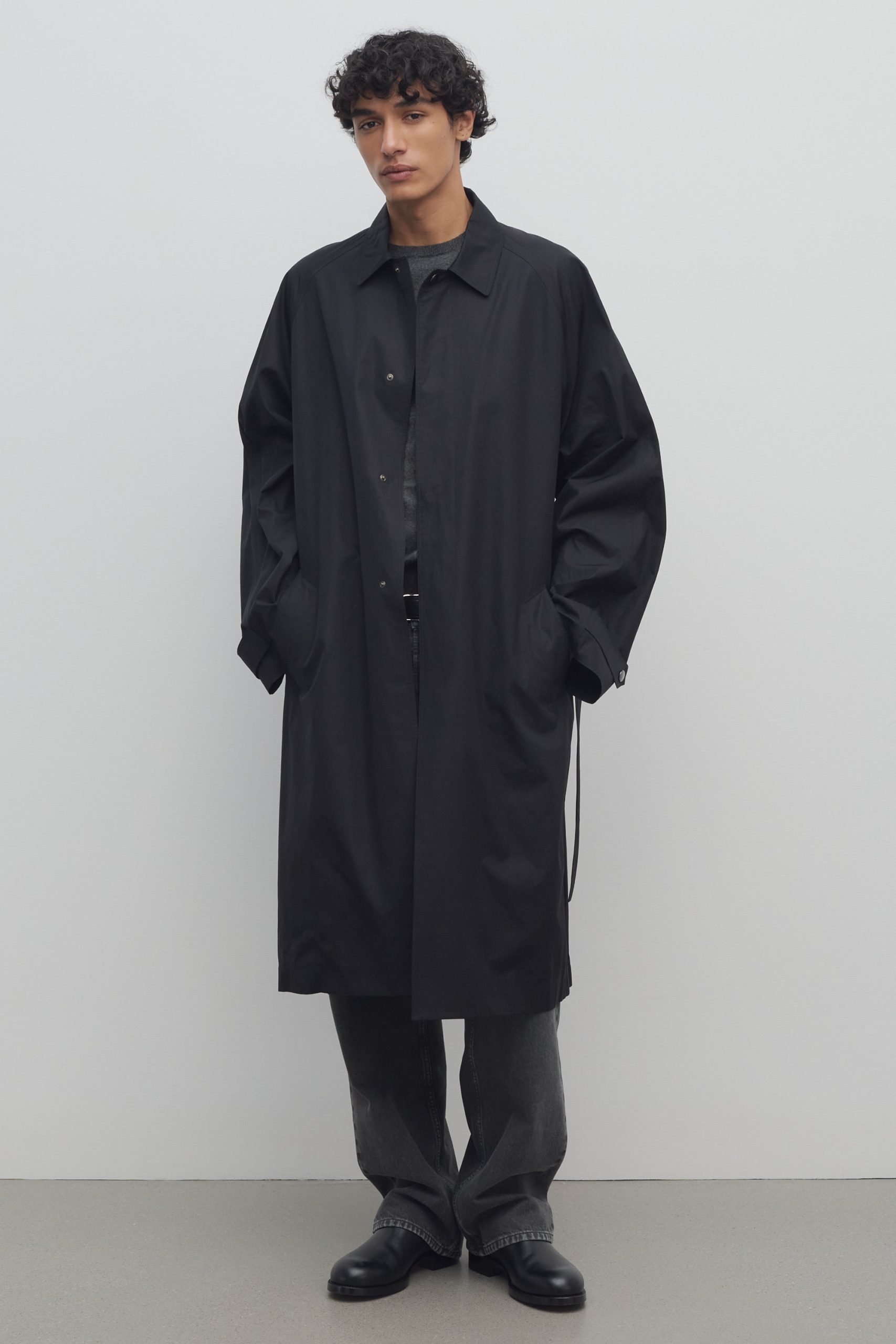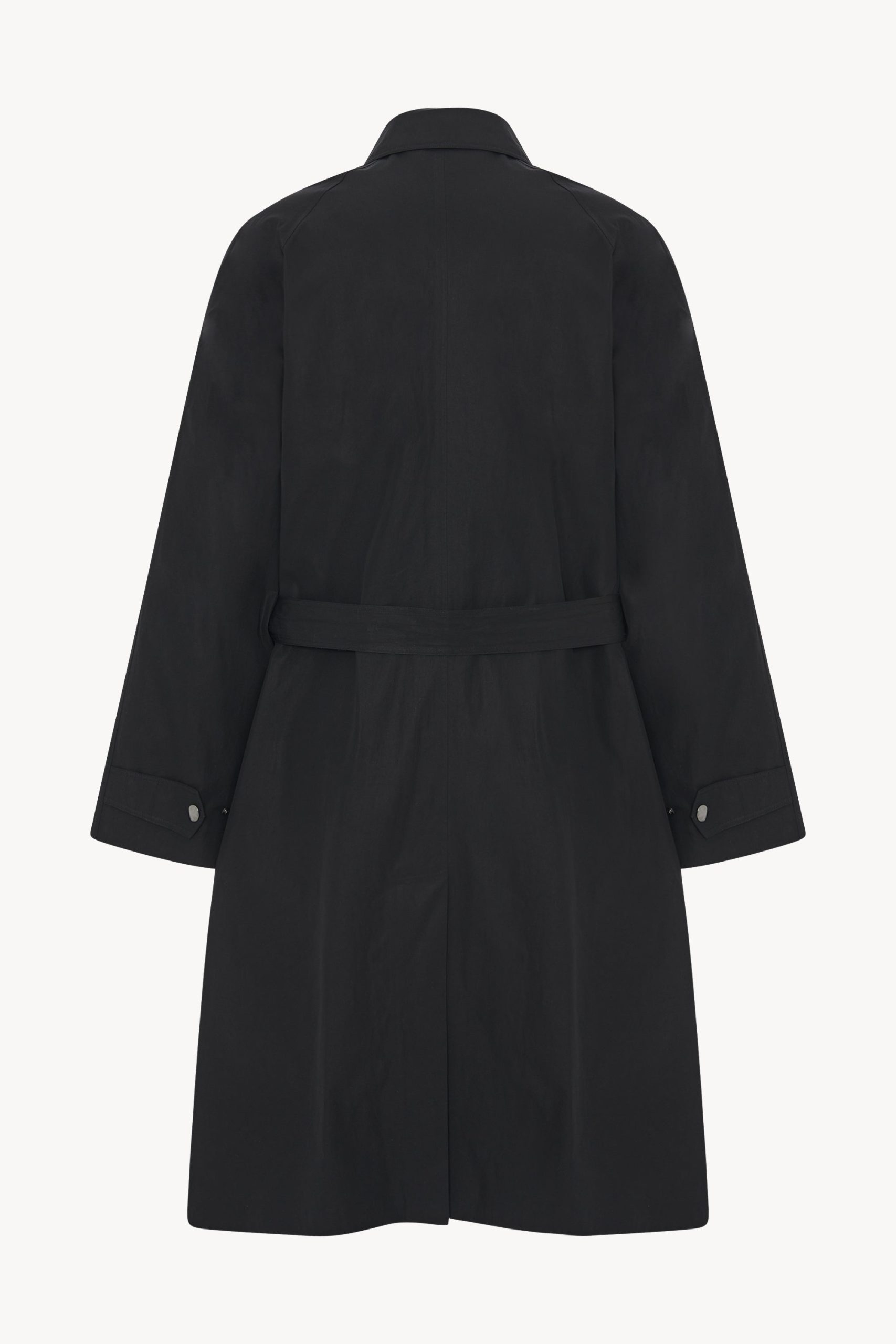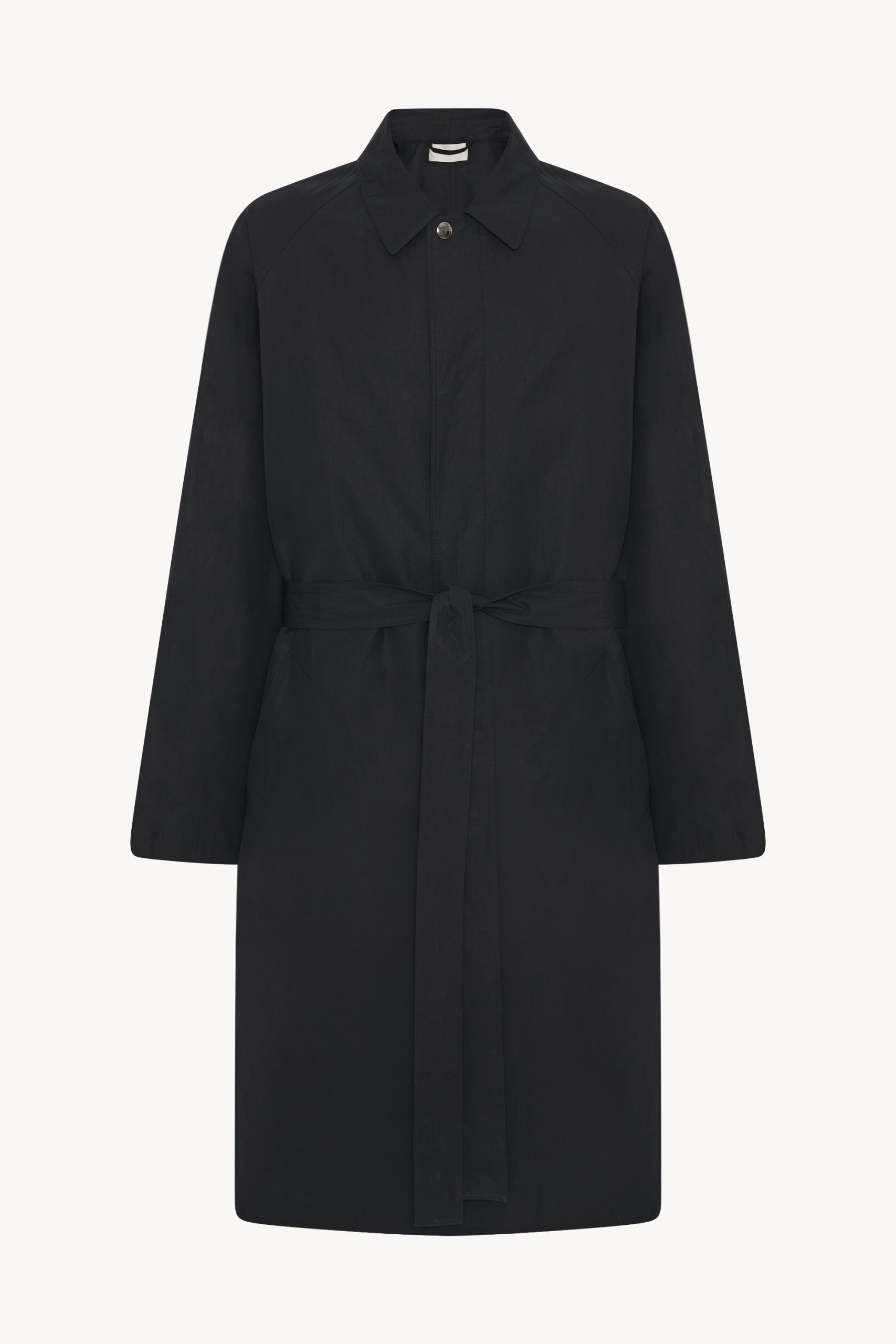 Single-breasted trench coat in Pima cotton poplin with raglan sleeves. side welt pockets. removable belt. and concealed front placket with snap closure.