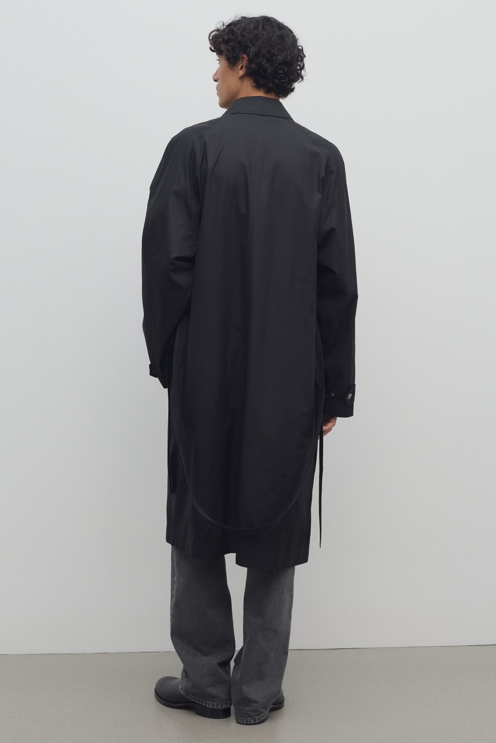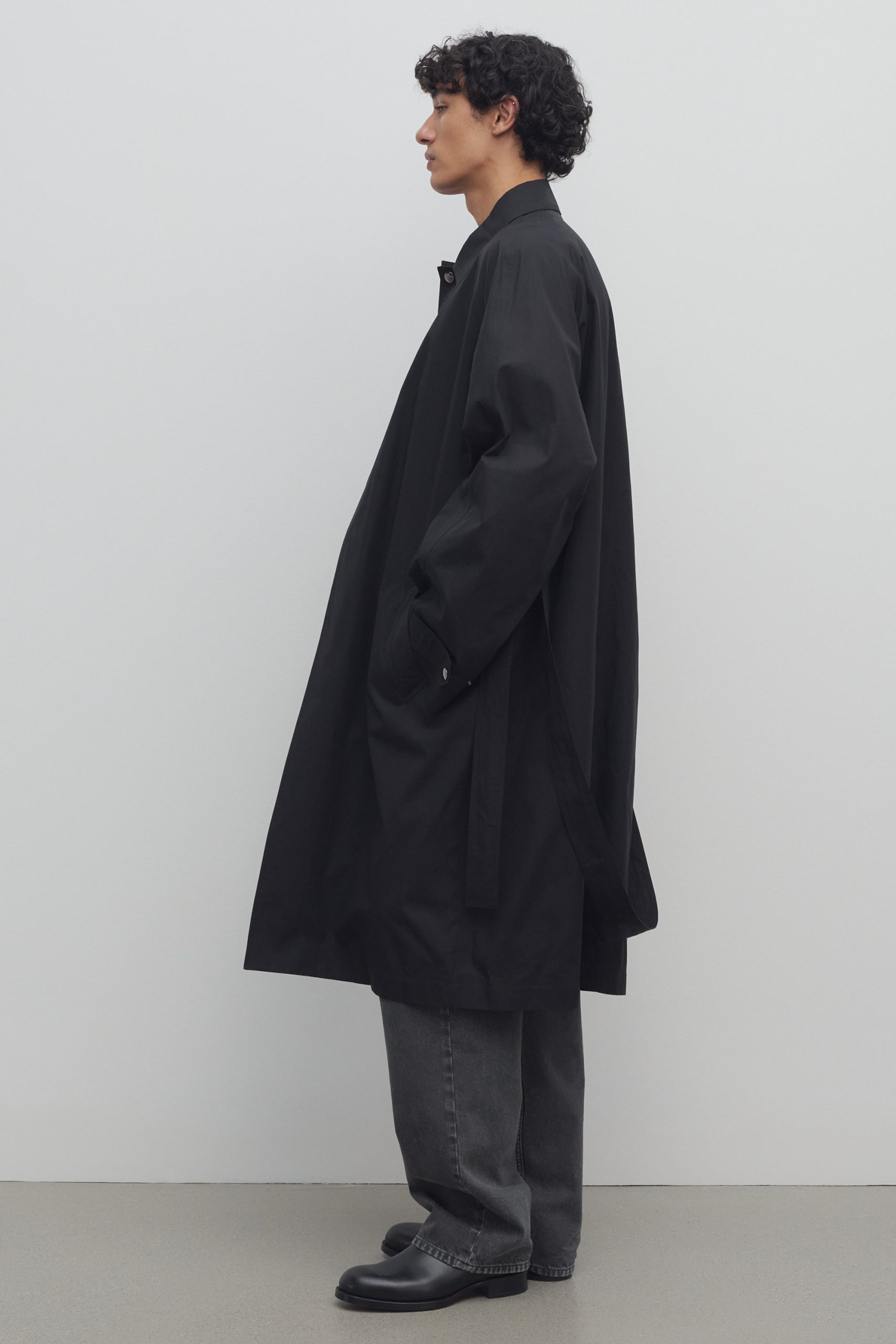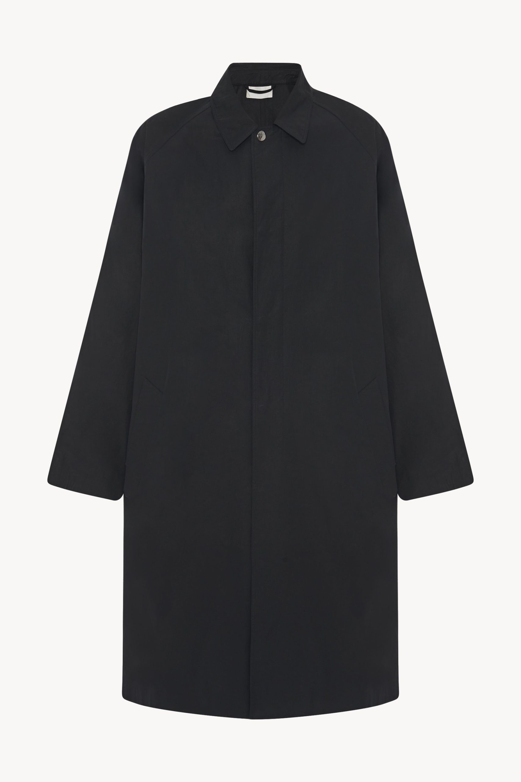 Single-breasted trench coat in Pima cotton poplin with raglan sleeves. side welt pockets. removable belt. and concealed front placket with snap closure.