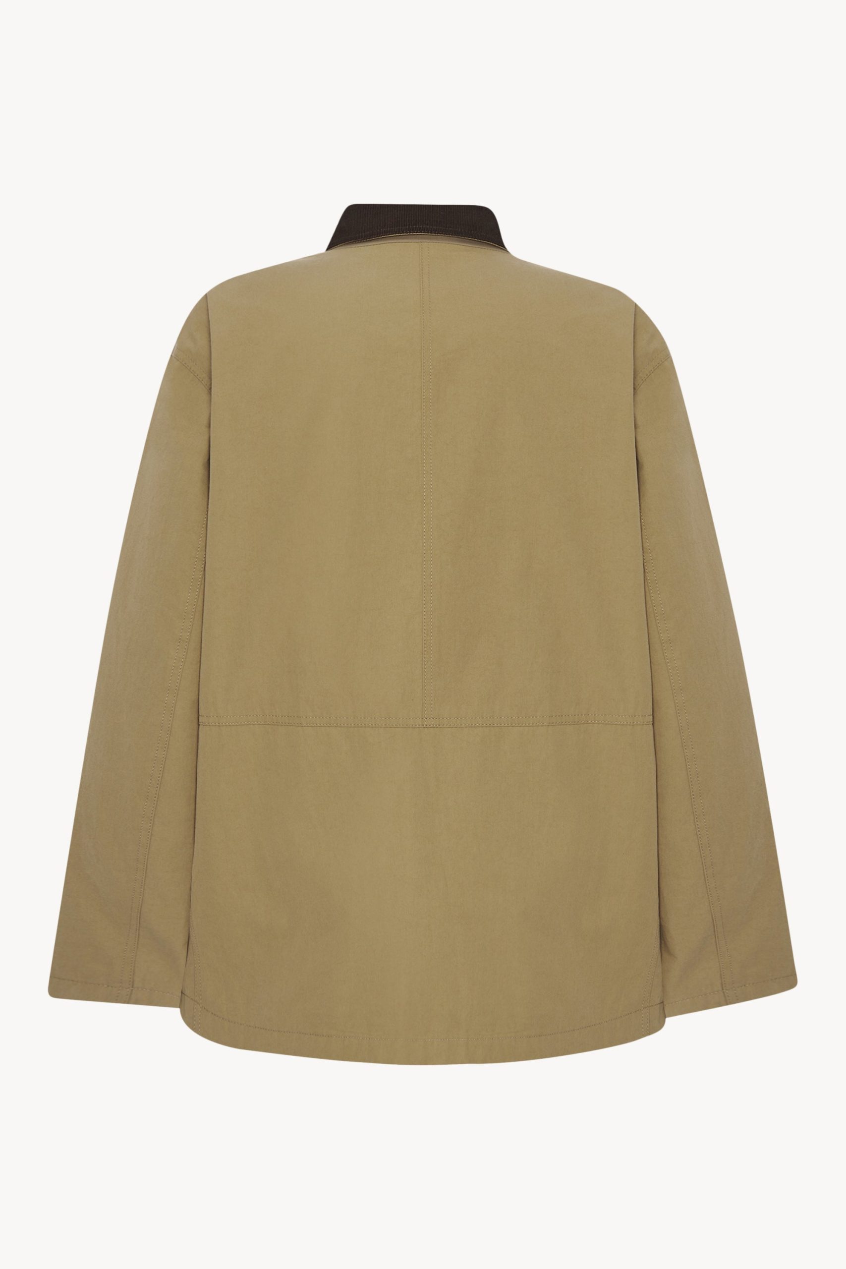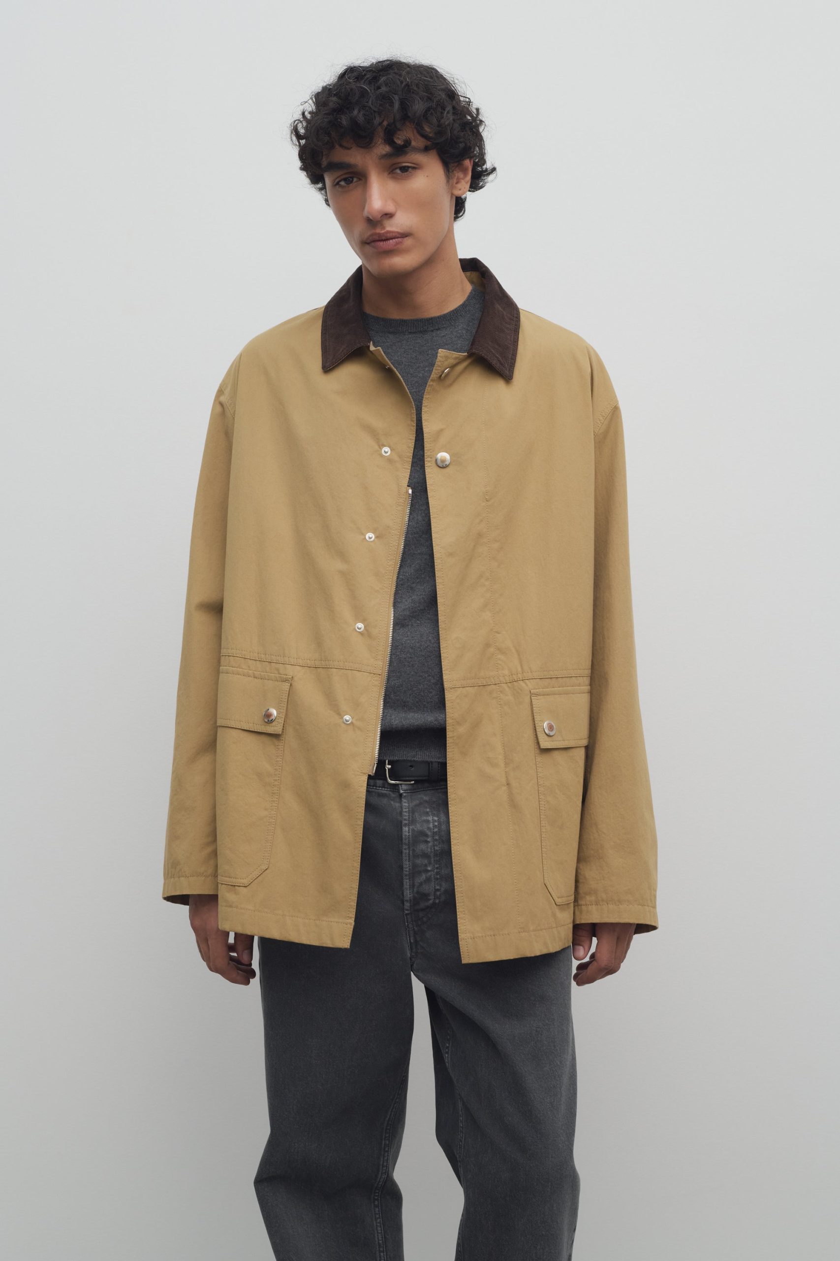 Outdoor jacket in enzyme-washed cotton with contrast corduroy collar. front patch pockets. and concealed front placket with snap and zipper closure.