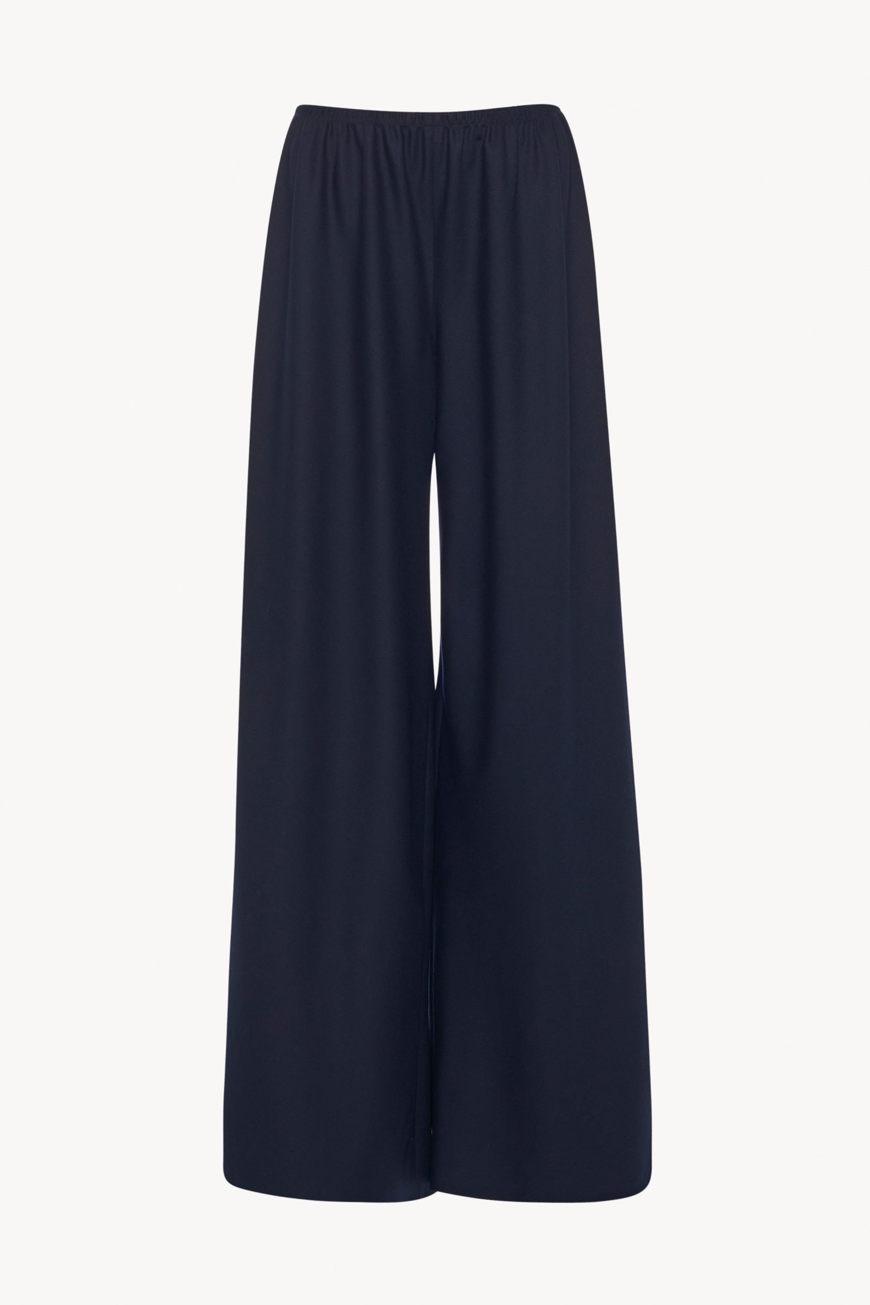 Bias-cut pant in fluid cady with slim gathered elastic waistband and fluid wide leg.