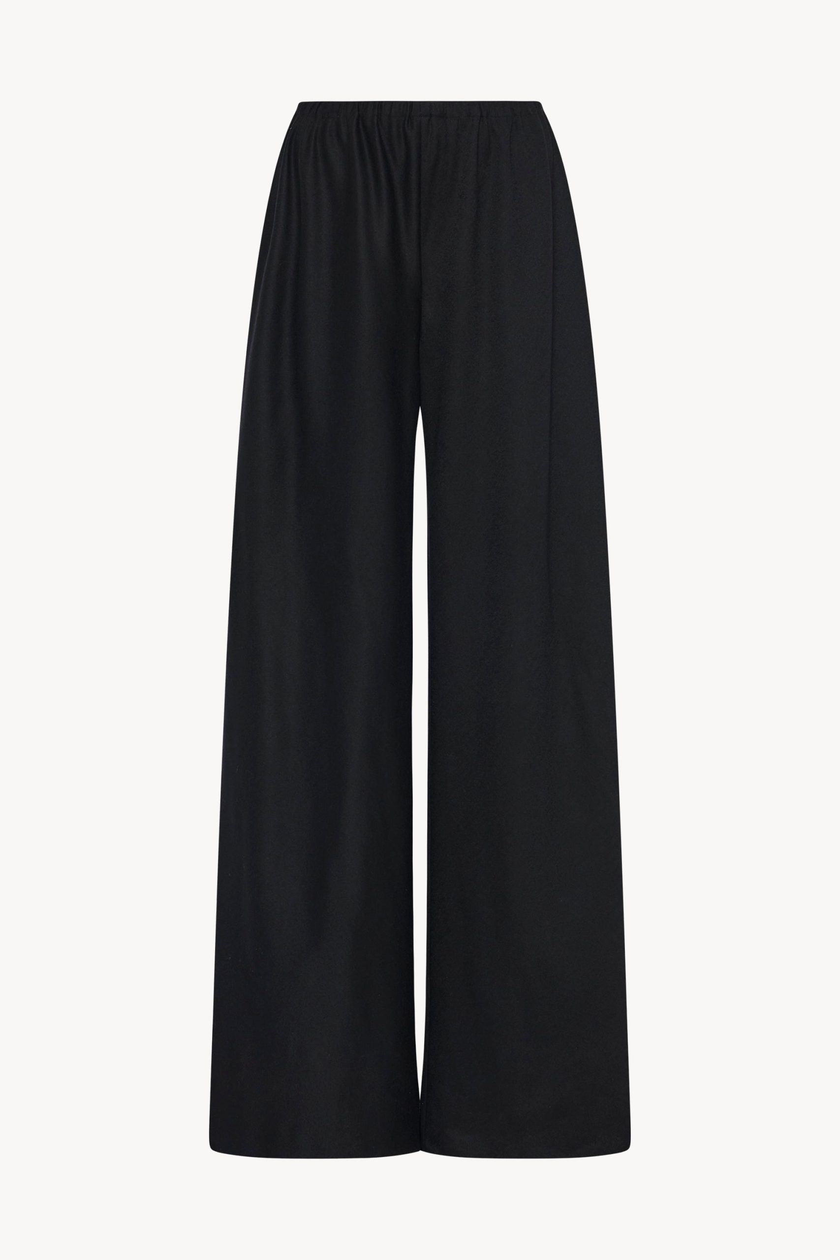Bias-cut pant in soft virgin wool flannel with slim gathered elastic waistband and fluid wide leg.