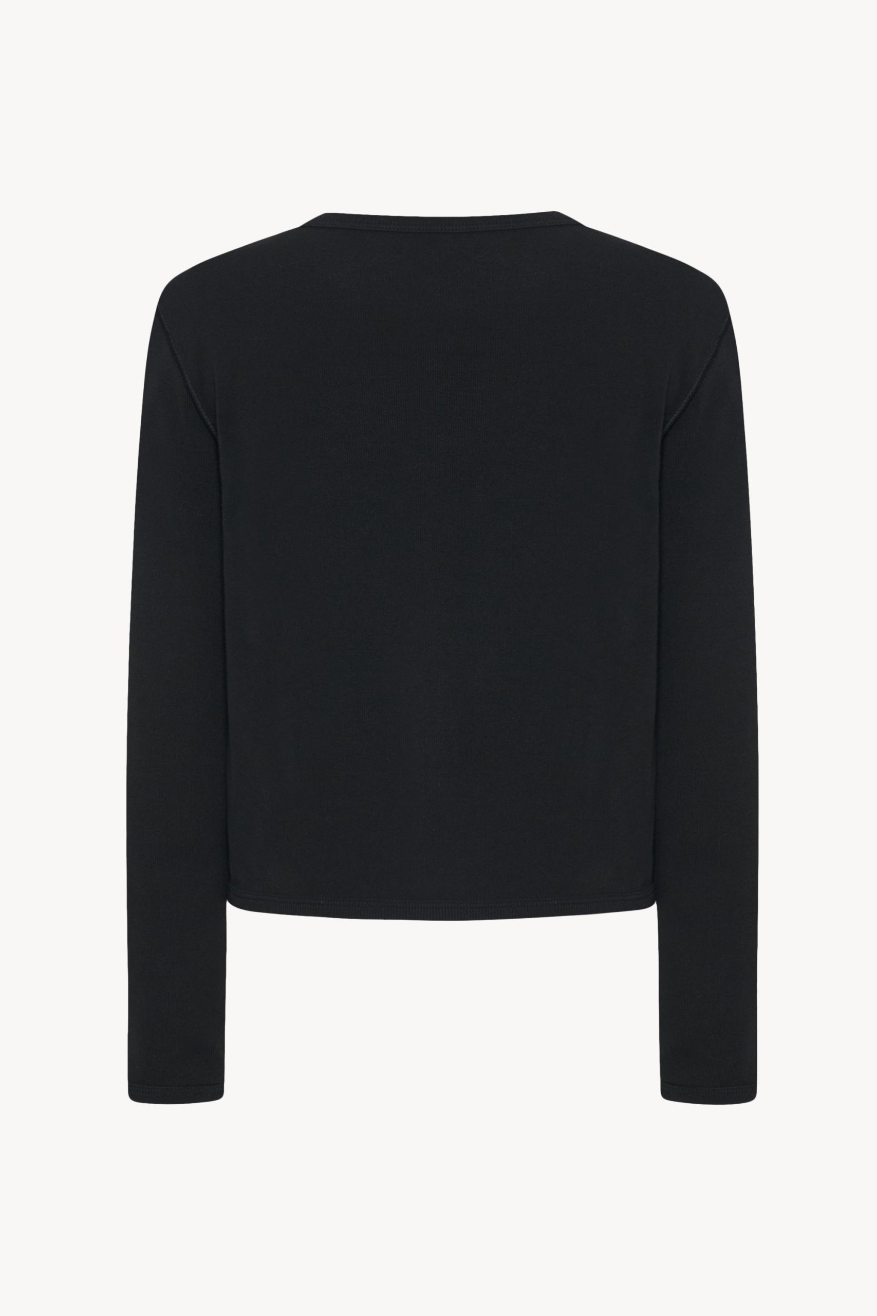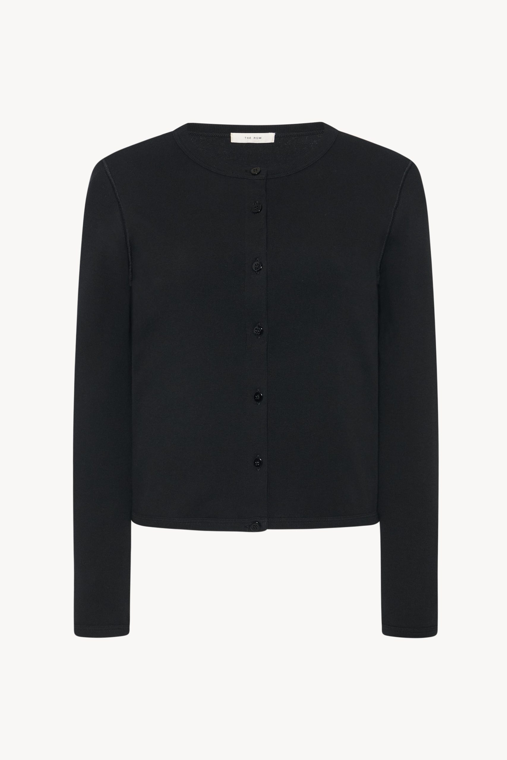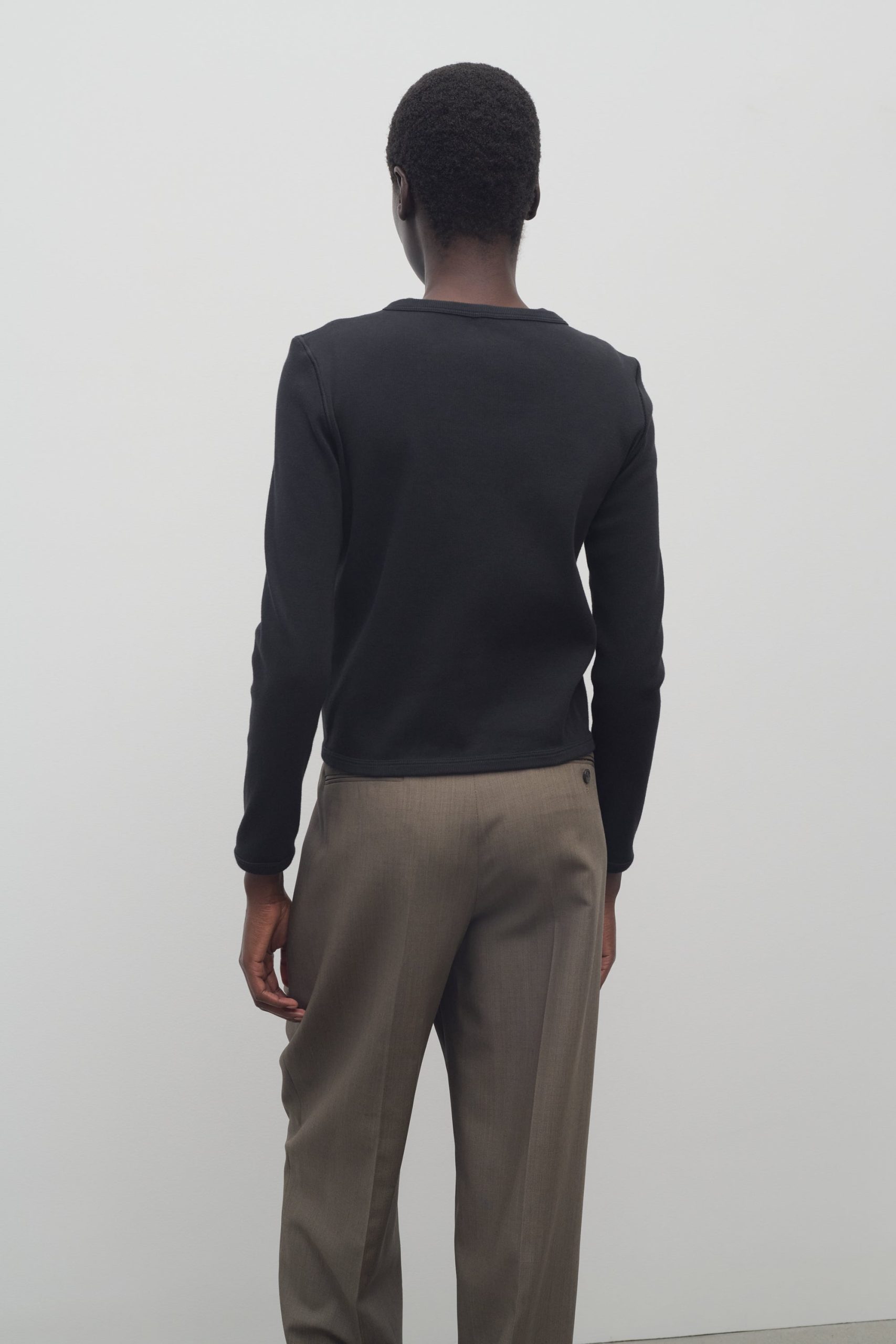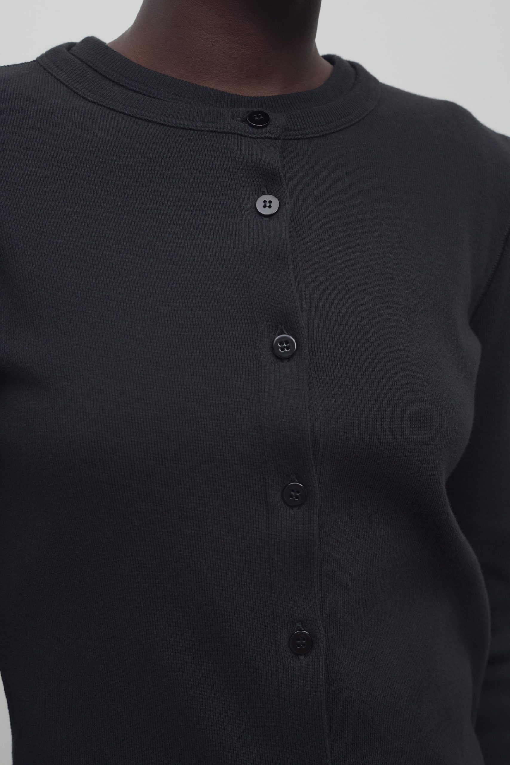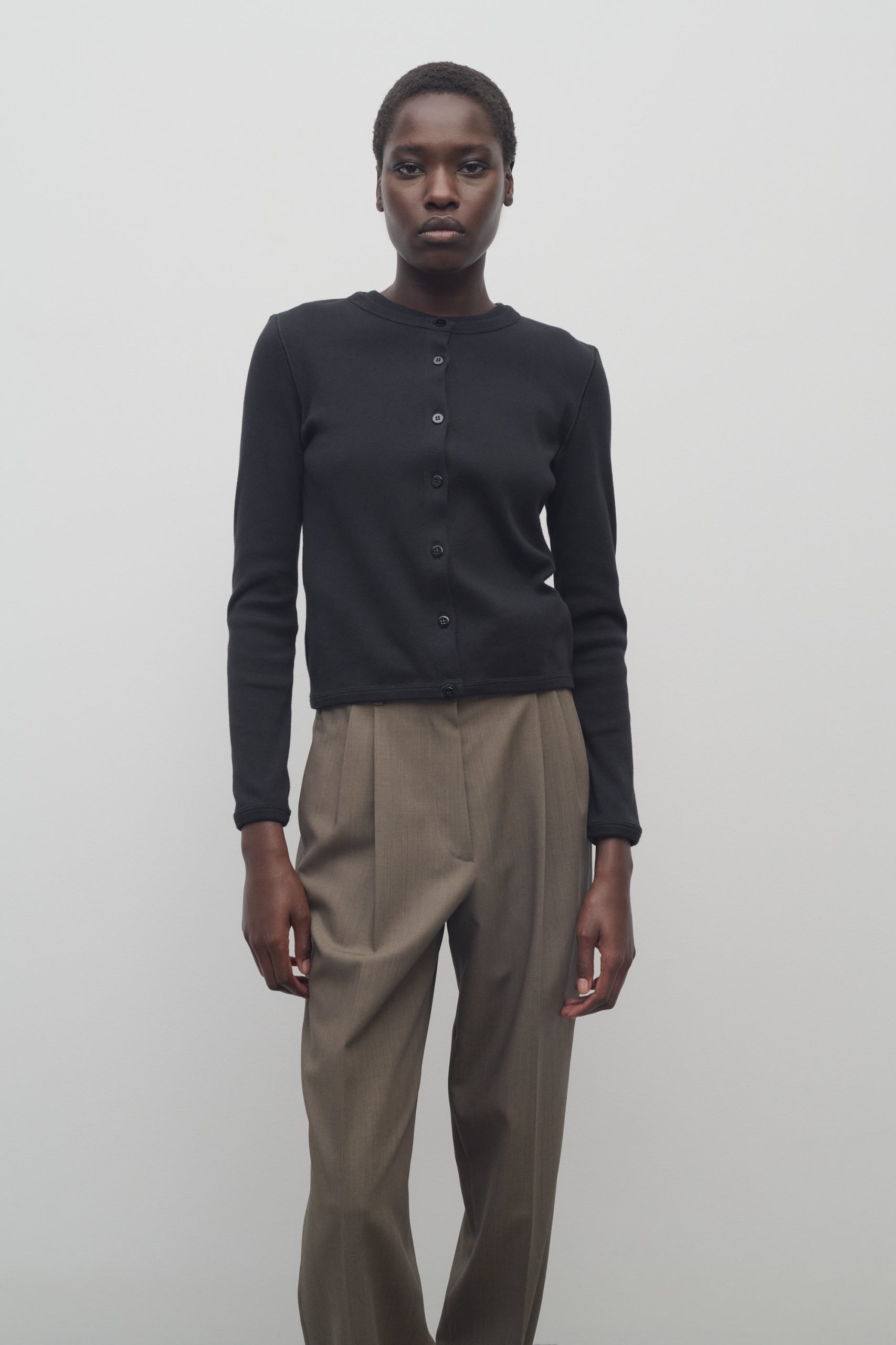 Shrunken long-sleeved cardigan in heavyweight ribbed Japanese cotton with front button closure and fitted silhouette.