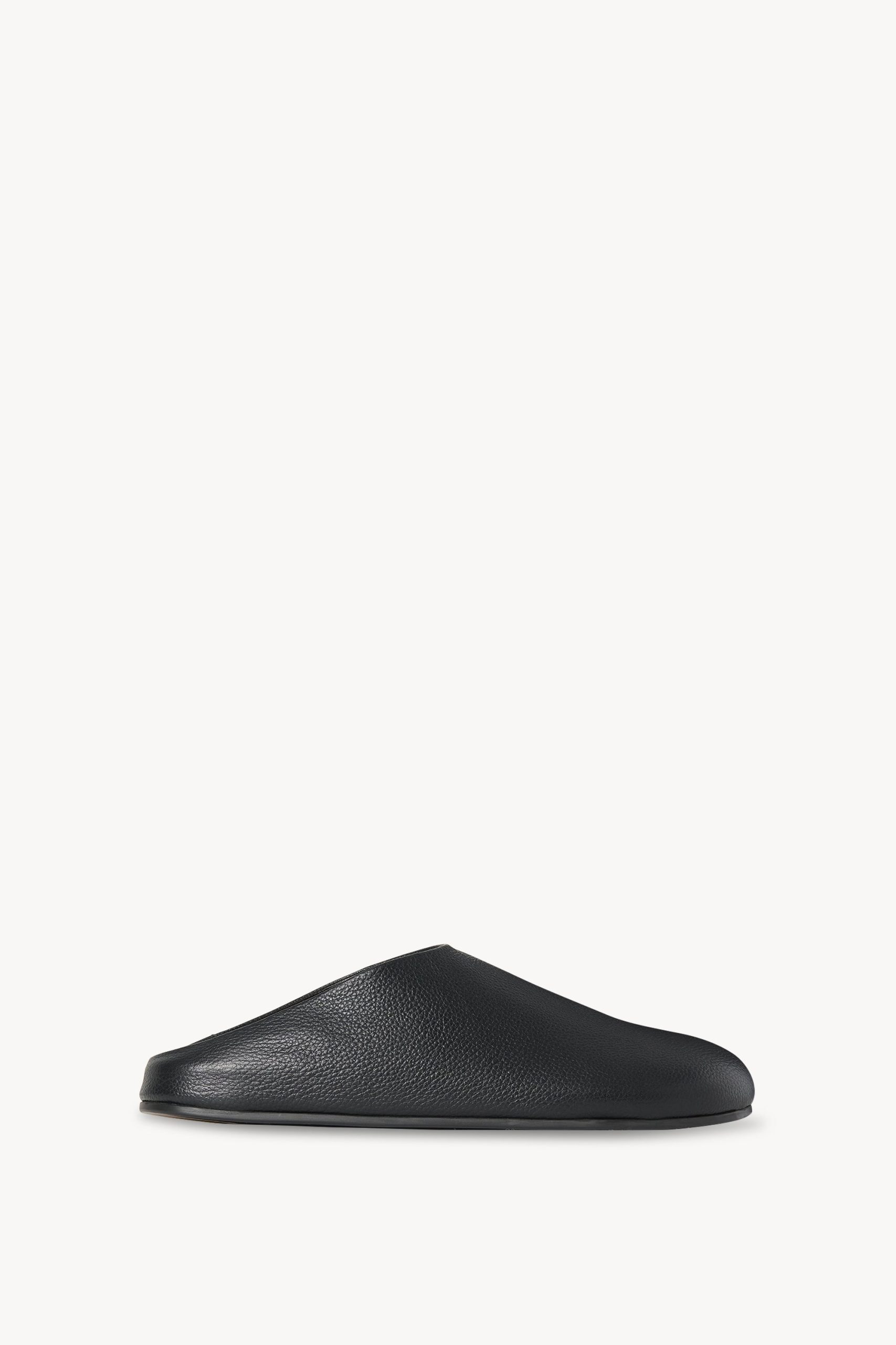 Relaxed slip-on shoe in grained calfskin leather and soft shearling with round toe. contoured footbed. and rubber sole.