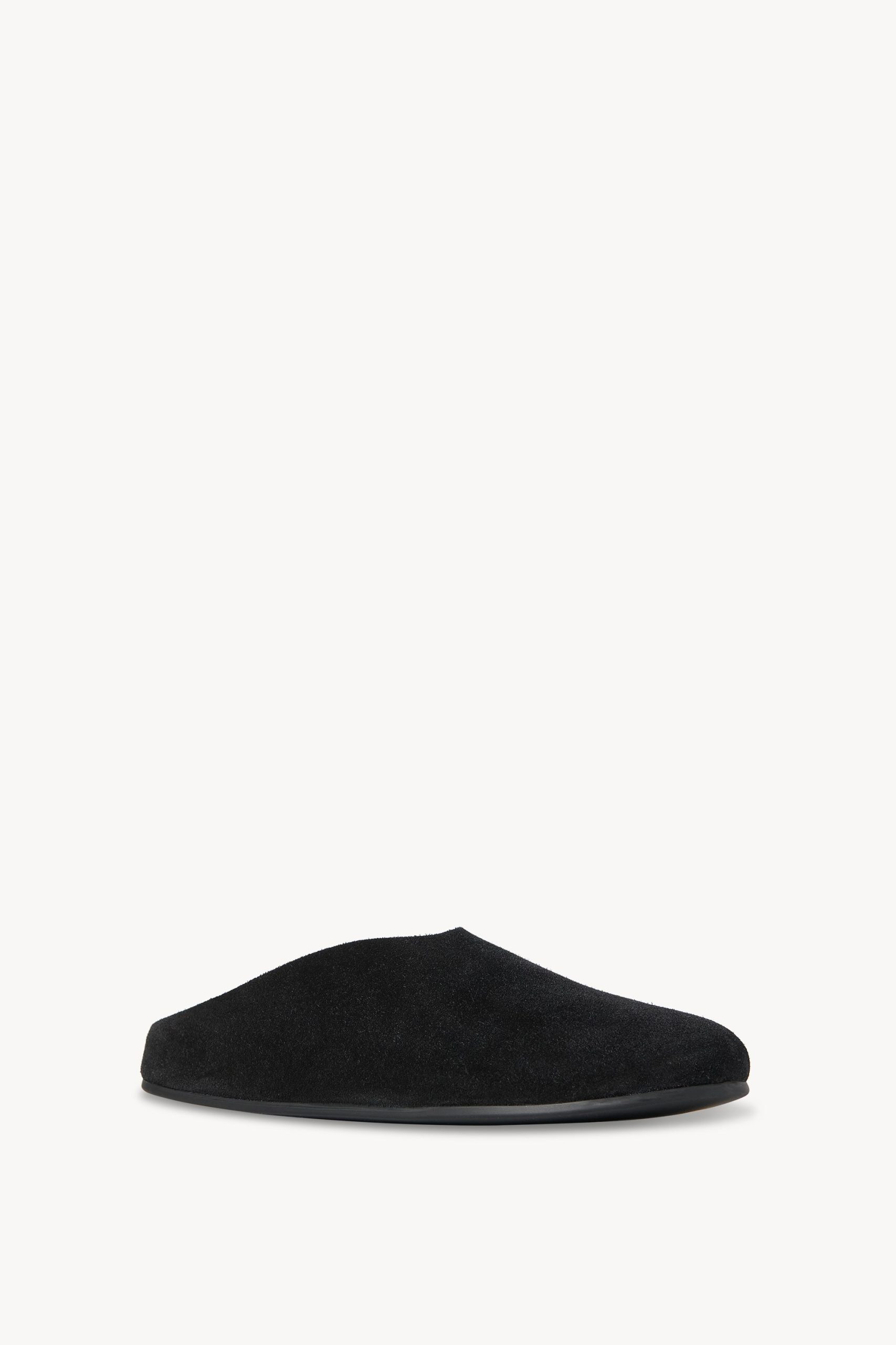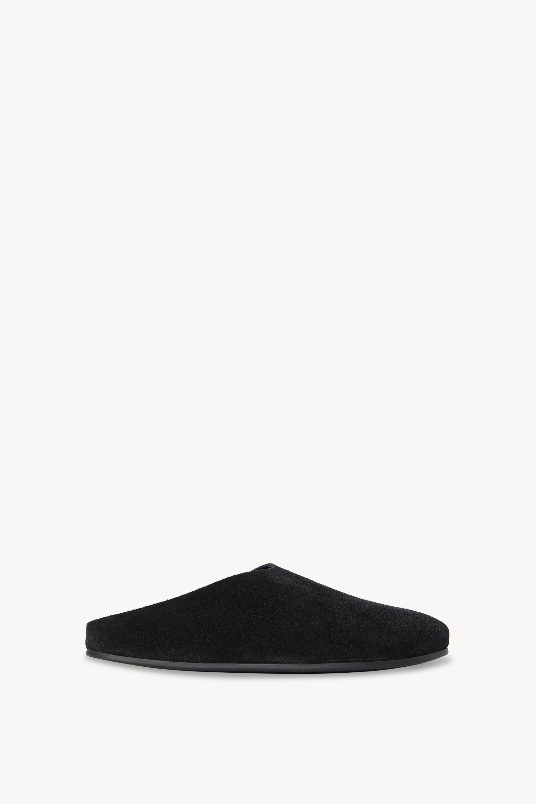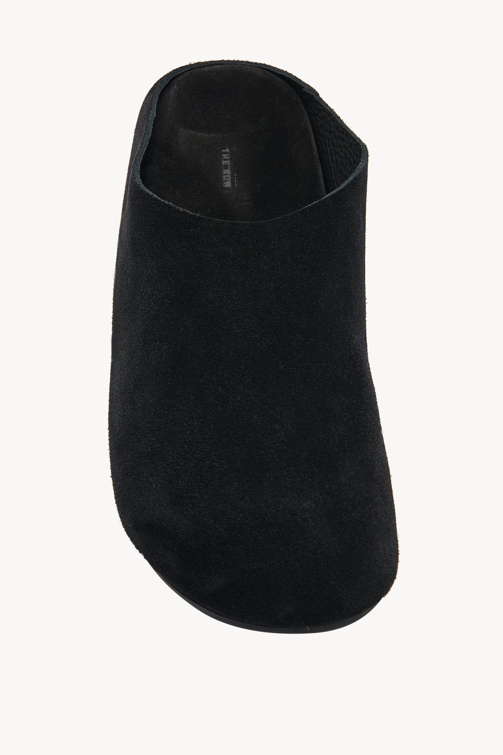 Relaxed slip-on shoe in natural suede with round toe. contoured footbed. and rubber sole.