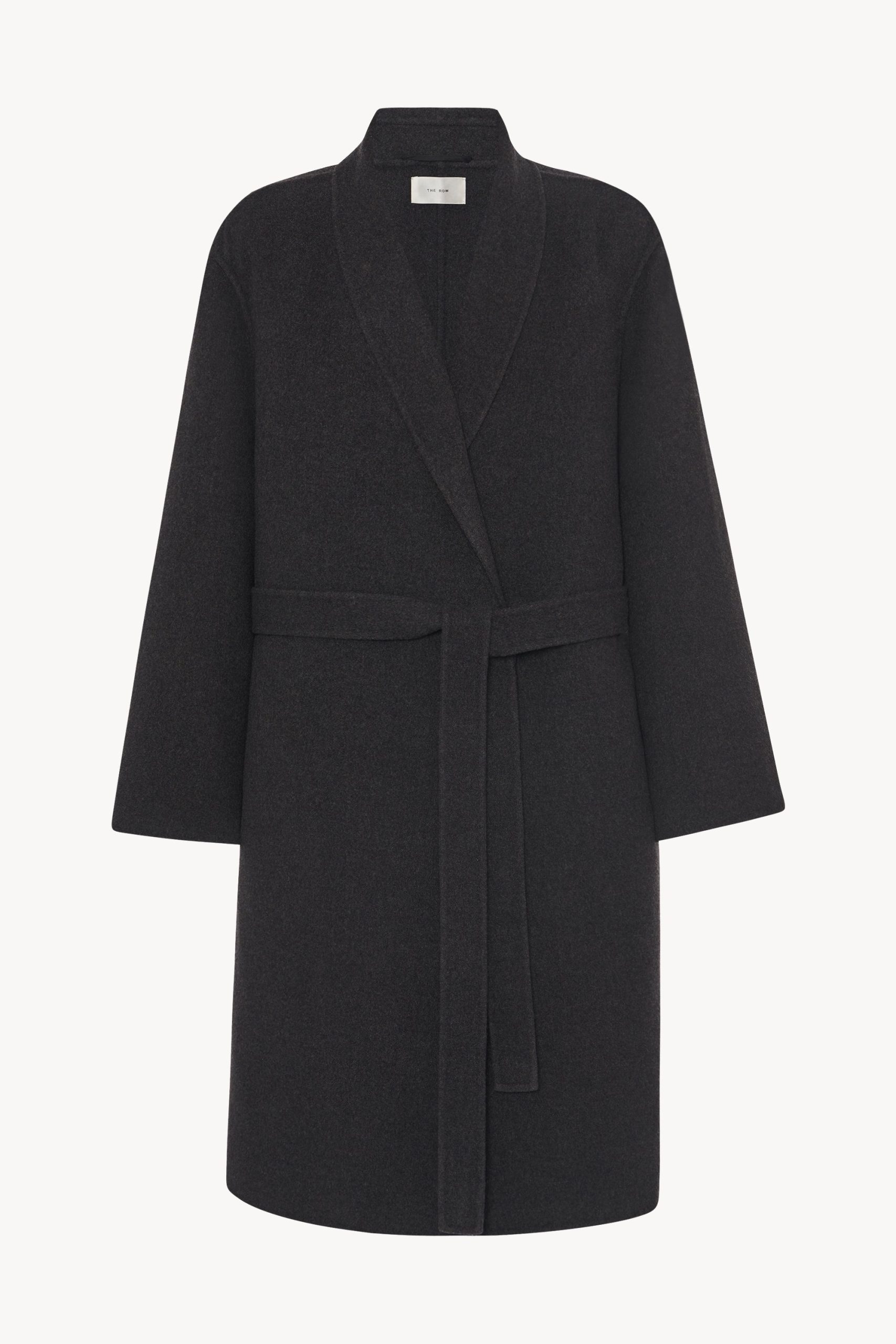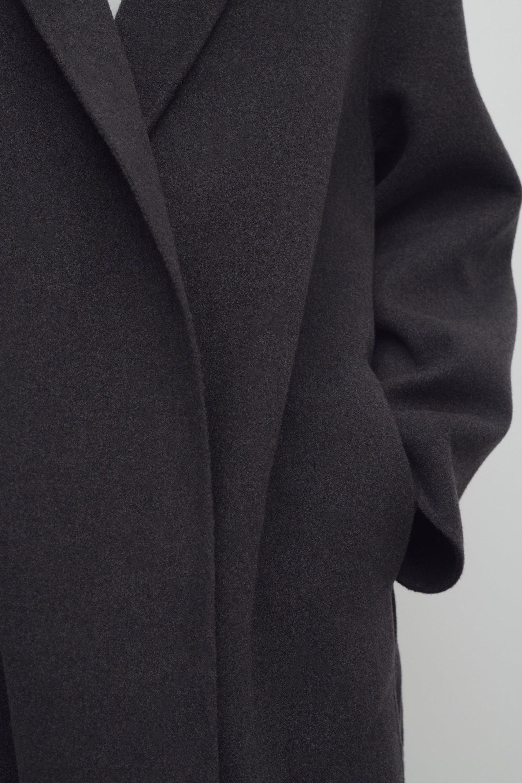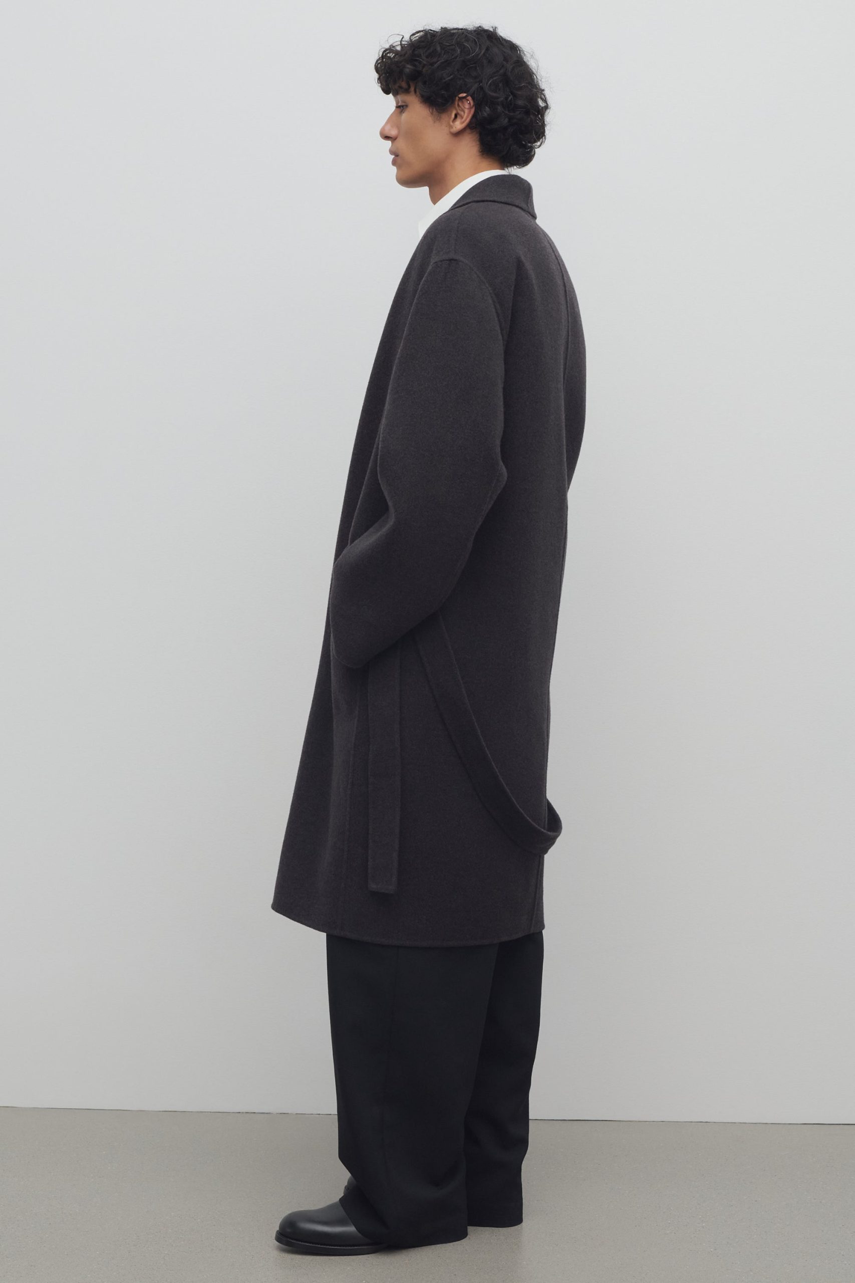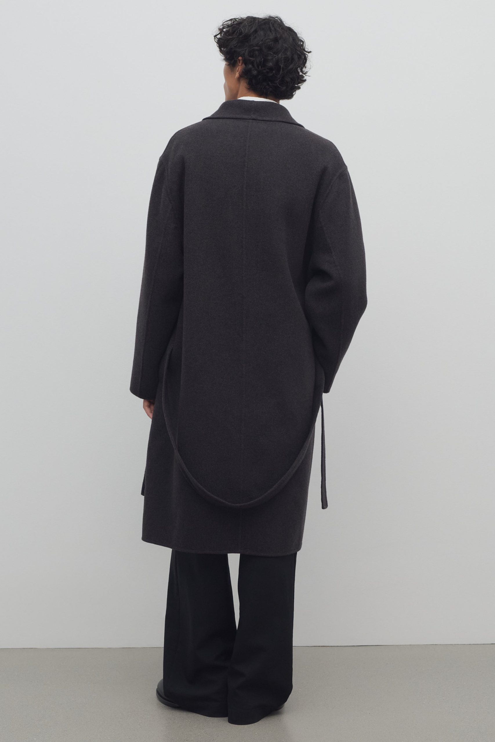 Double-breasted overcoat in double-faced felted cashmere with shawl collar. side seam pockets. and removable belt.