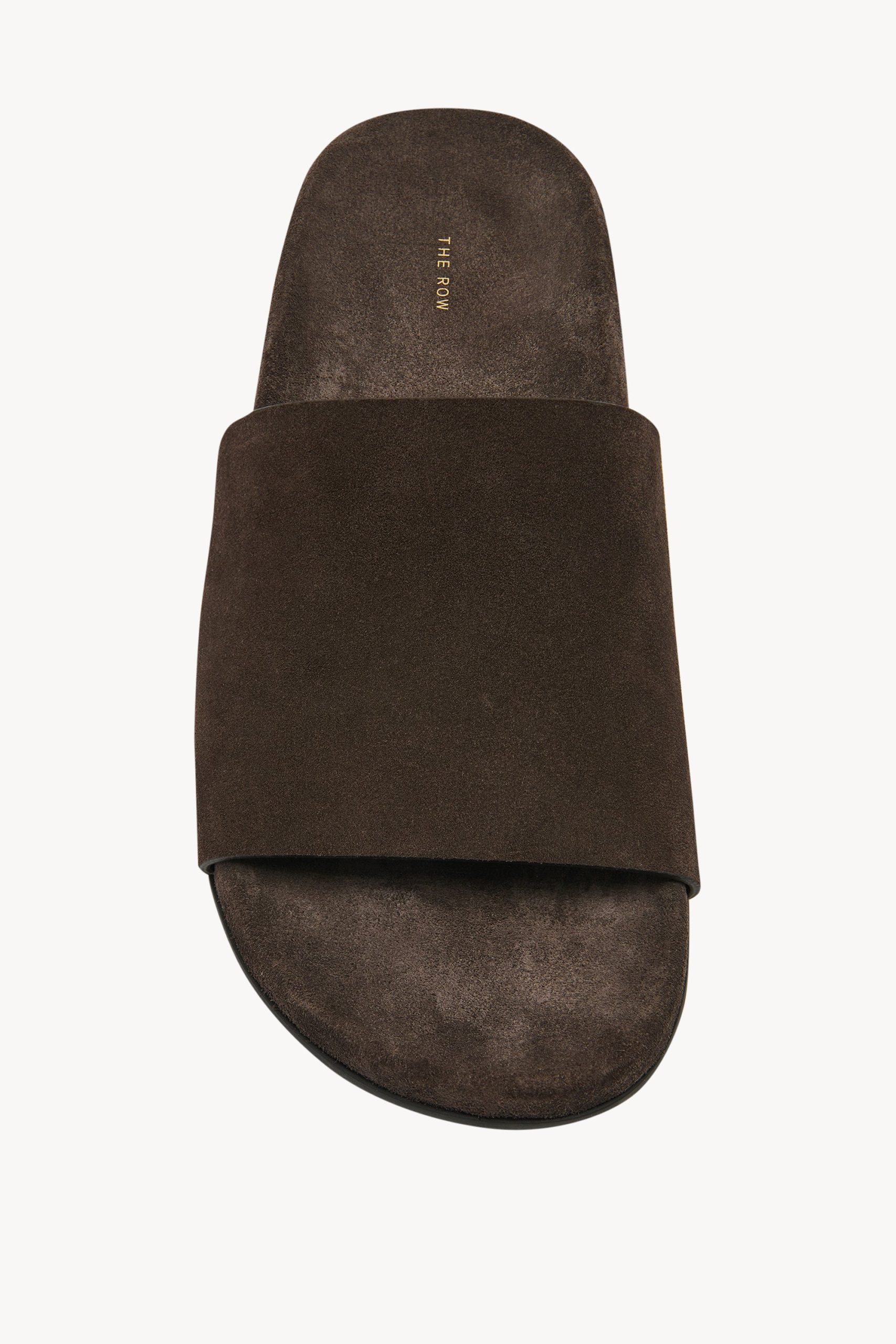 Flat slip-on sandal in soft calfskin suede with contoured footbed and rubber sole.