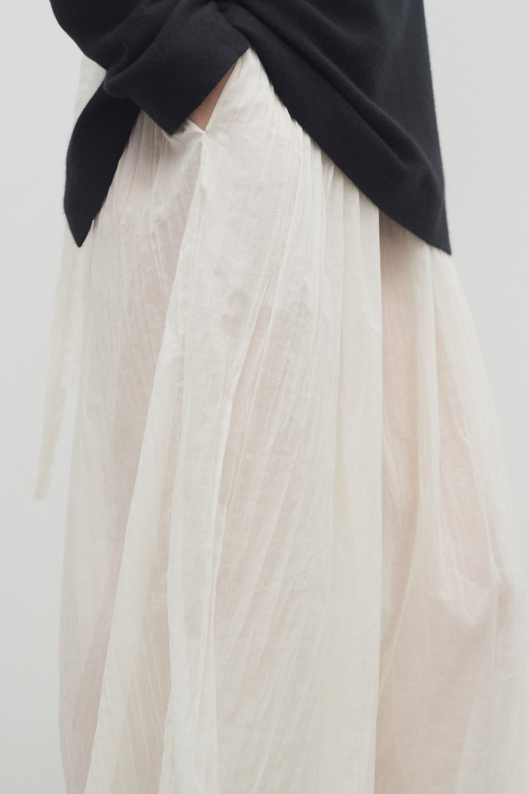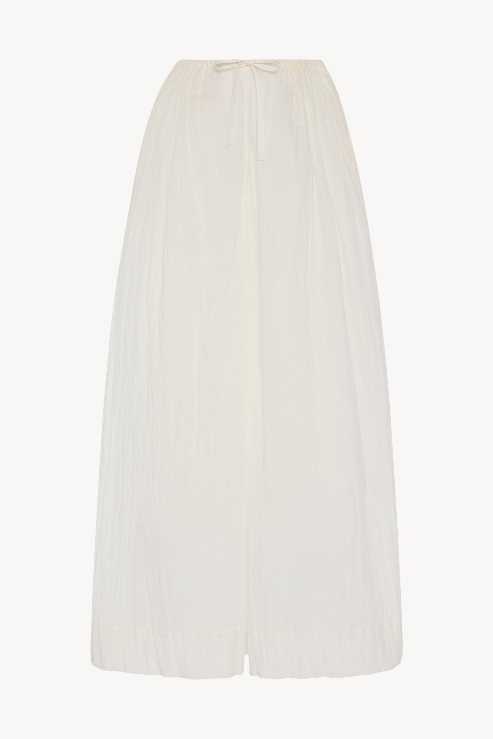 Wide-leg pajama pant in gauzy lightweight cotton with gathered drawstring waistband. side seam pockets. and French seam finish.
