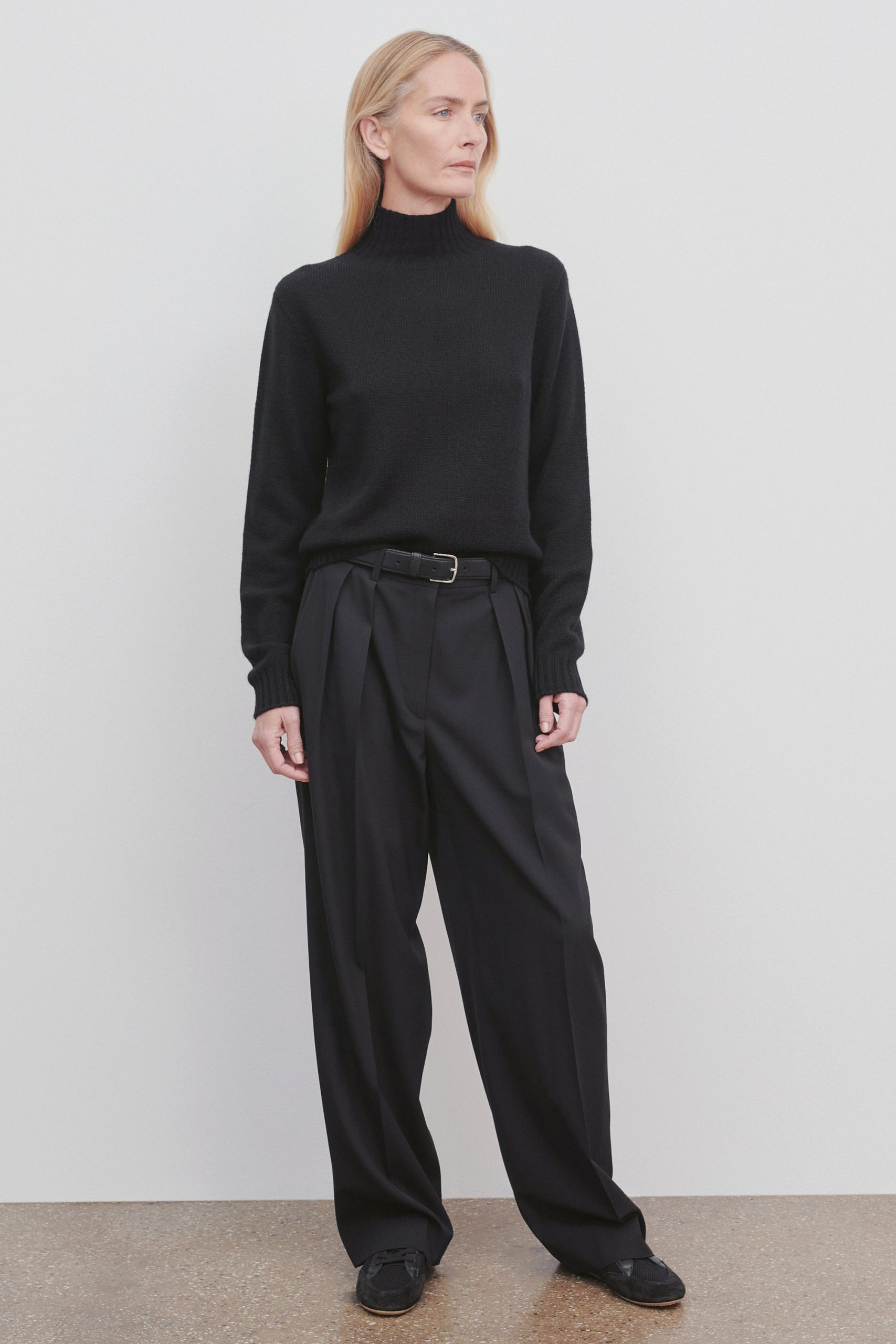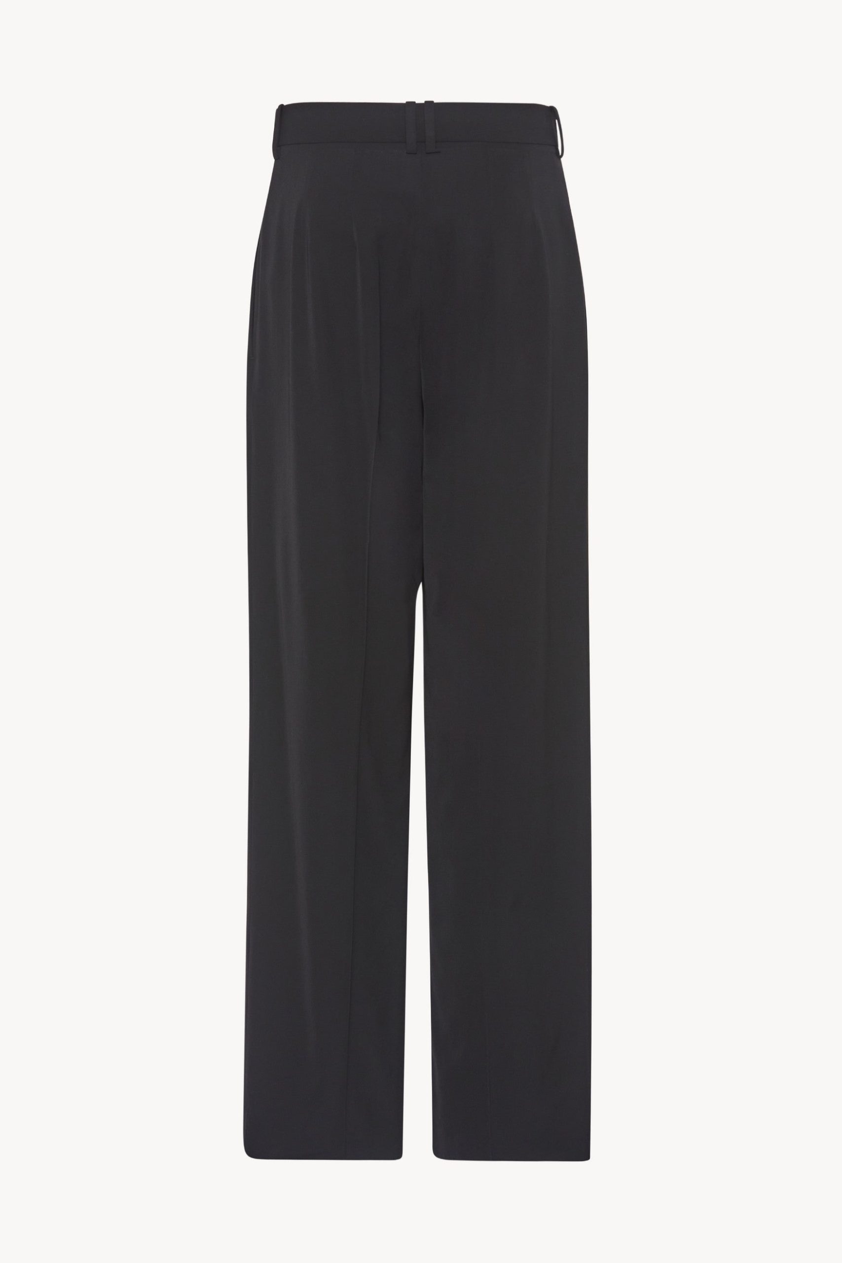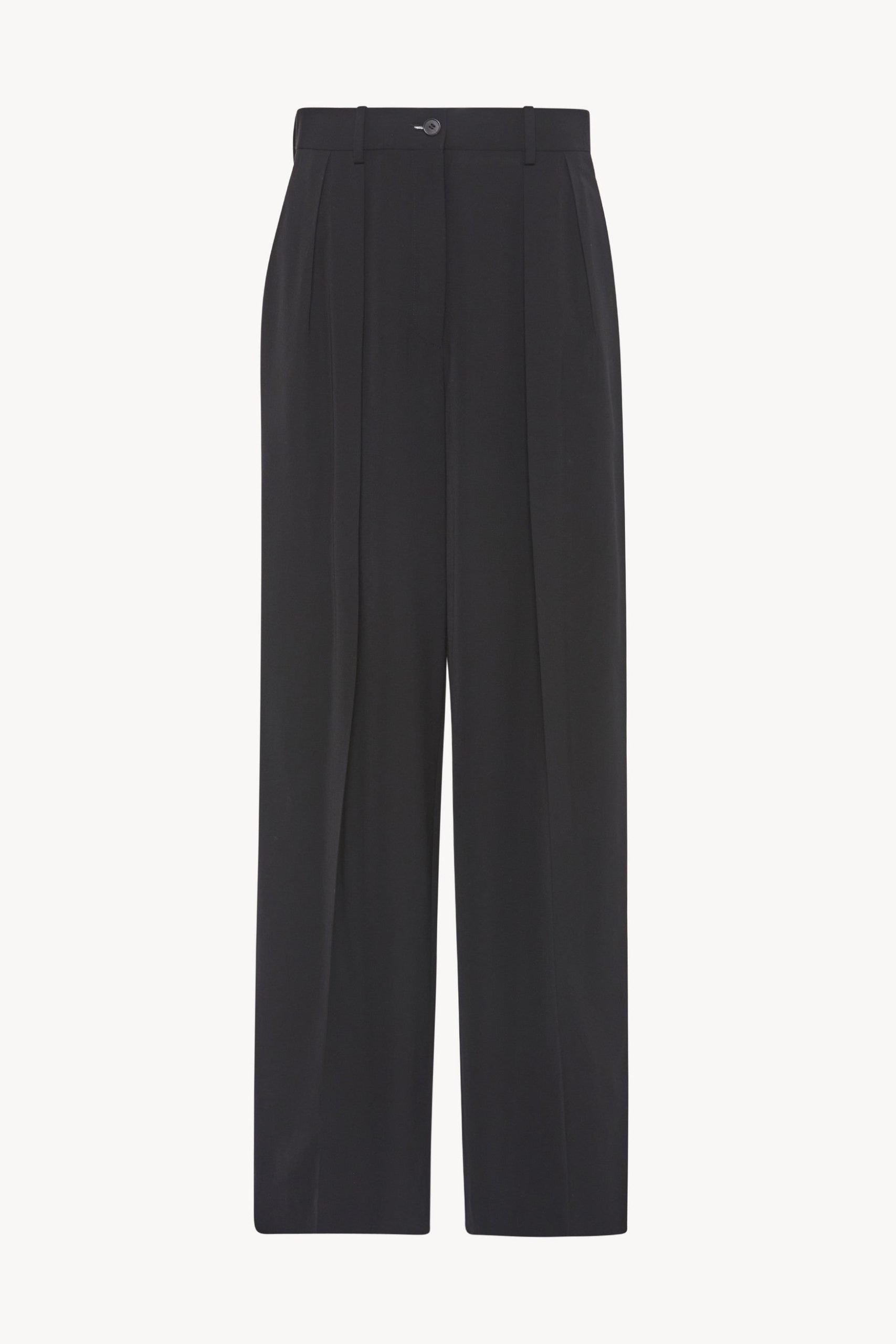 Low-waisted pant in lightweight viscose wool suiting with loose fluid leg. front double pleats and side slash pockets.