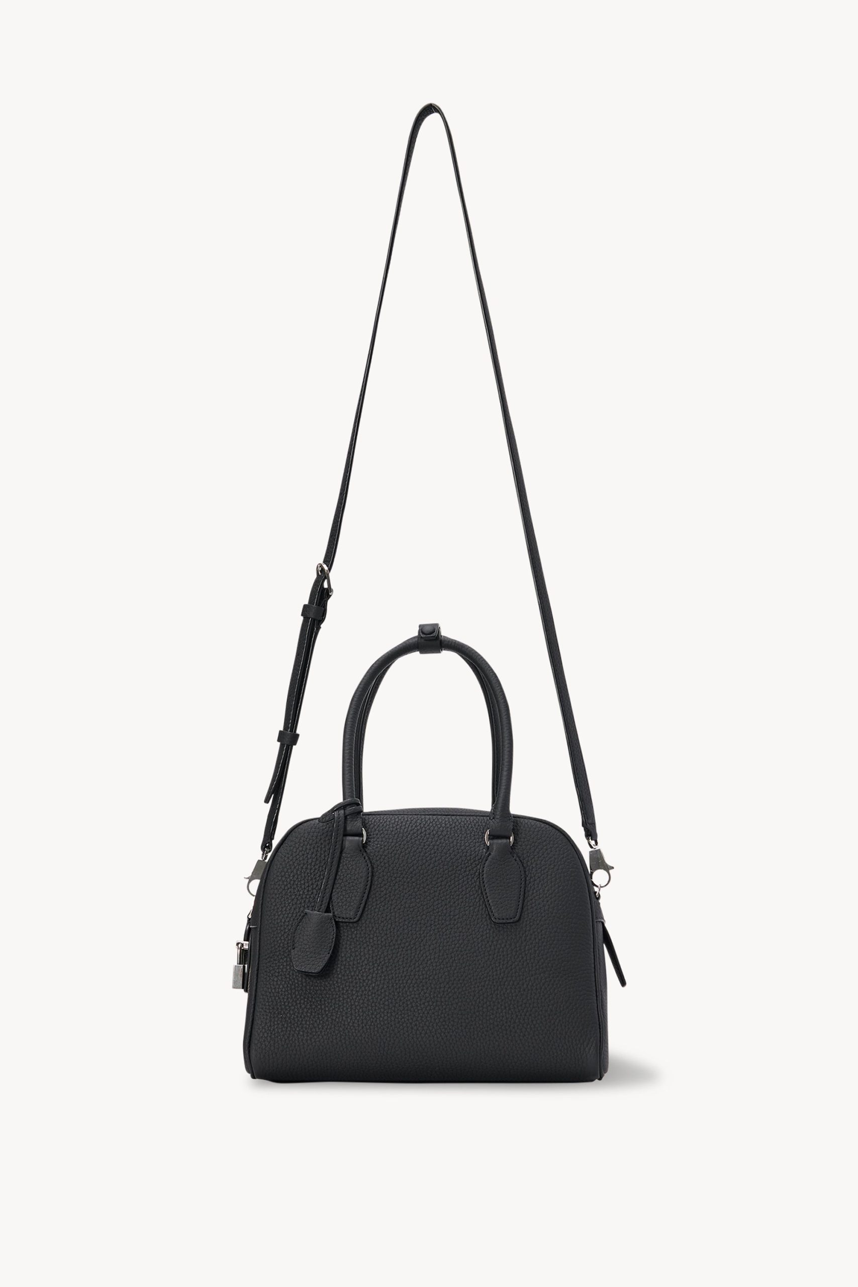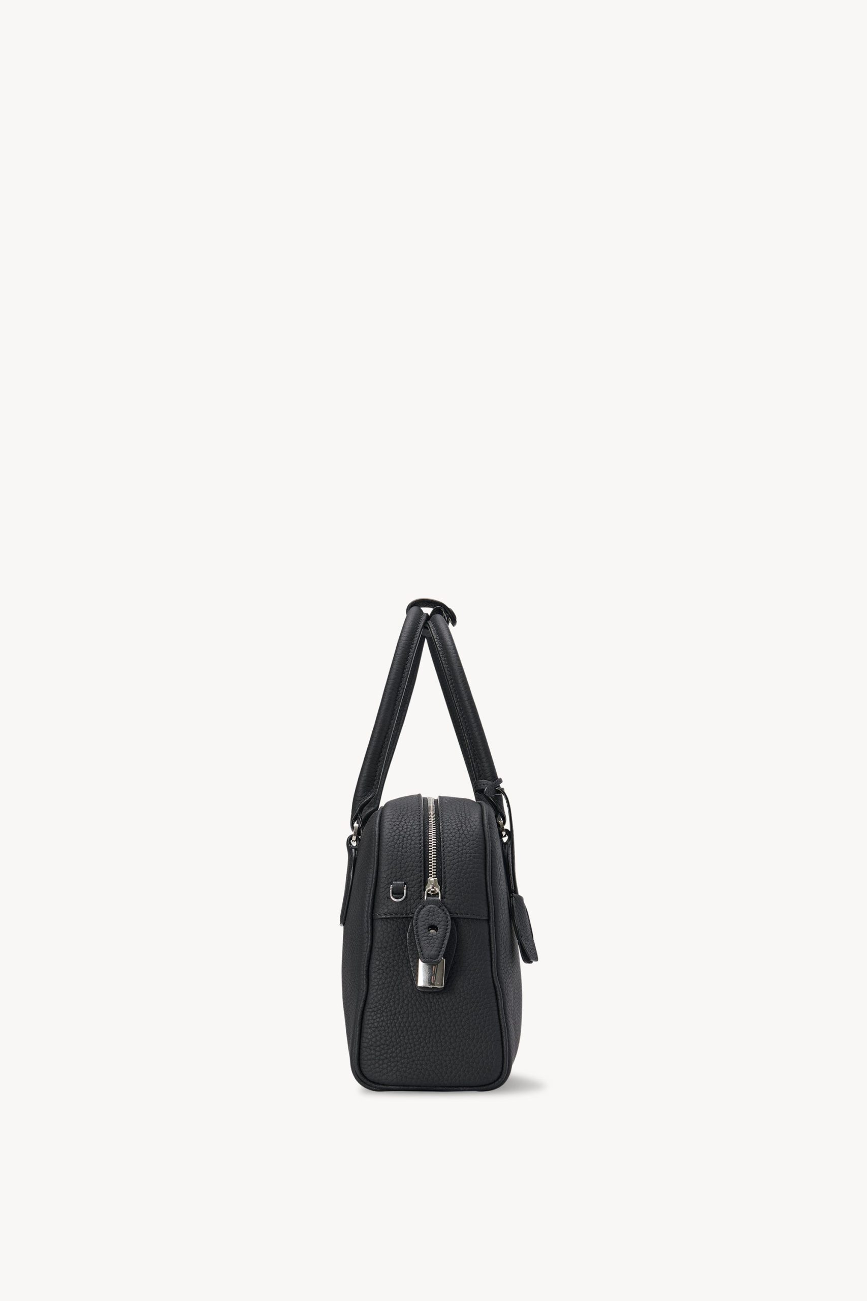 Updated bowling bag in textured calfskin leather with tubular handles. branded metal padlock and key. and zipper closure.