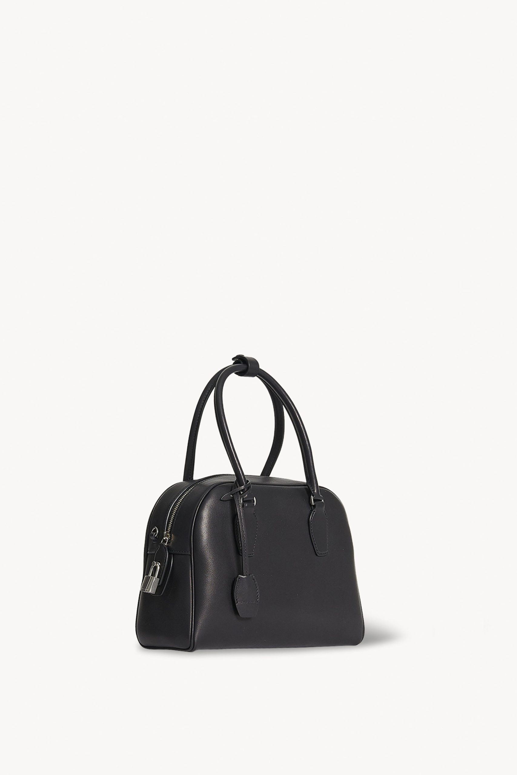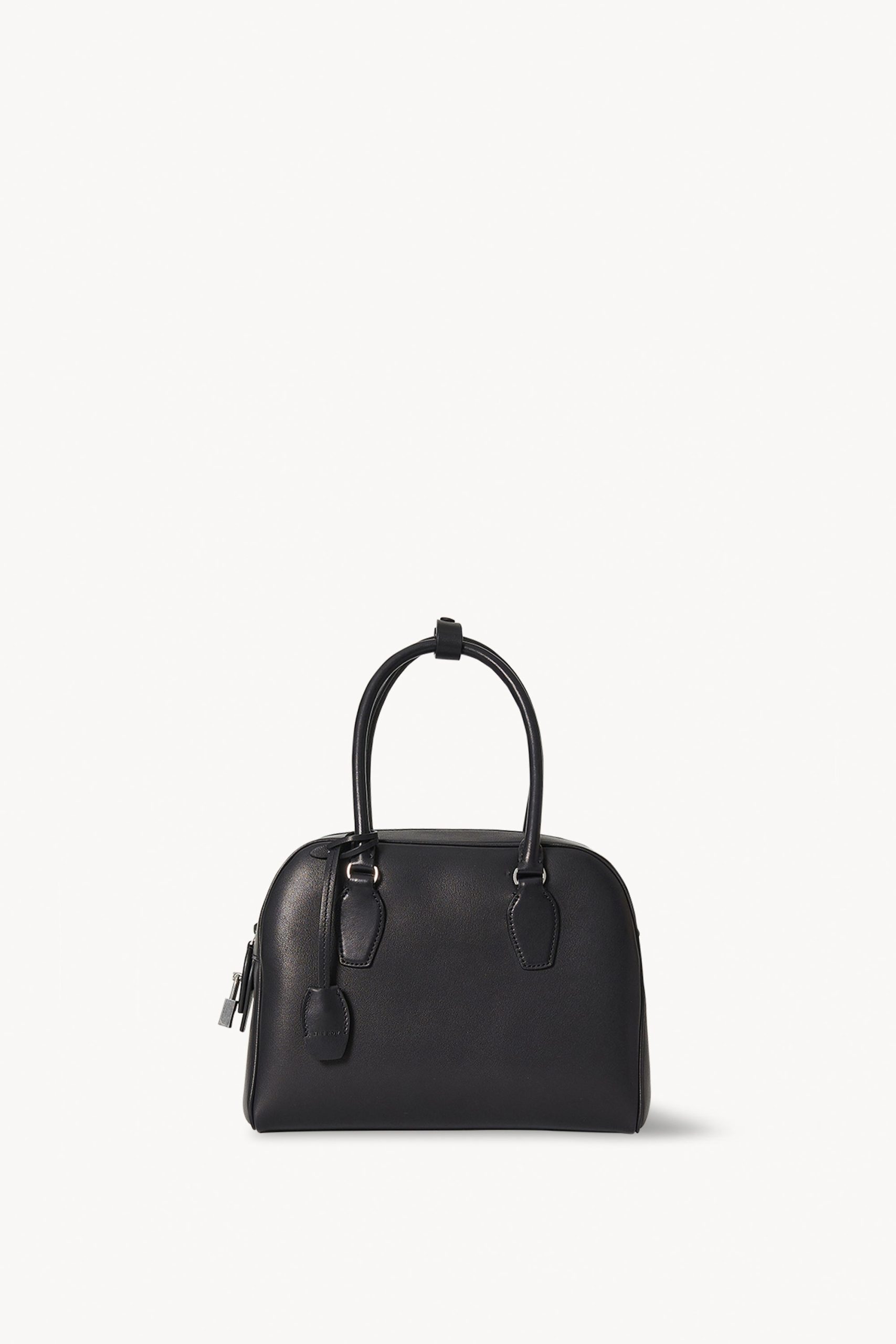 Updated bowling bag in polished saddle leather with tubular handles. branded metal padlock and key. and zipper closure.