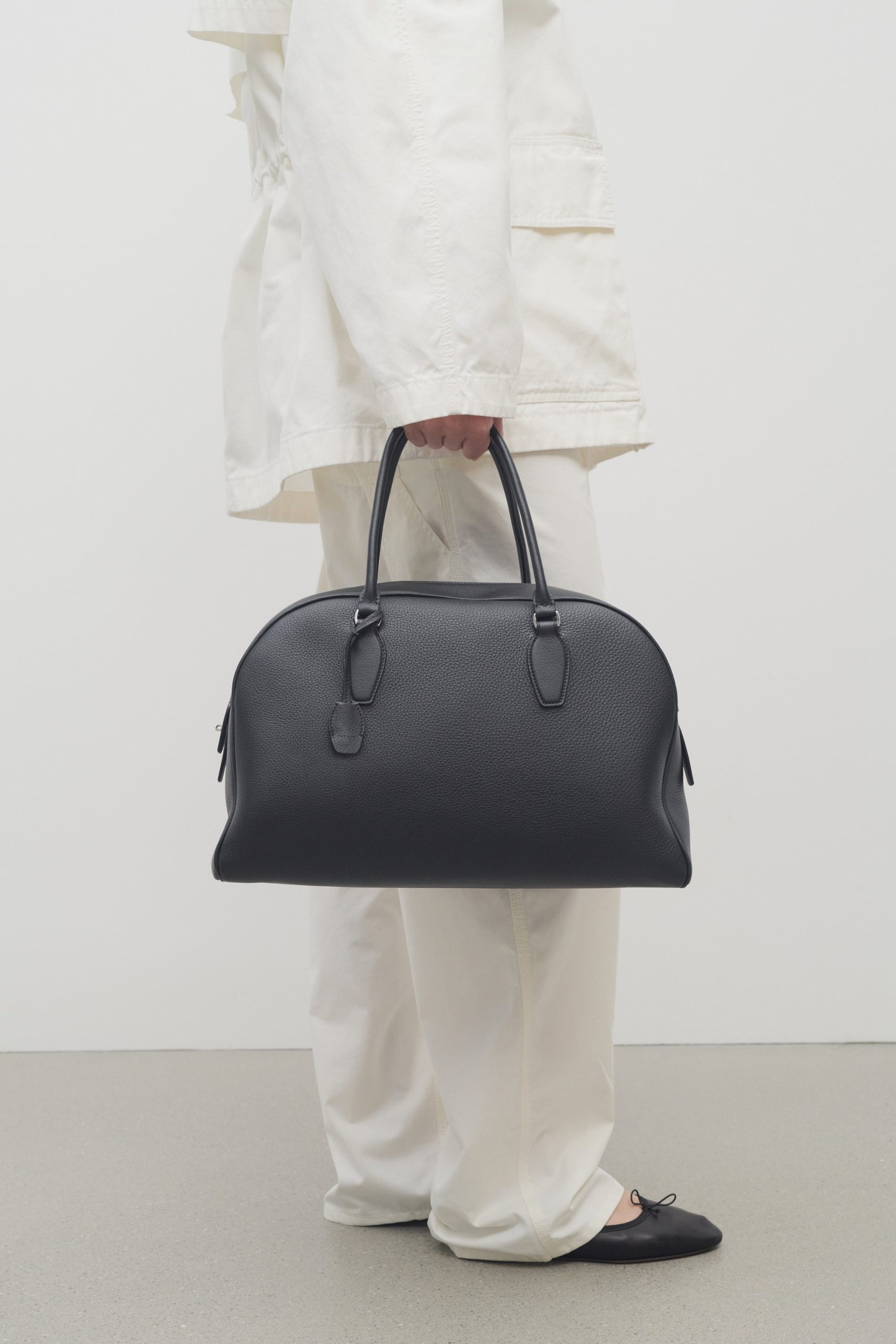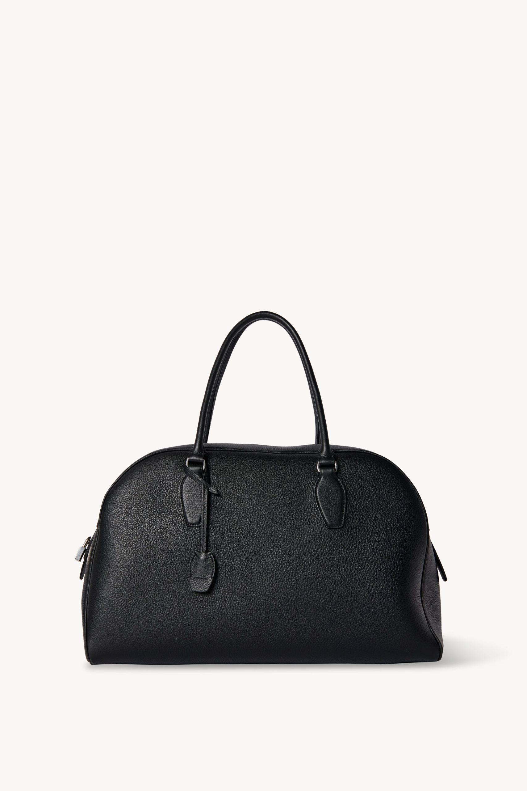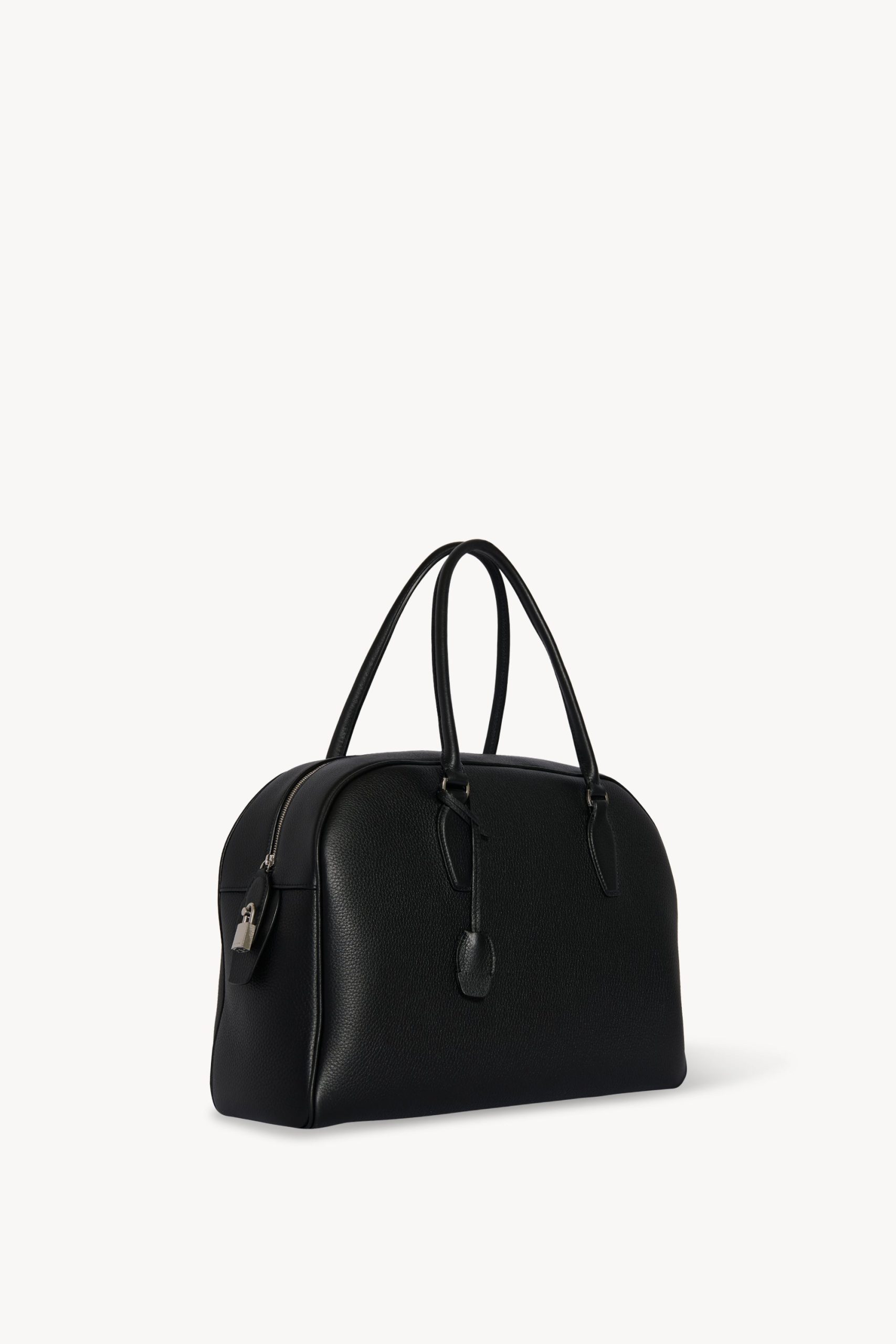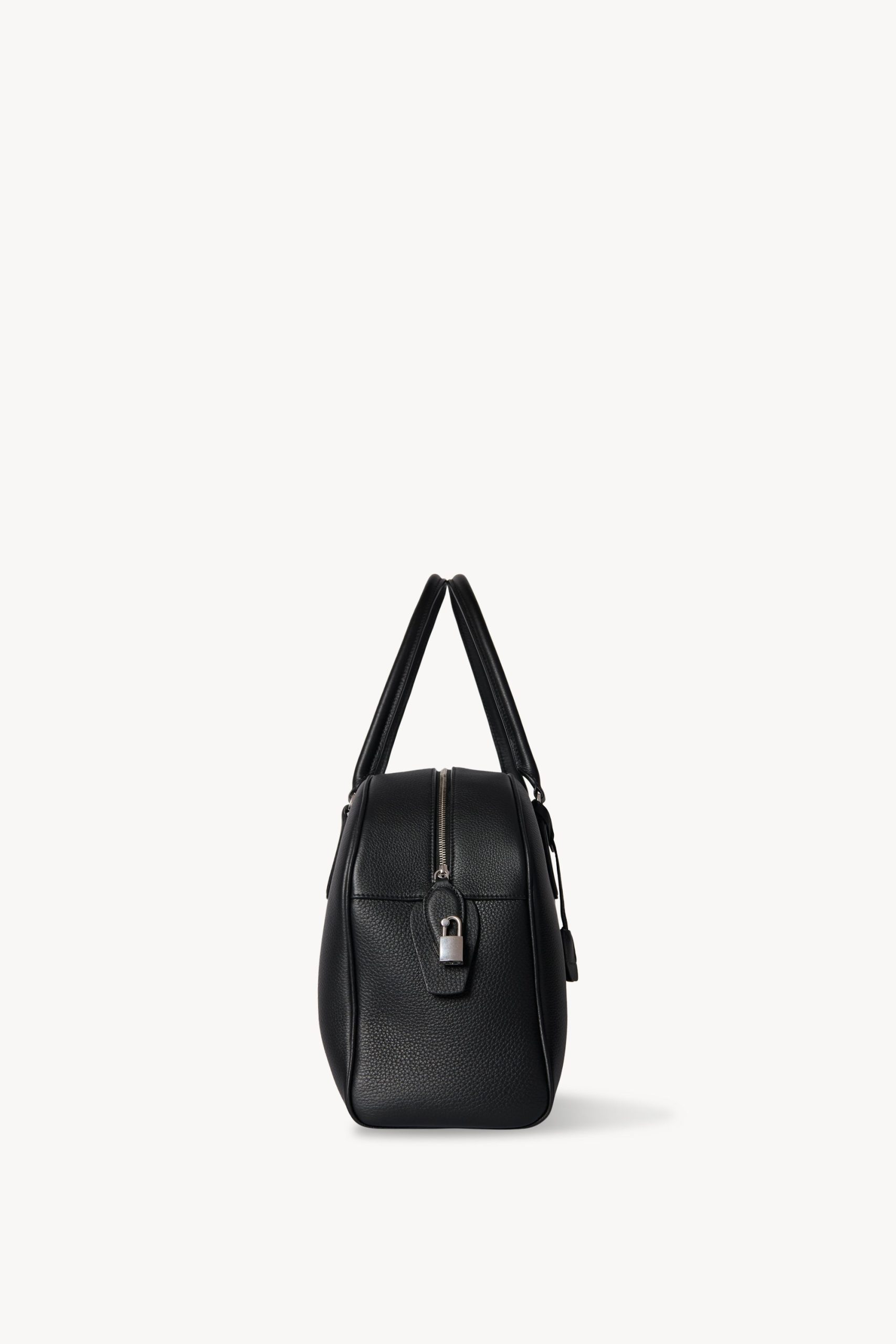 Updated bowling bag in textured calfskin leather with tubular handles. branded metal padlock and key. and zipper closure.
