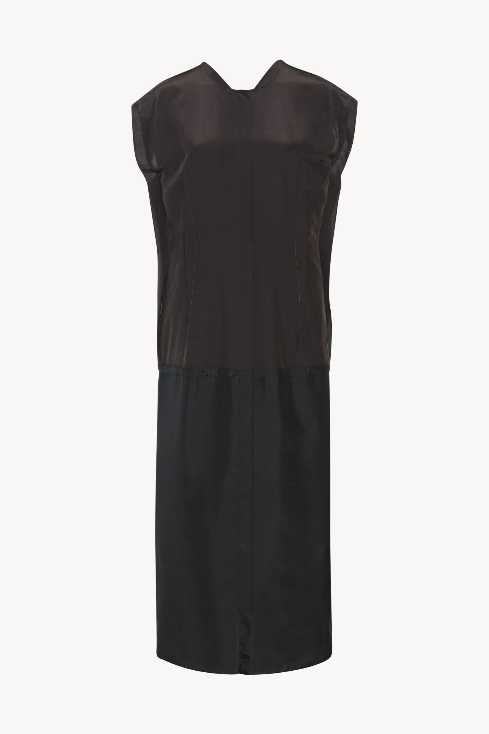 Calf-length shift dress in fluid silk viscose crepe de chine with paneled skirt. stitched front placket. and center back two-way zip closure.