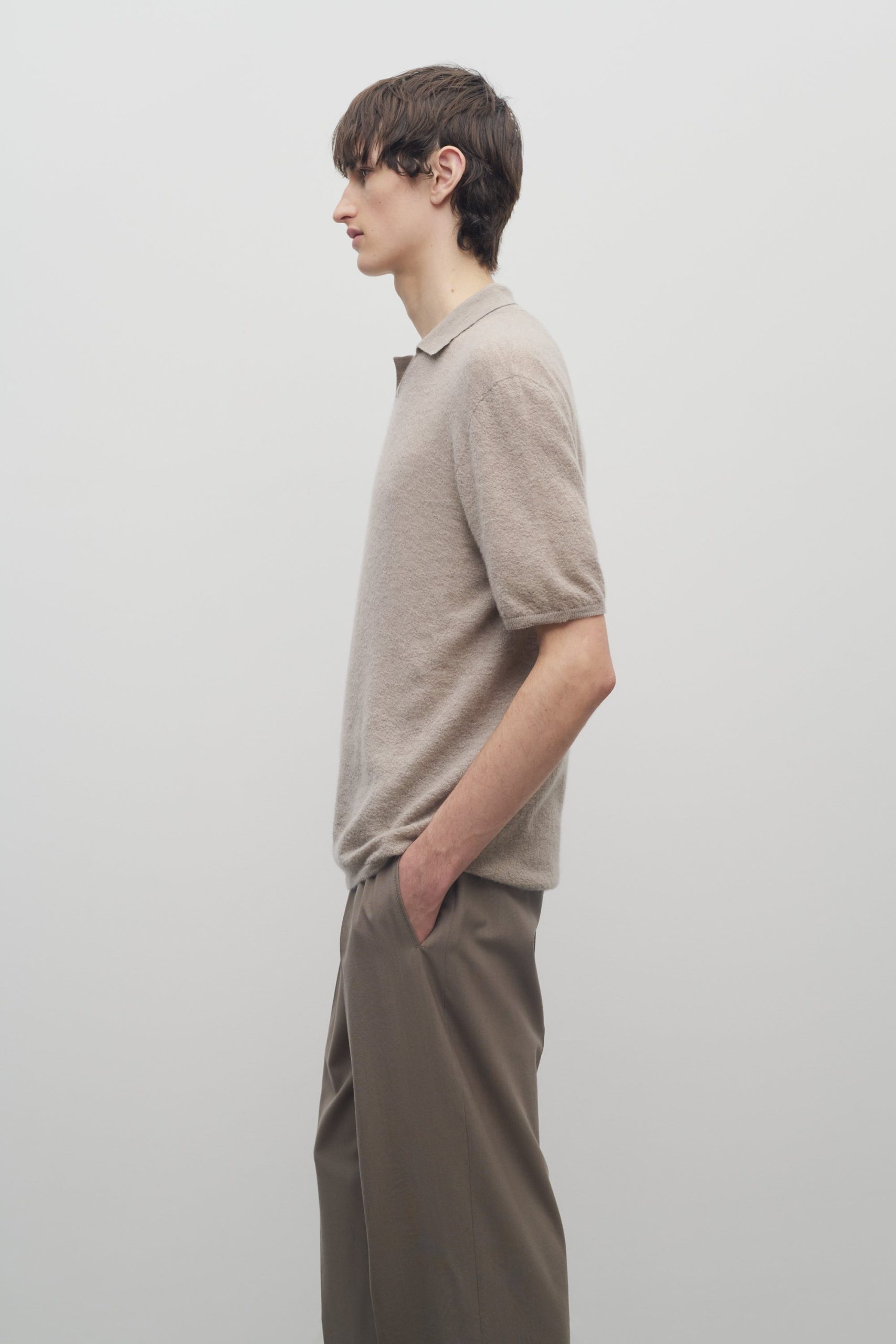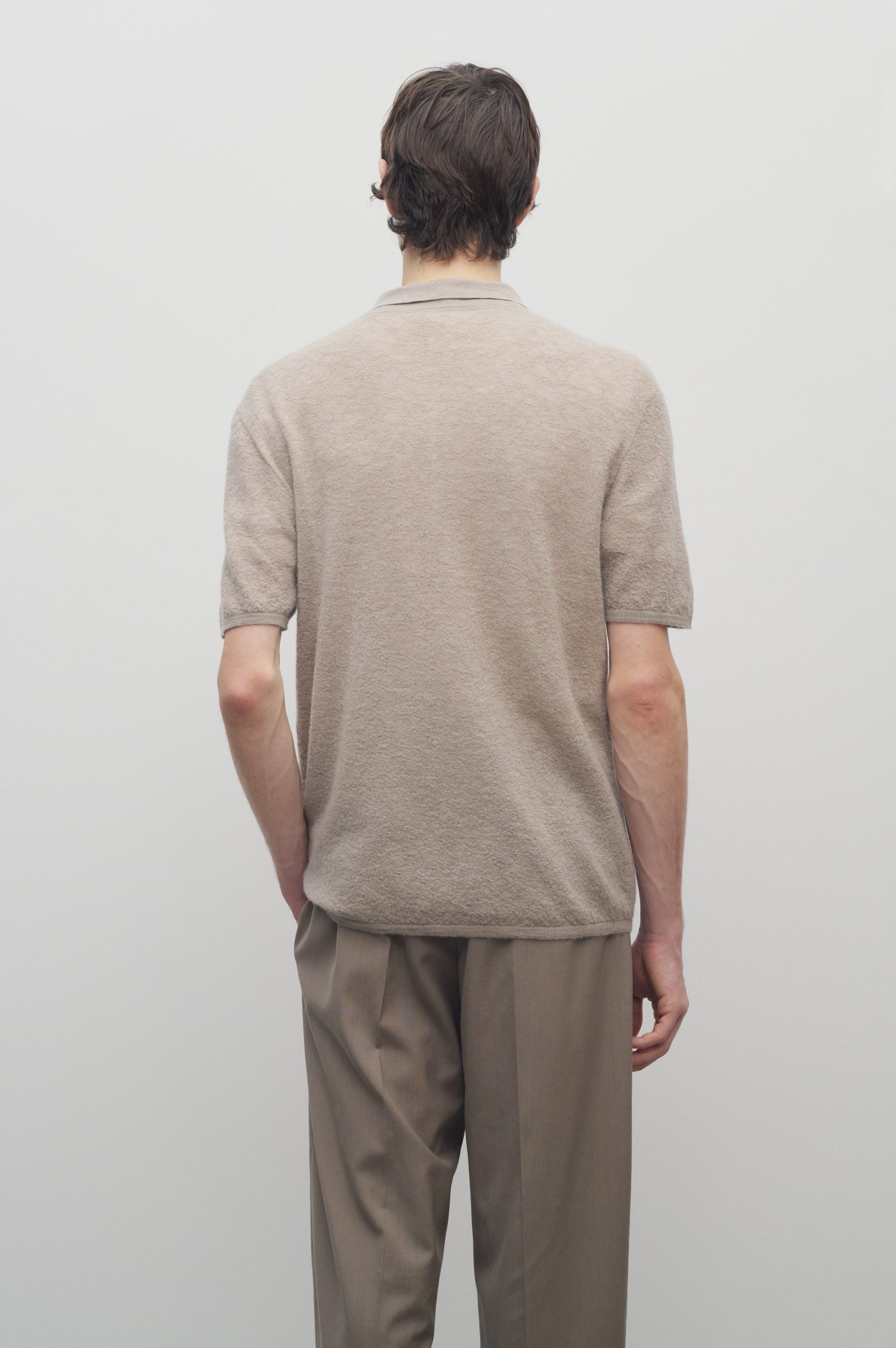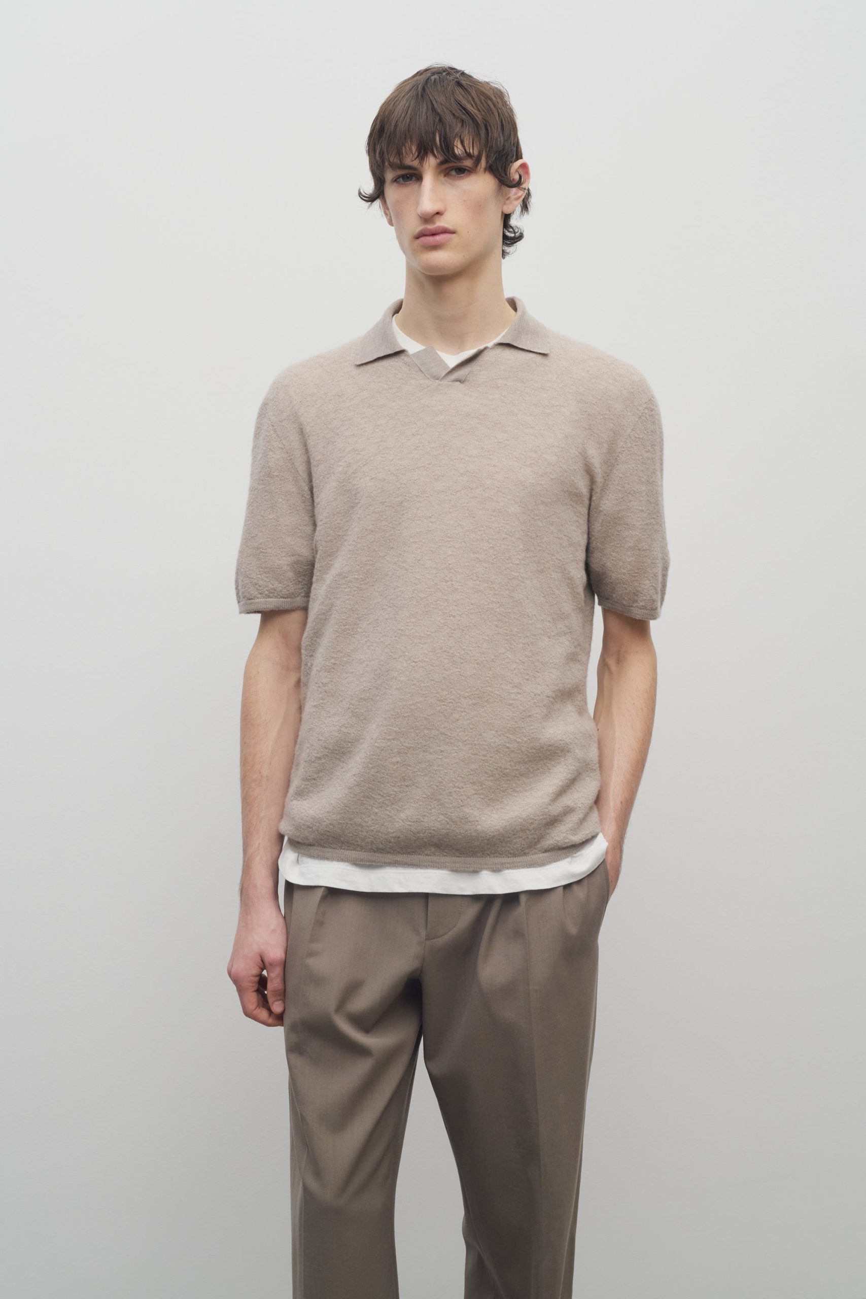 Short-sleeved polo top in fine lightweight cashmere with slim fit. open placket. and ribbed cuffs and hem.