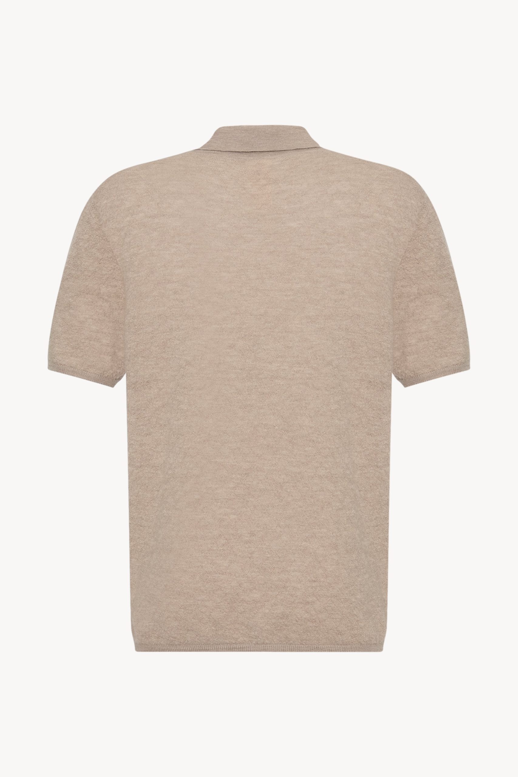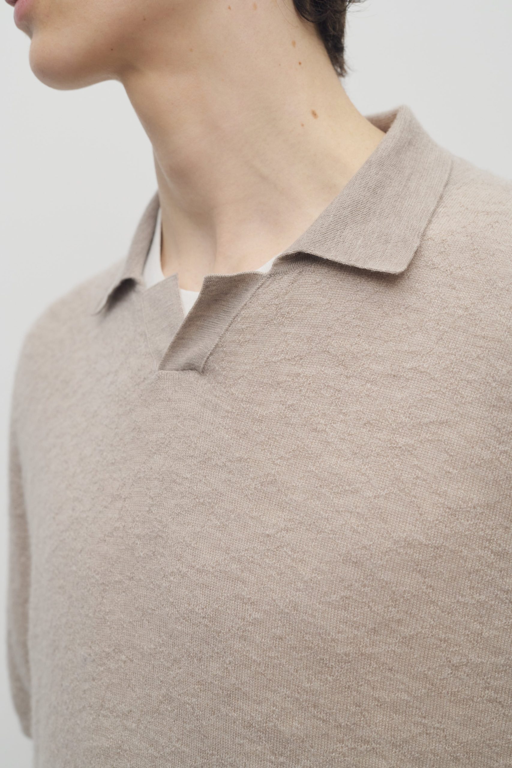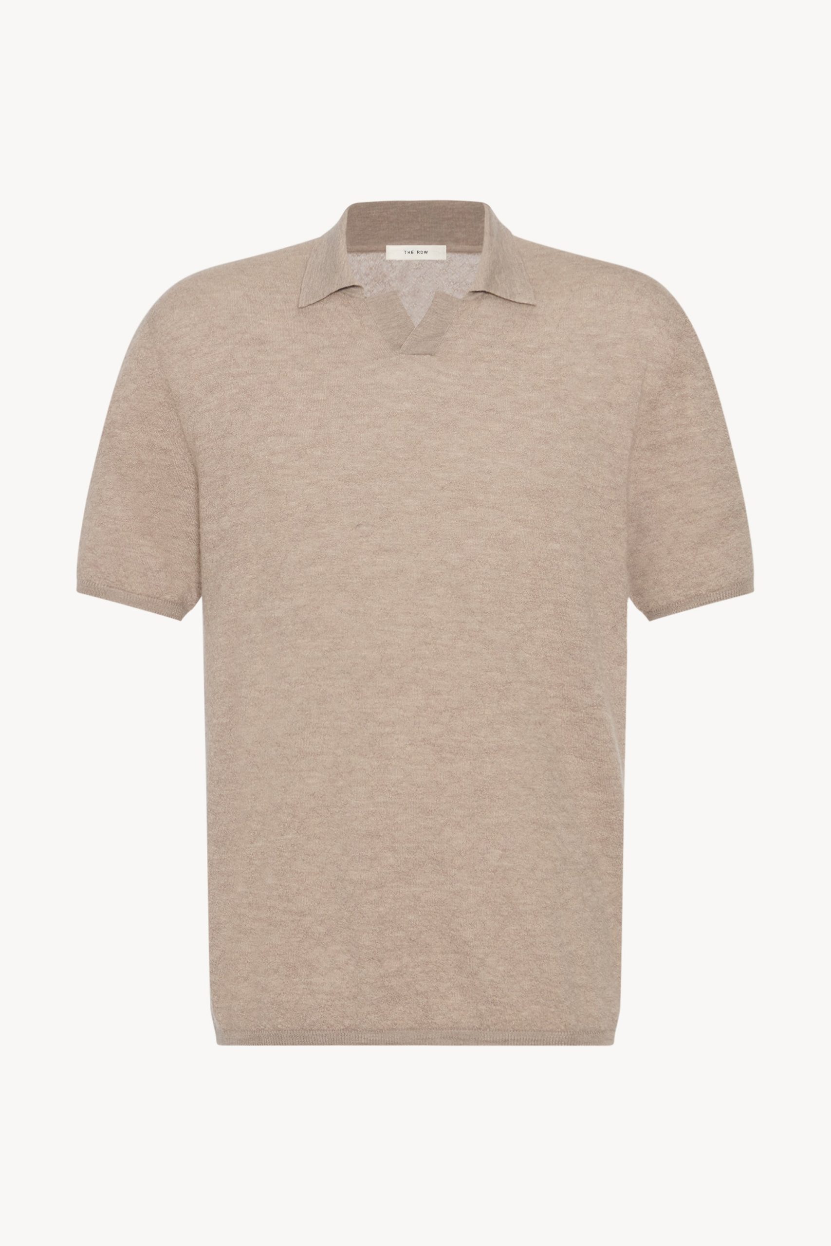 Short-sleeved polo top in fine lightweight cashmere with slim fit. open placket. and ribbed cuffs and hem.