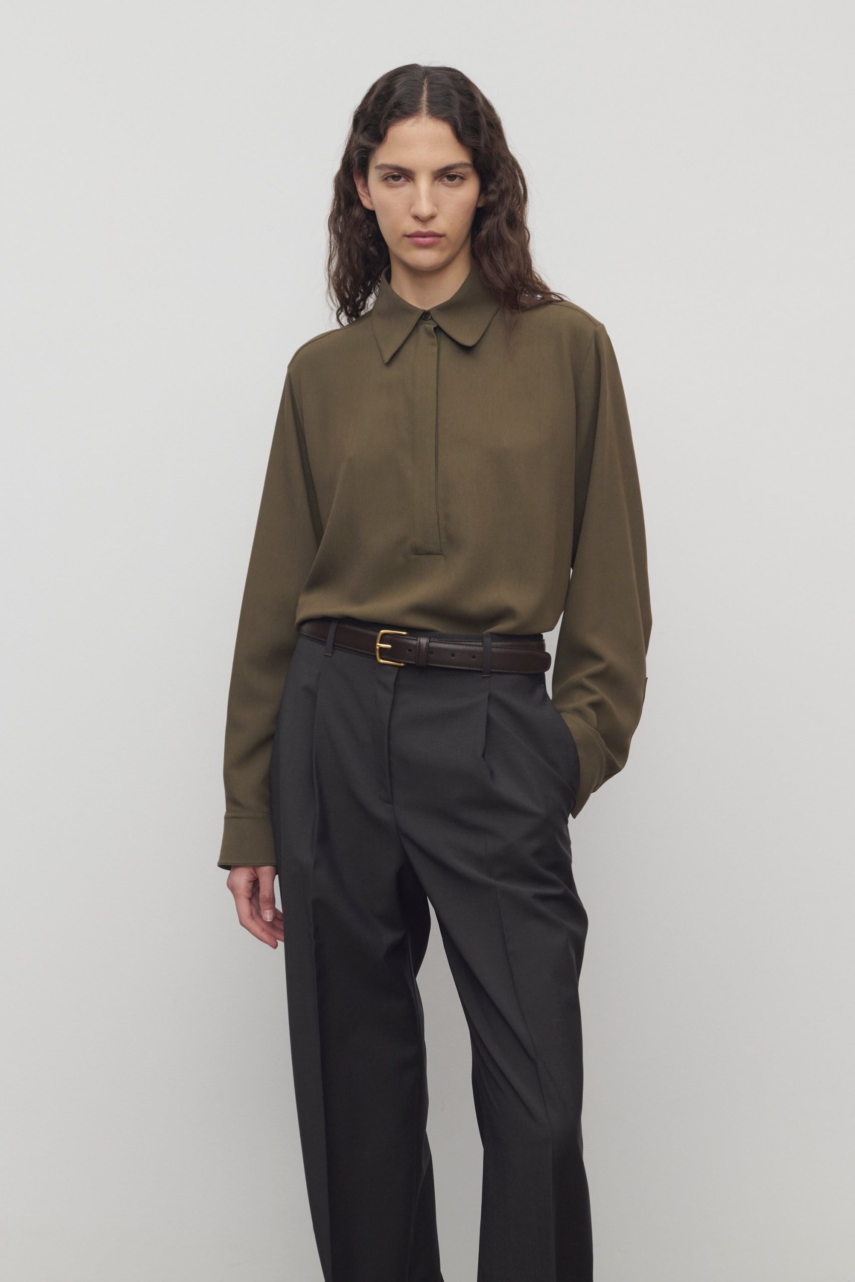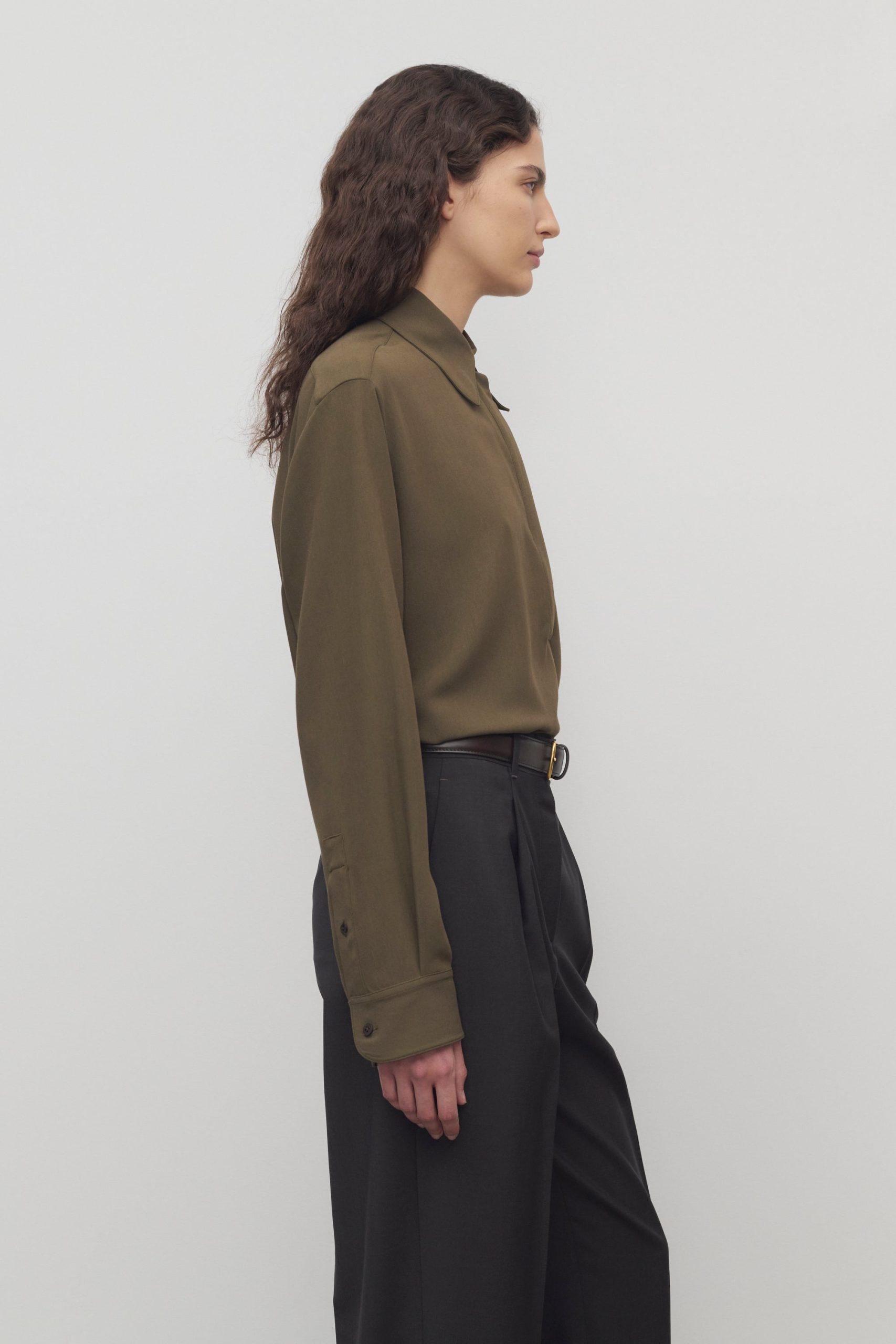 Oversized collared shirt in lightweight silk crepe with curved. layered hem. overlayer with metal zip closure. and concealed front placket at underlayer with mother-of-pearl buttons.