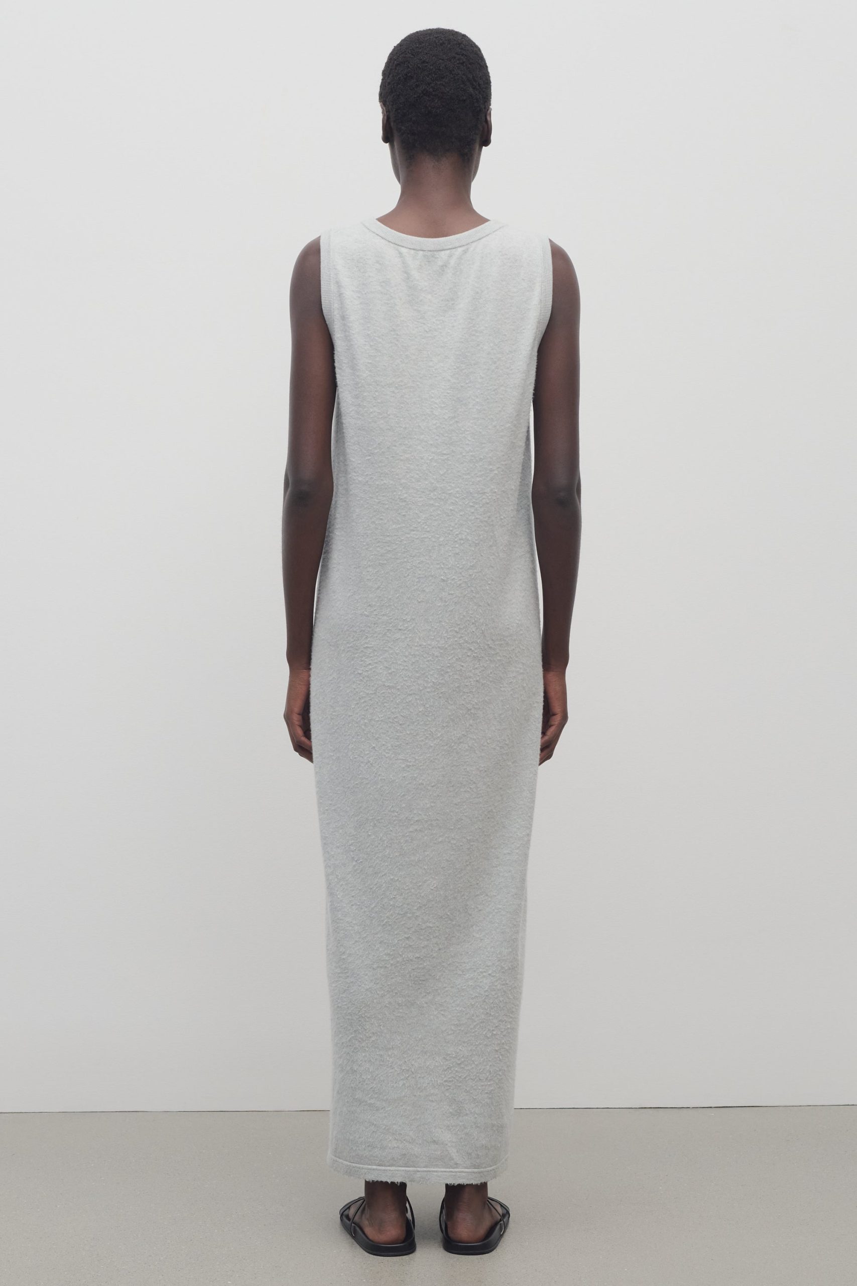 Relaxed ankle-length tank dress in softly brushed fine cotton with ribbed armholes and neckline. and straight fit.
