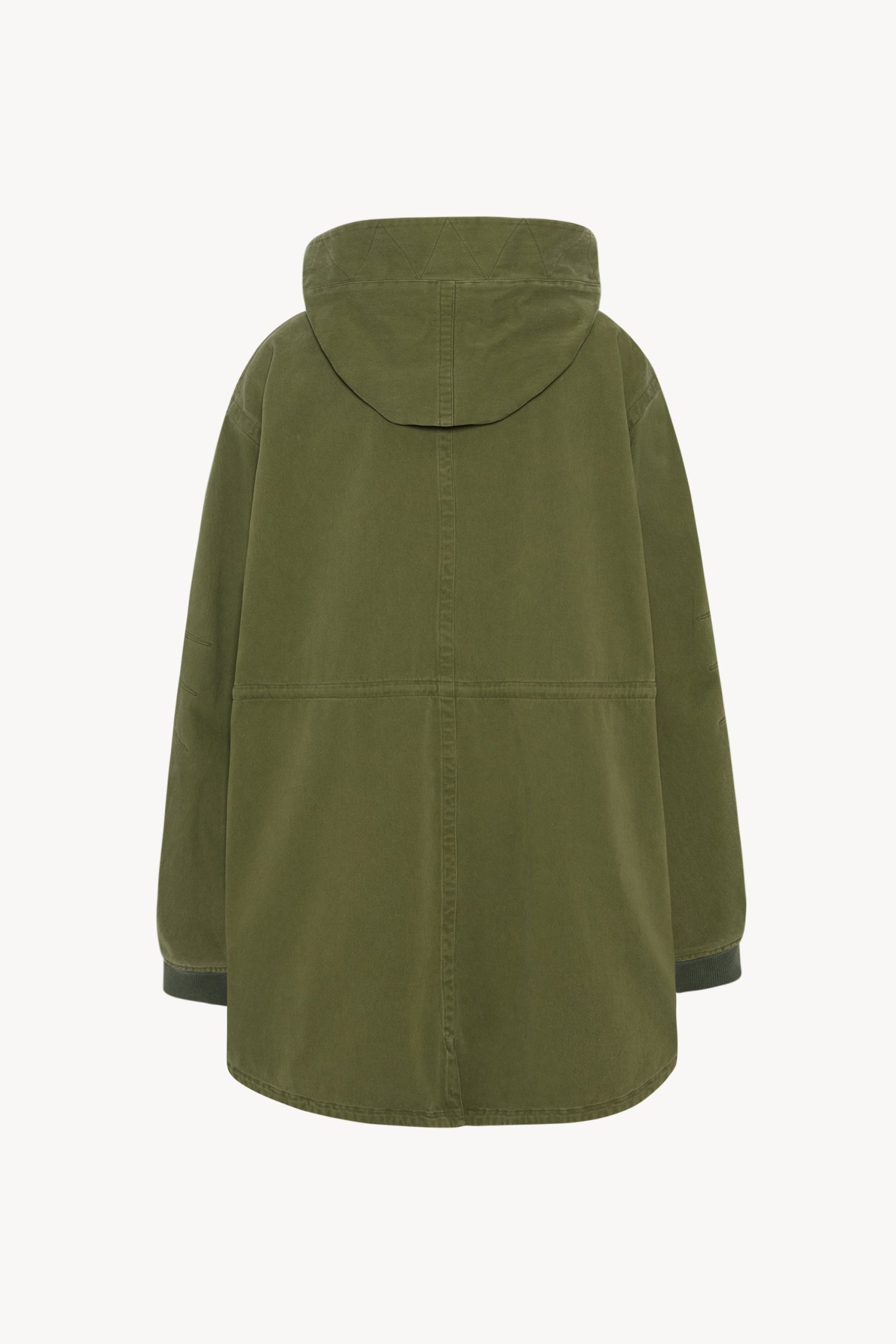 Relaxed hooded parka in durable washed cotton with ribbed cuffs. front flap pockets. and concealed front placket with snap and zipper closure.