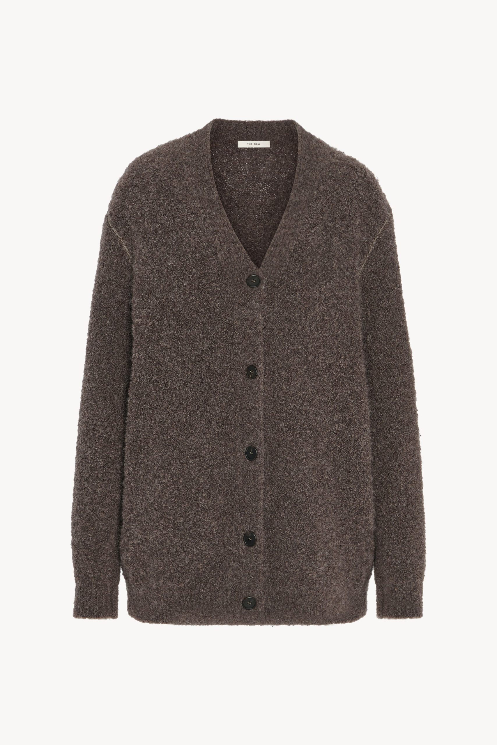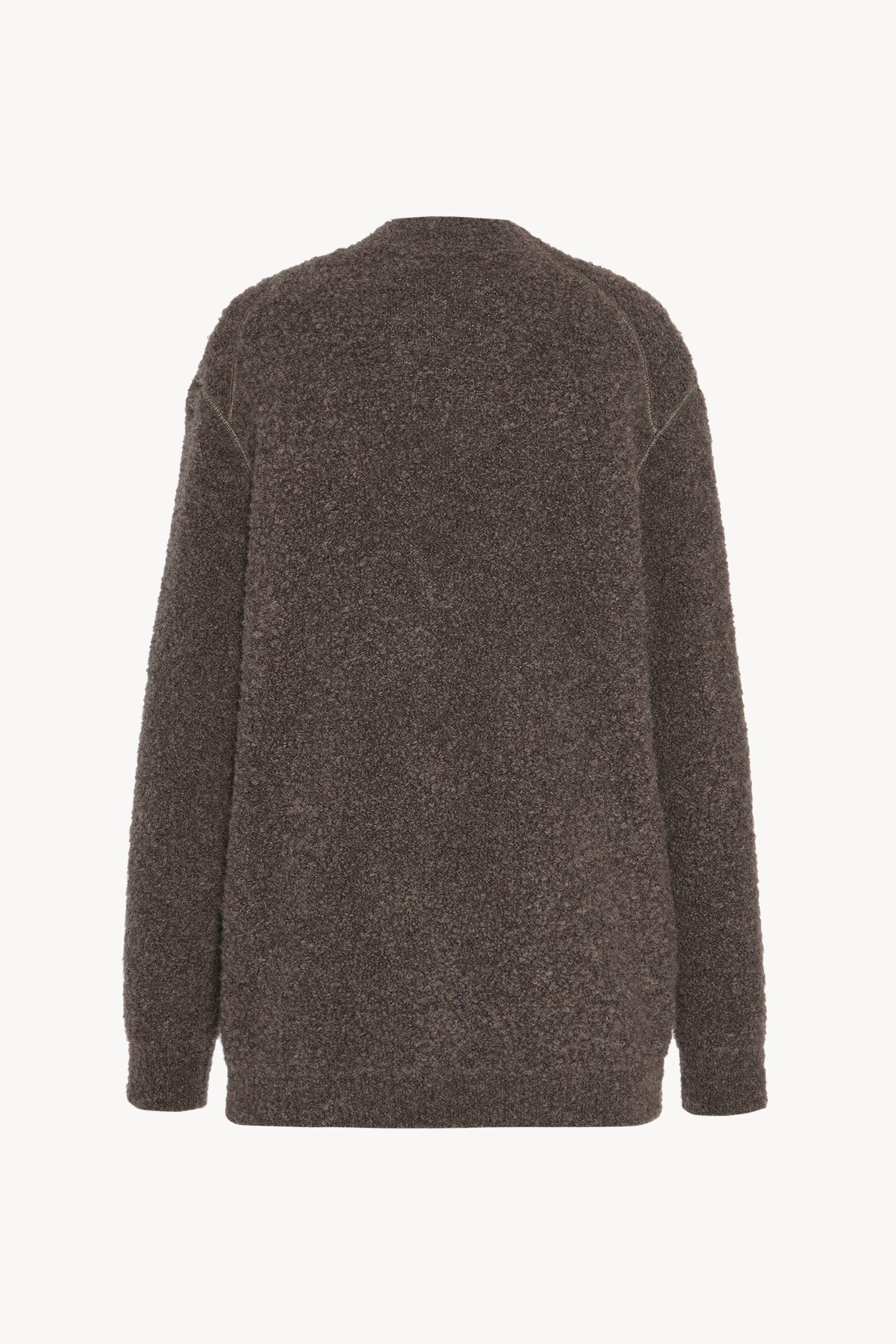Oversized v-neck cardigan in textured alpaca and cashmere bouclé with topstitched armholes. front button closure. and ribbed cuffs and hem.