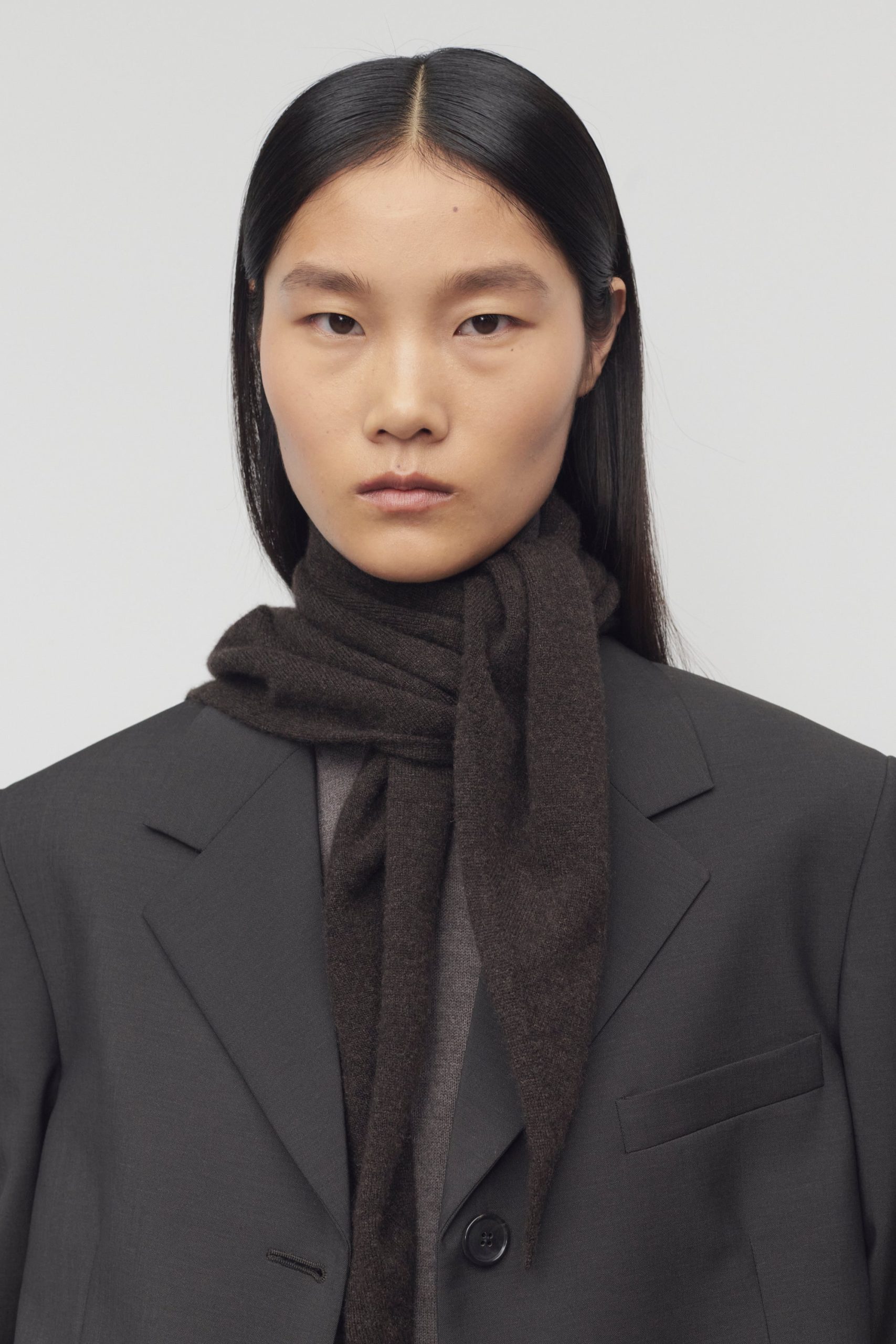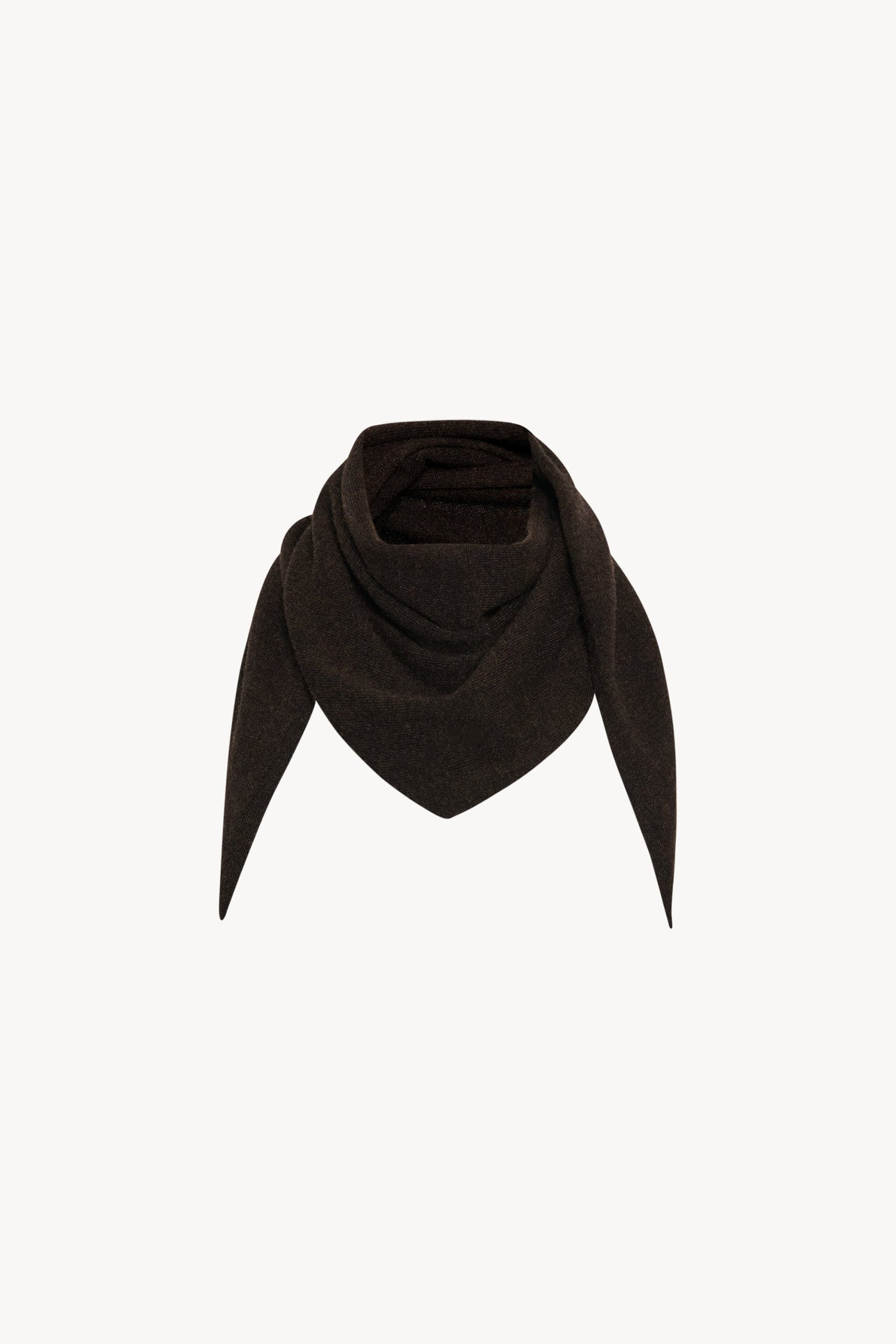 Triangular knit scarf in soft cashmere with clean edge finish.